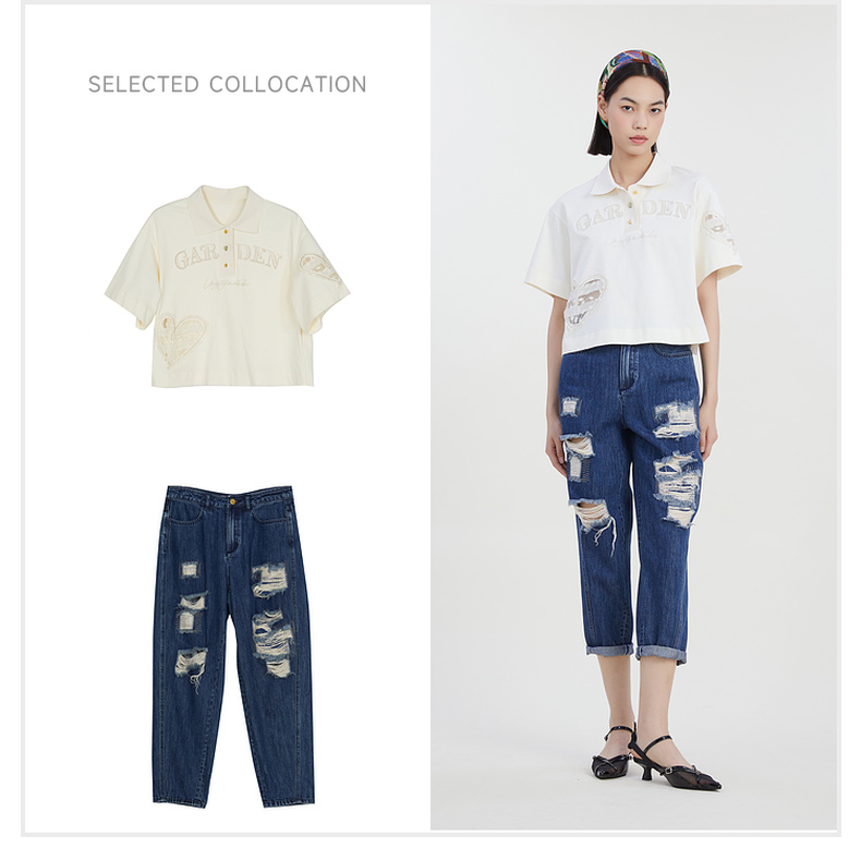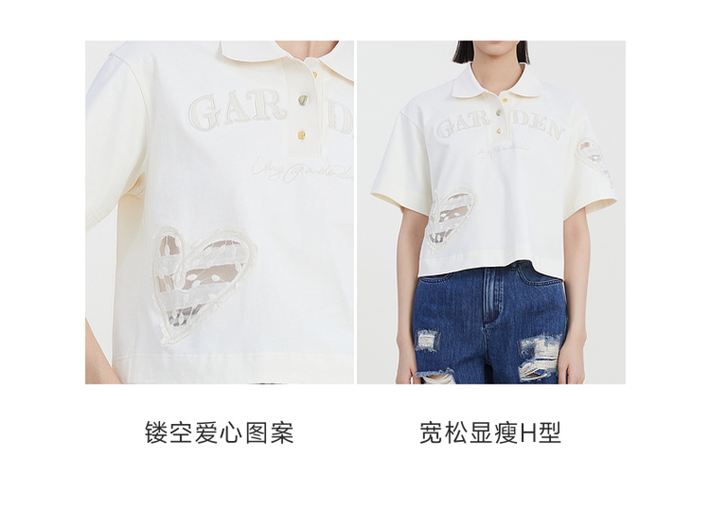 谜底POLO领短款T恤短袖女2023夏季新款学院风贴布绣上衣232MT0604