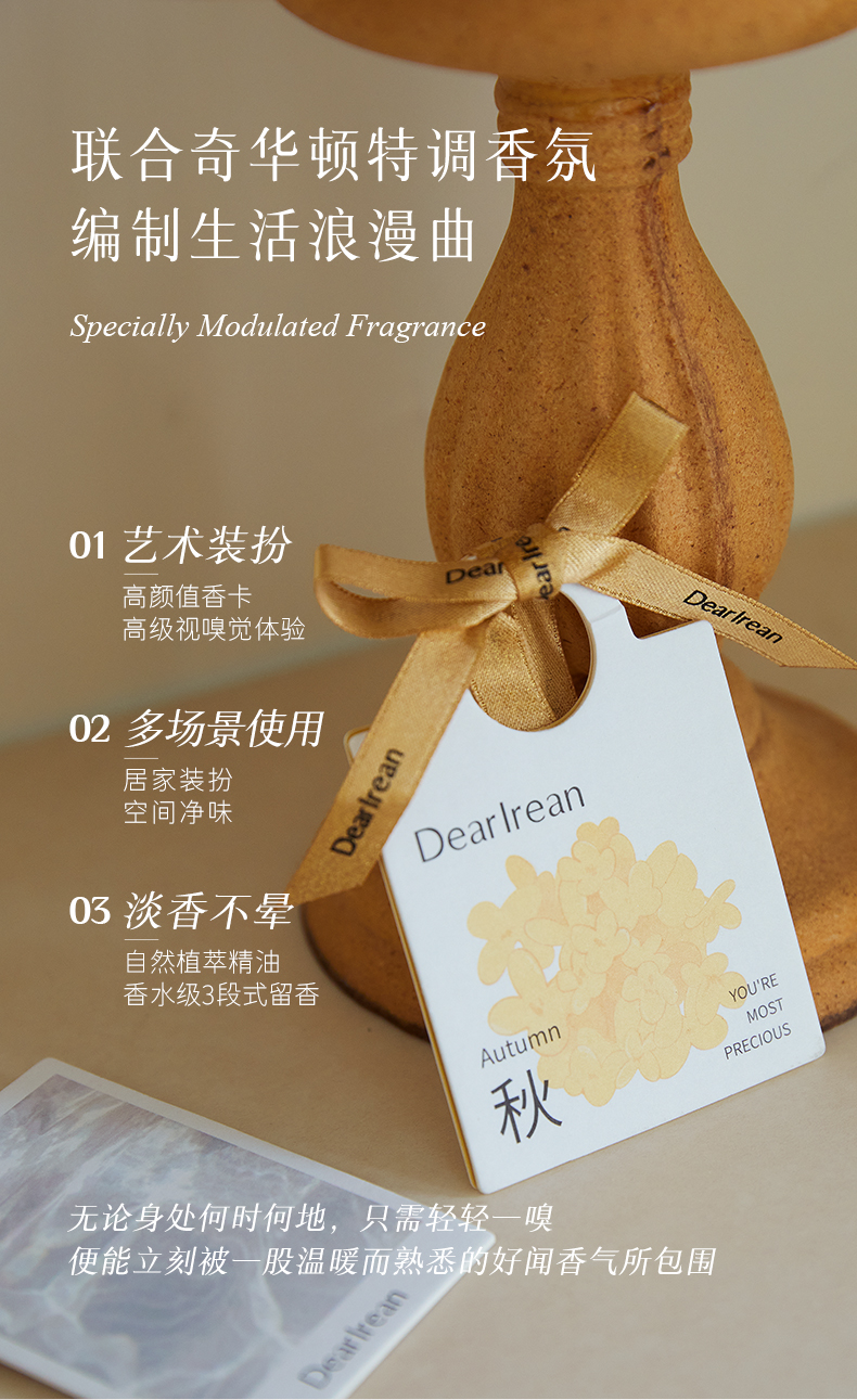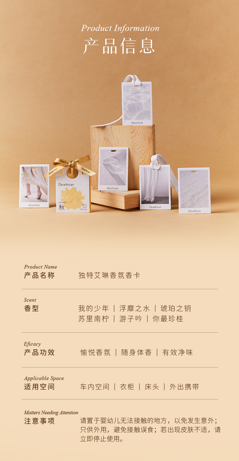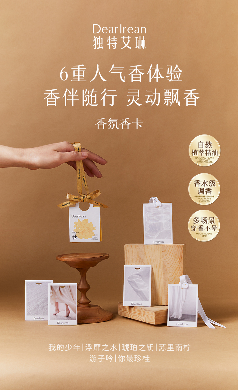 - DearIrean 独特艾琳,高定香氛生活品牌,拥有体•研究所,品牌致力于将高定香氛带入生活,同时倡导“以香之名,带给生活美好方式”的品牌理念,传递精致女性的爱、独立、自信。