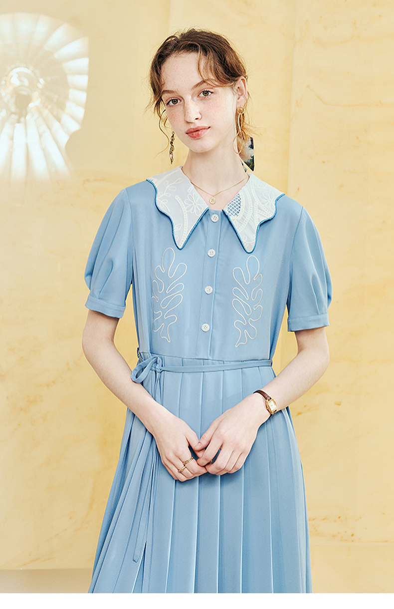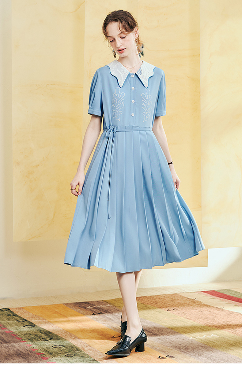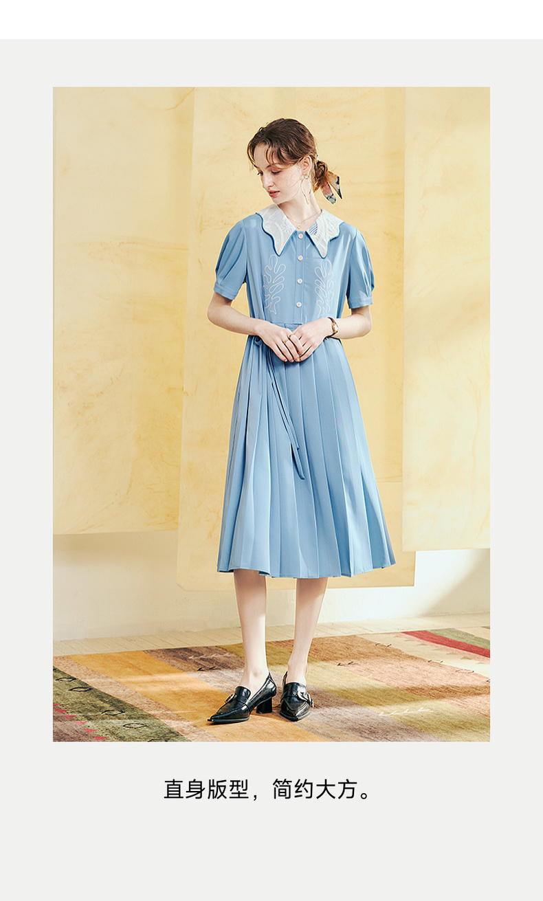 两三事蔚蓝叙事2025夏季新款法式拼布翻领压褶裙摆刺绣a字连衣裙