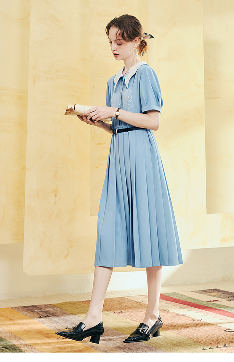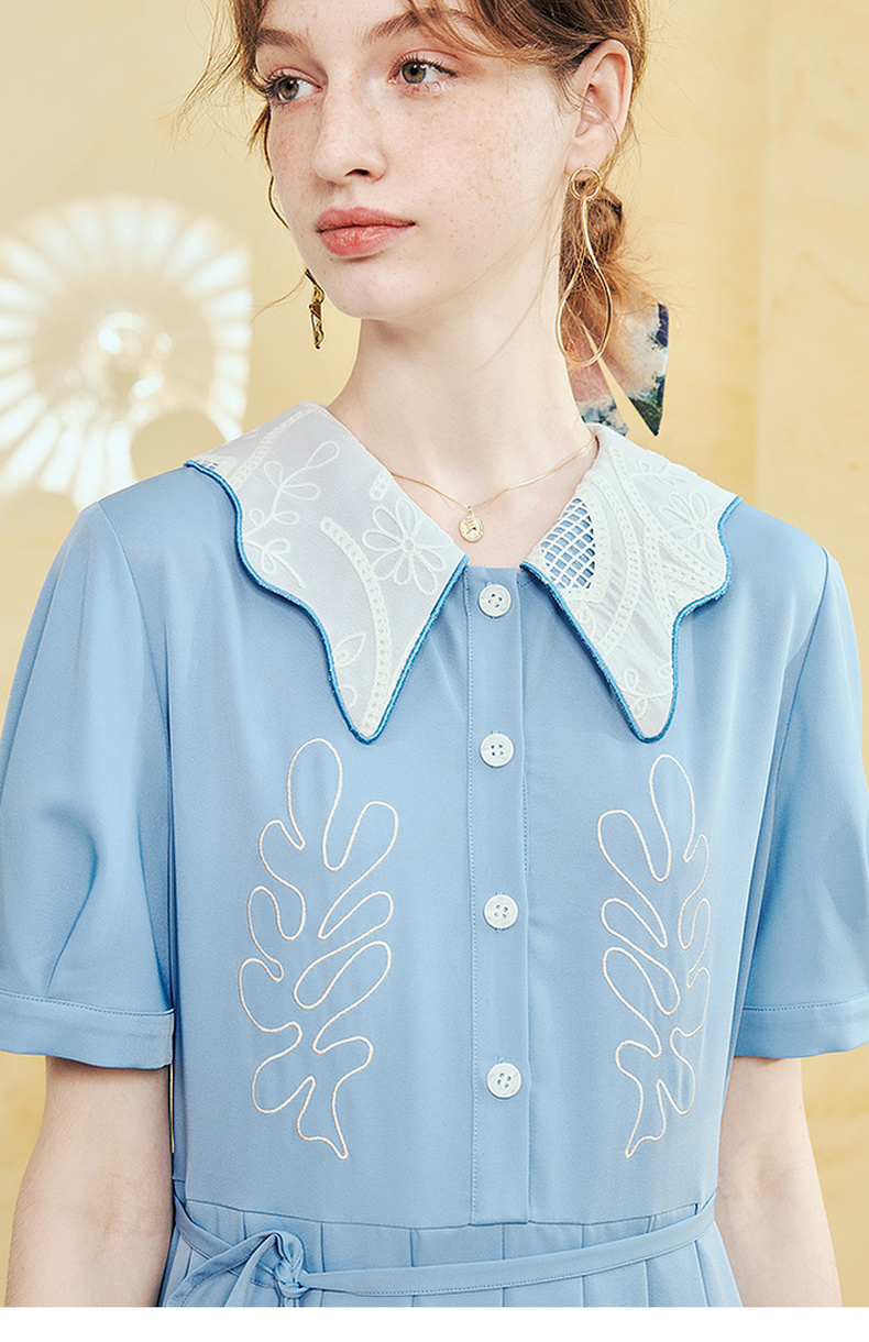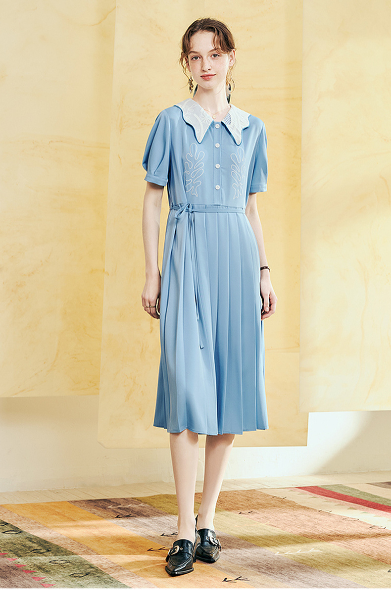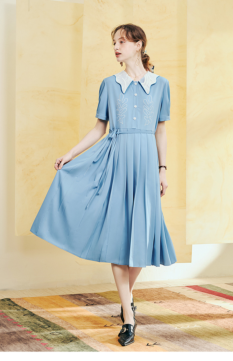 两三事蔚蓝叙事2025夏季新款法式拼布翻领压褶裙摆刺绣a字连衣裙