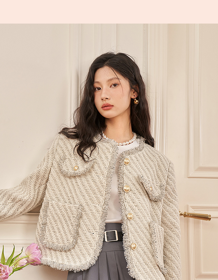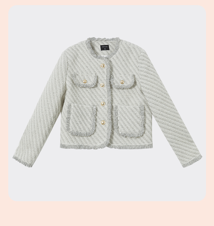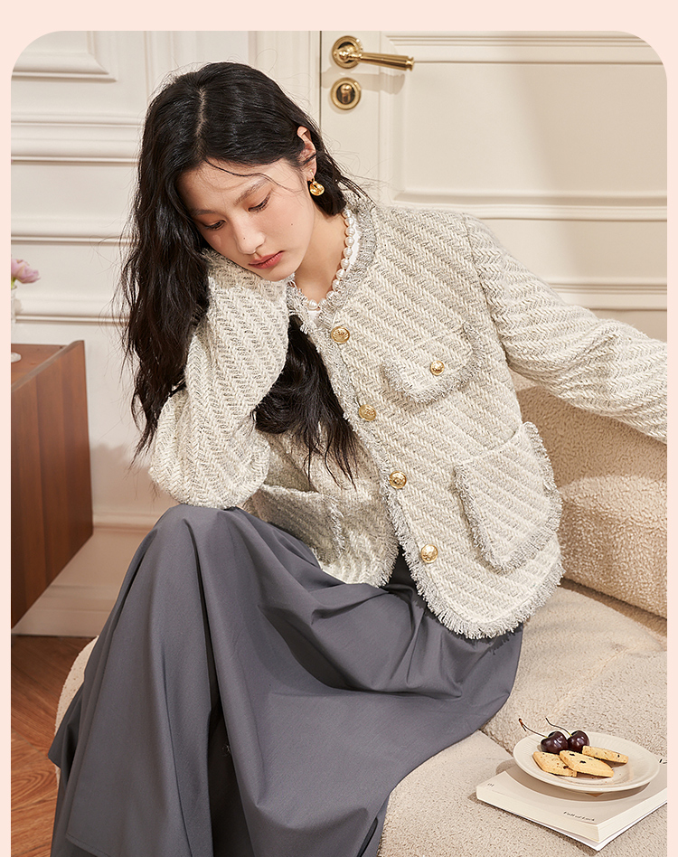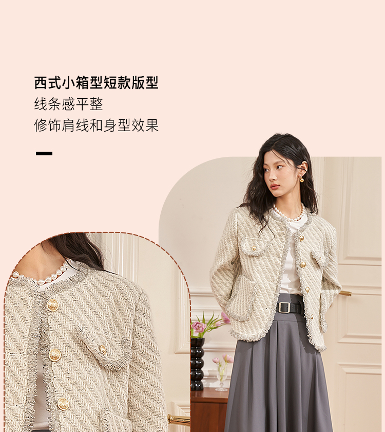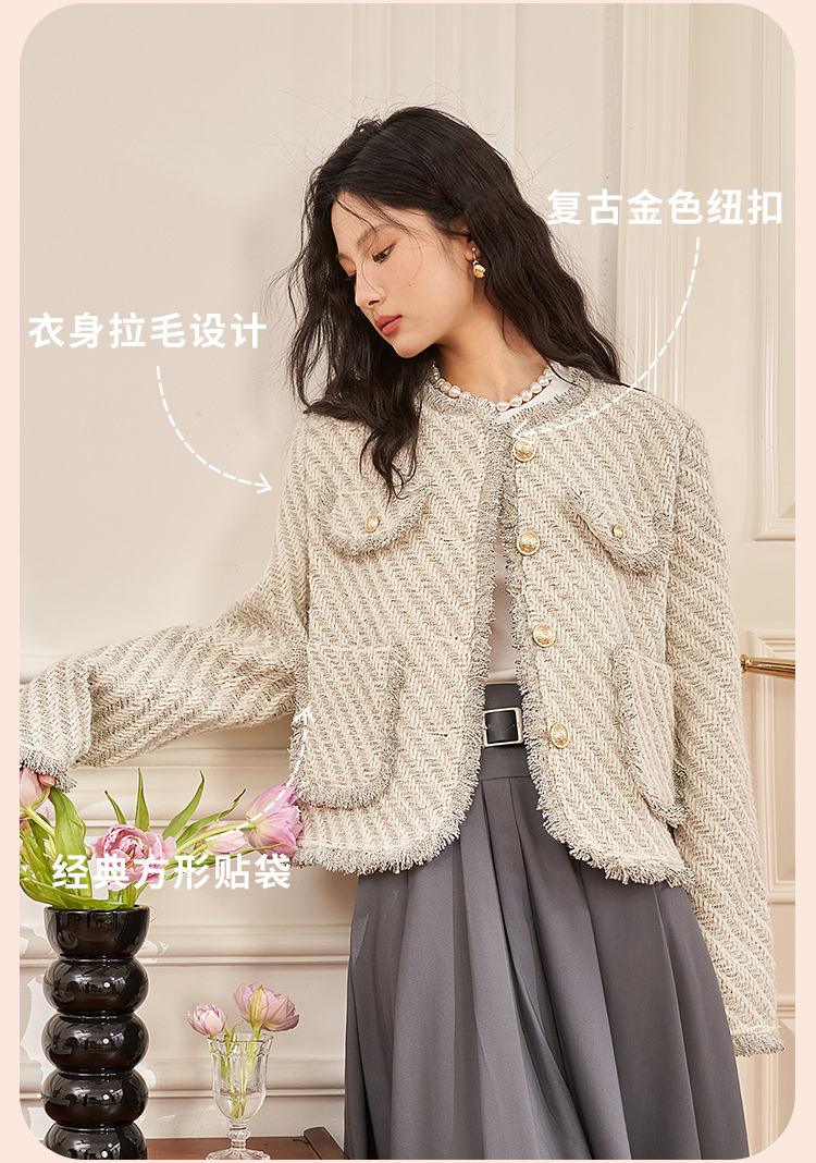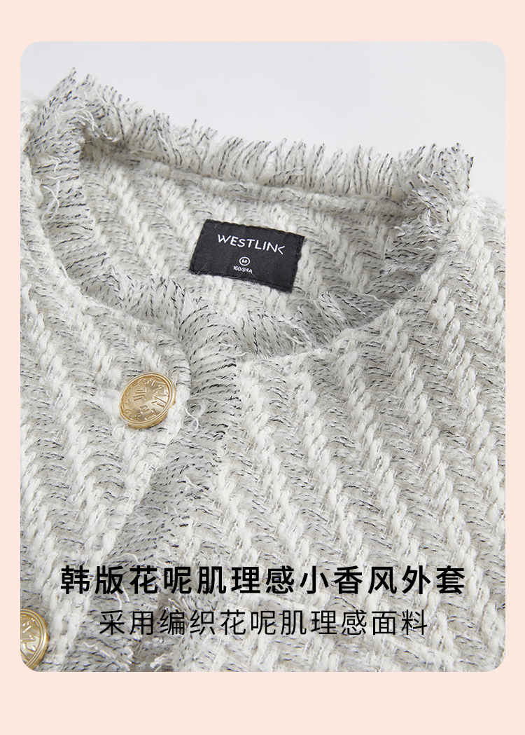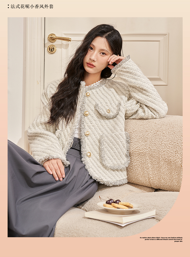 西遇法式小香风外套女新款名媛风粗花呢编织毛边短开衫D1938261