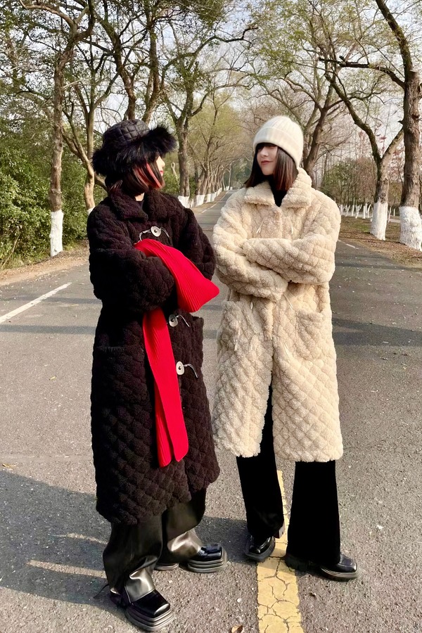 Kai & Kiera 浅咖色厚款格纹毛绒大衣外套 17515