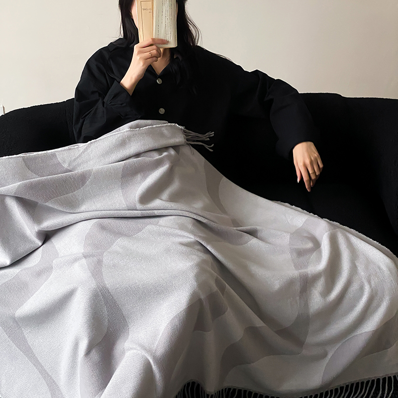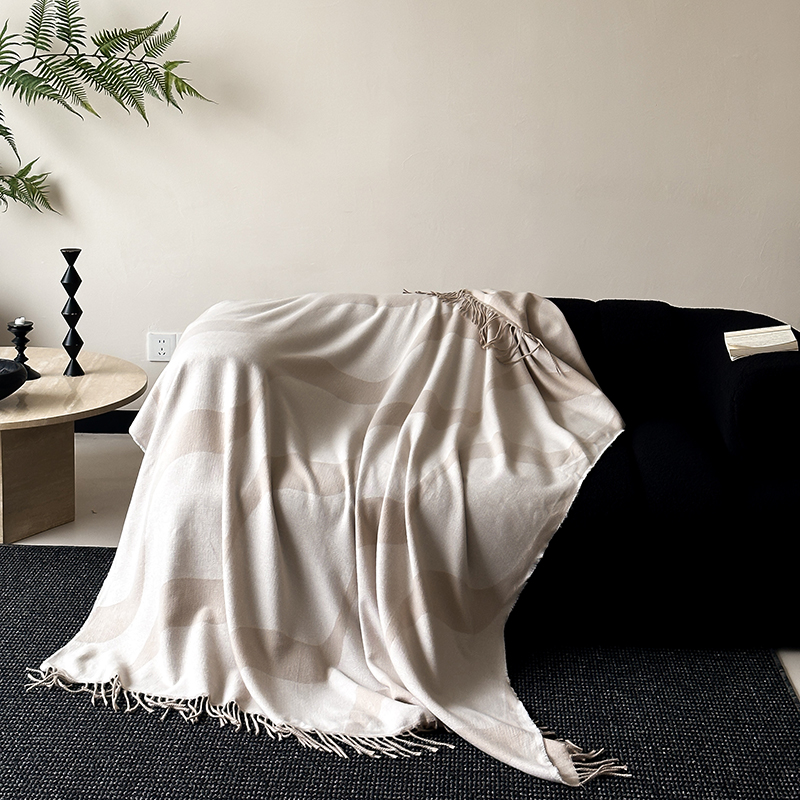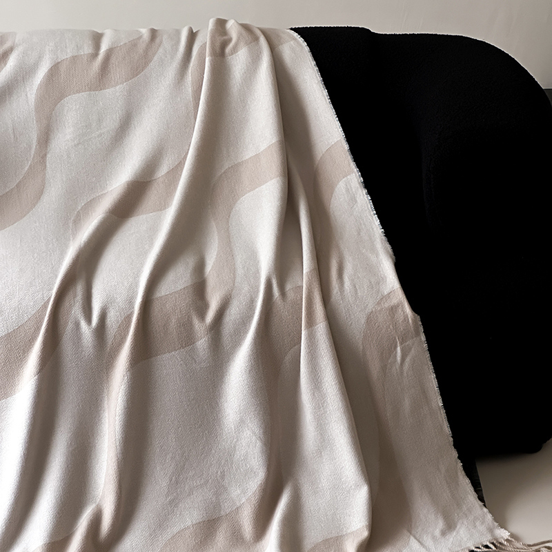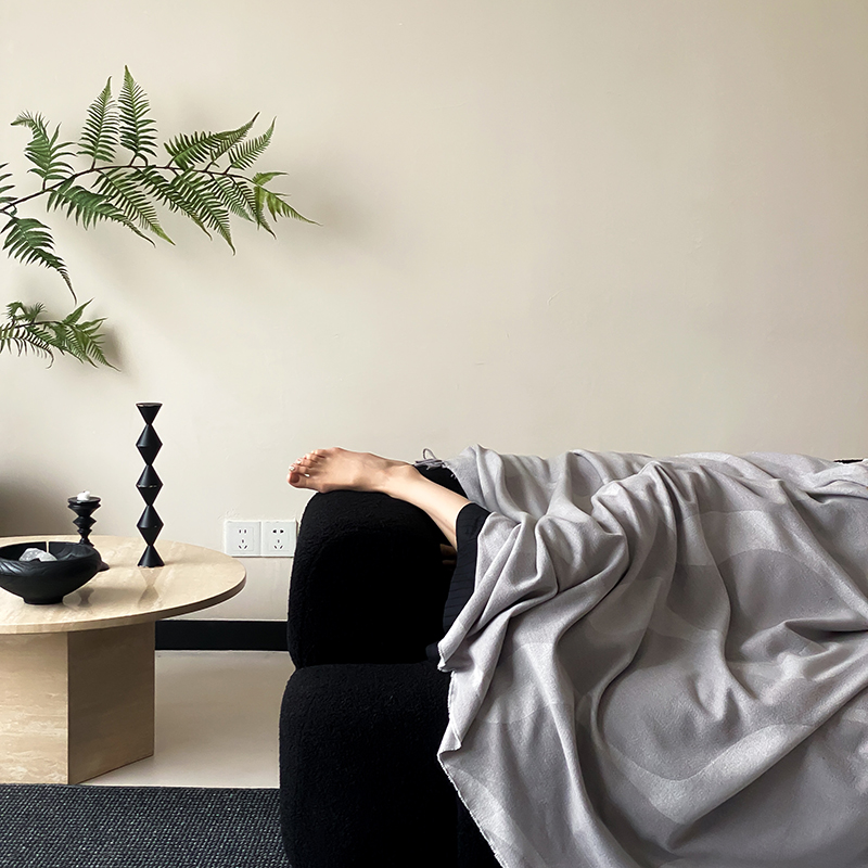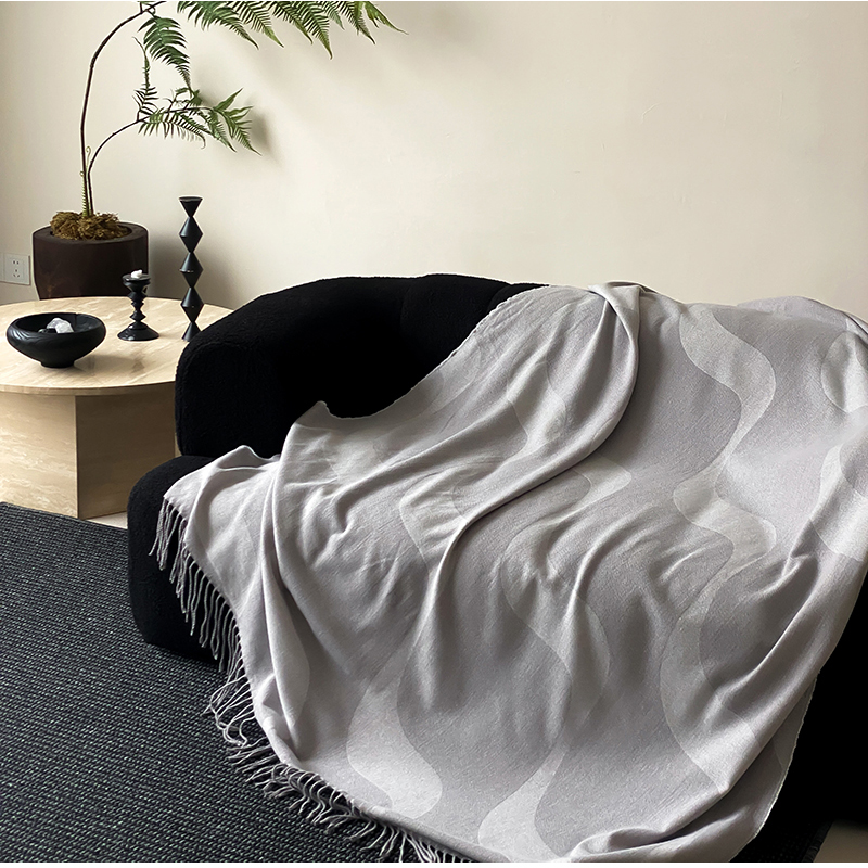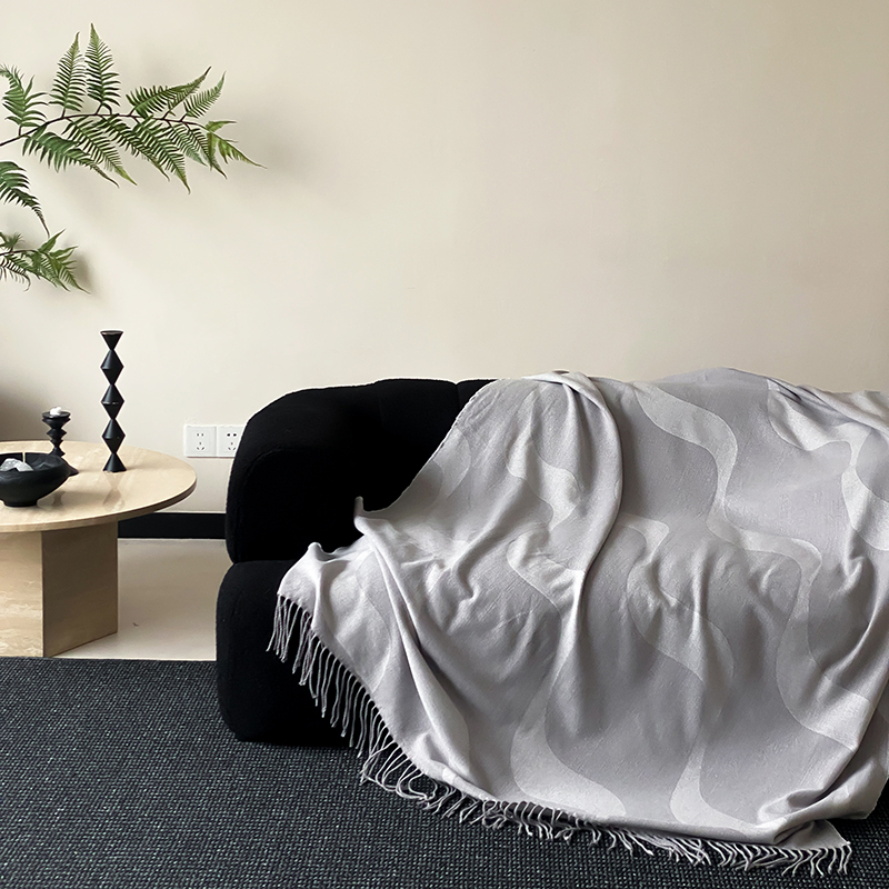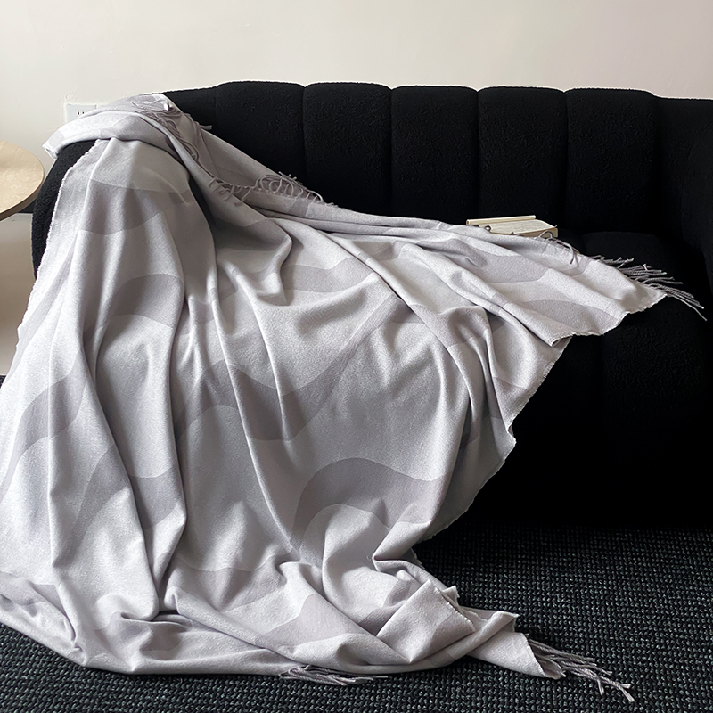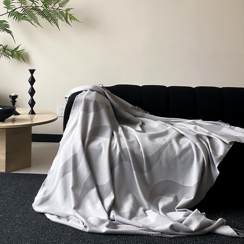 现代简约搭巾,素净雅致,自带花纹,简单流畅,材质触感舒适柔软,流苏有坠感,整体时尚大气。手感蓬松柔软,时时感知生活温度。作为沙发毯,旅行毯,午休毯,床尾毯,满足多场景多用途的需求。