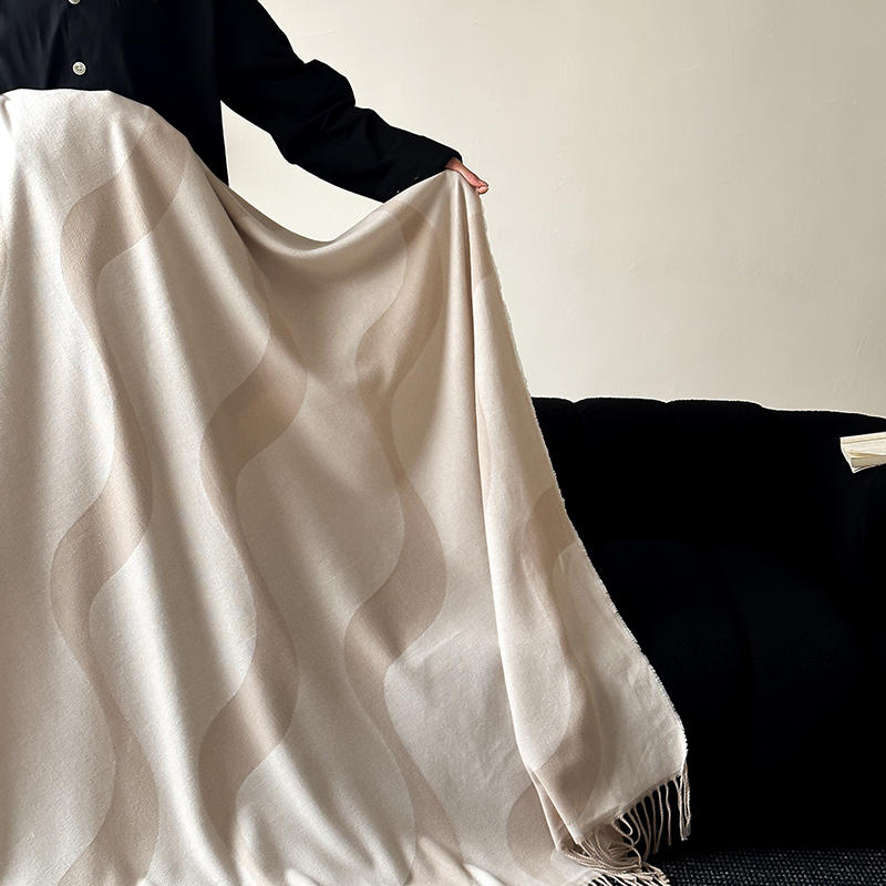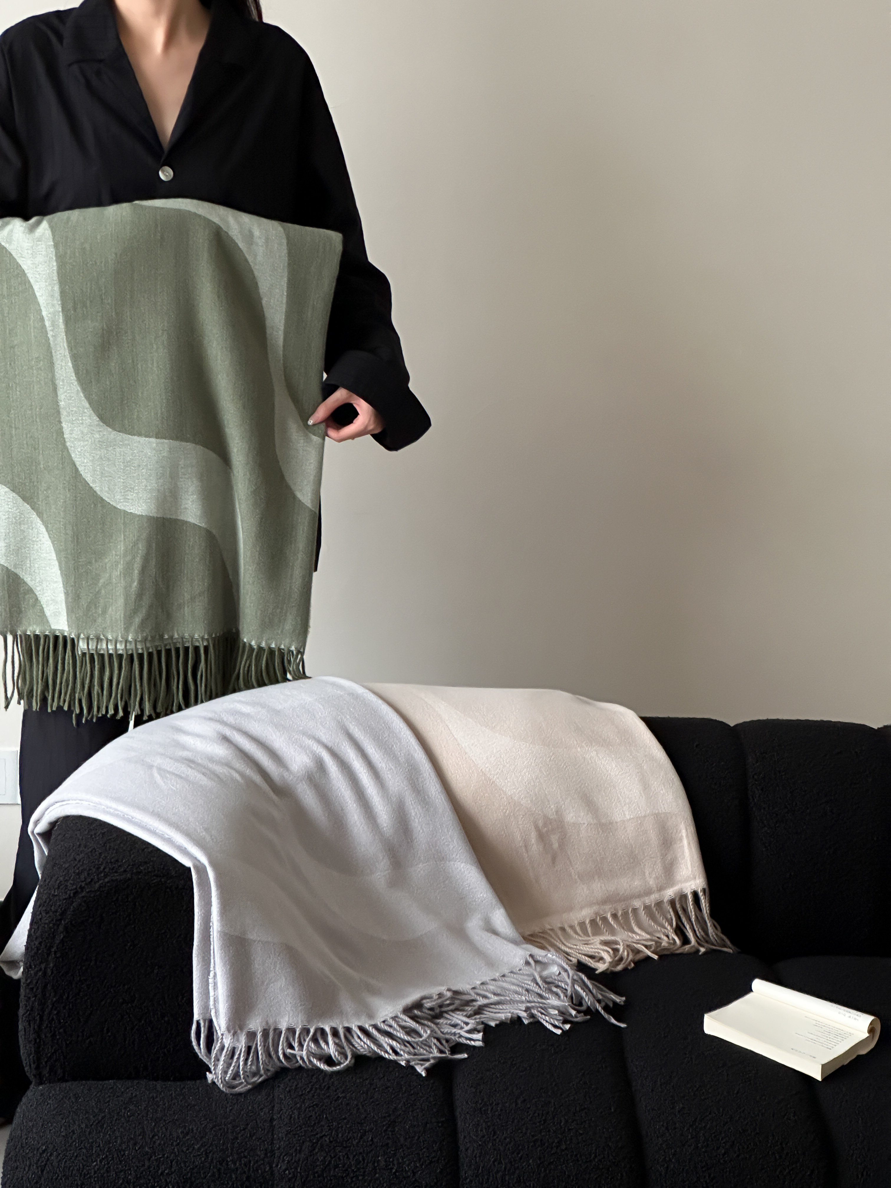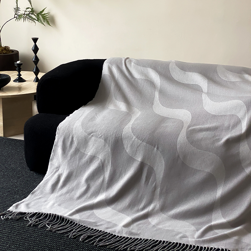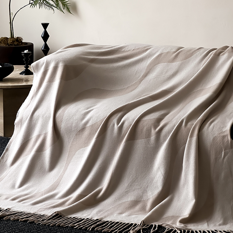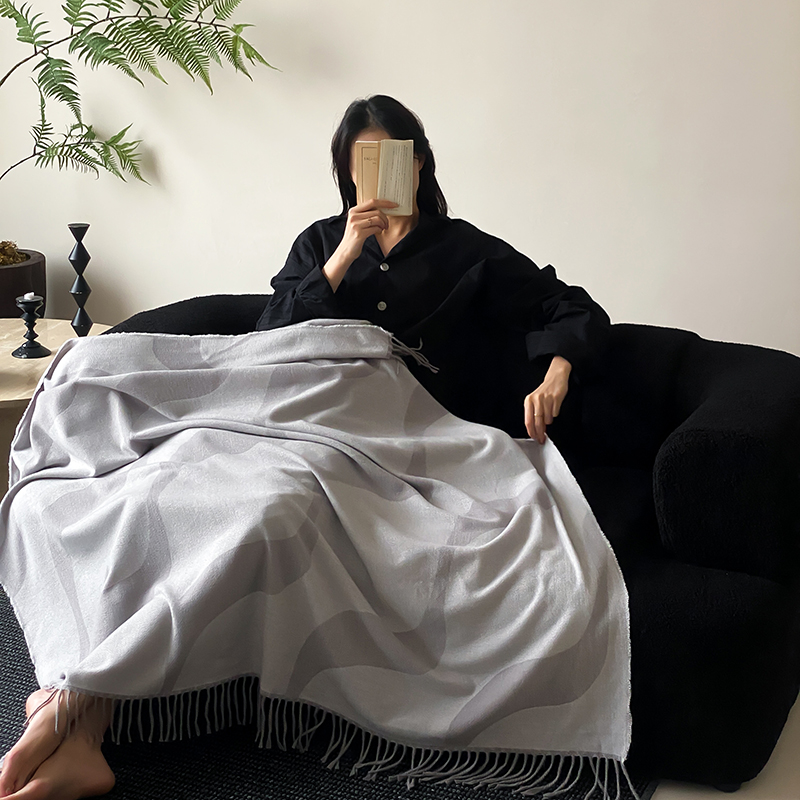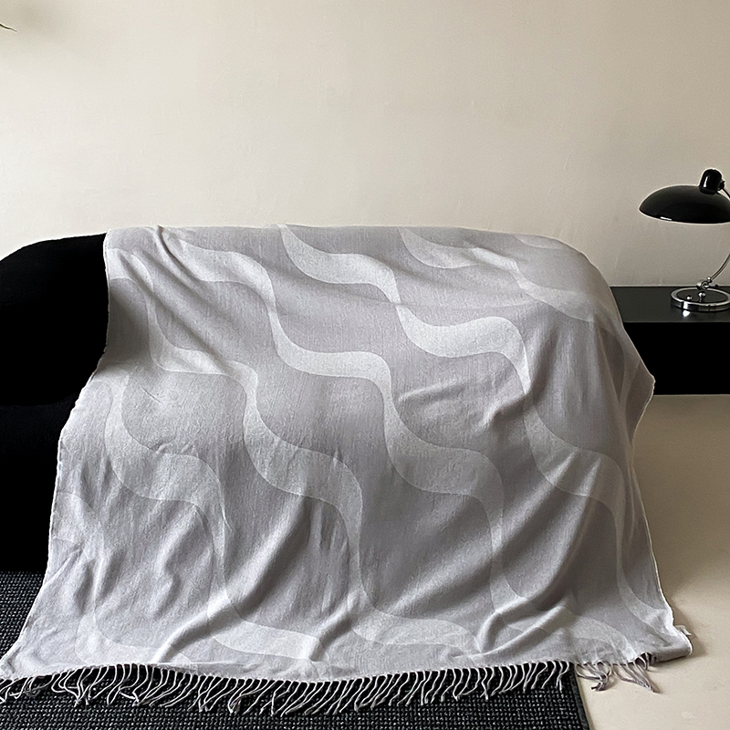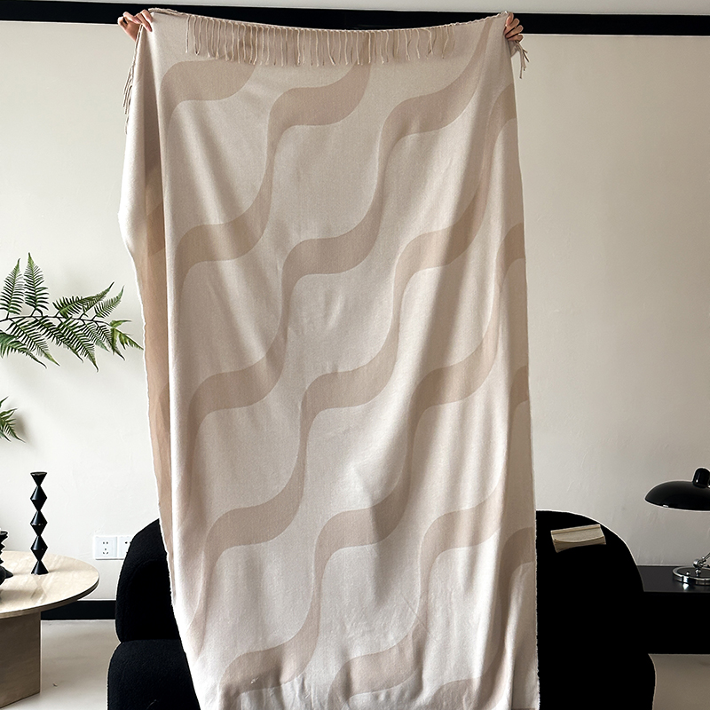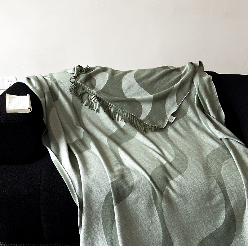 现代简约搭巾,素净雅致,自带花纹,简单流畅,材质触感舒适柔软,流苏有坠感,整体时尚大气。手感蓬松柔软,时时感知生活温度。作为沙发毯,旅行毯,午休毯,床尾毯,满足多场景多用途的需求。
