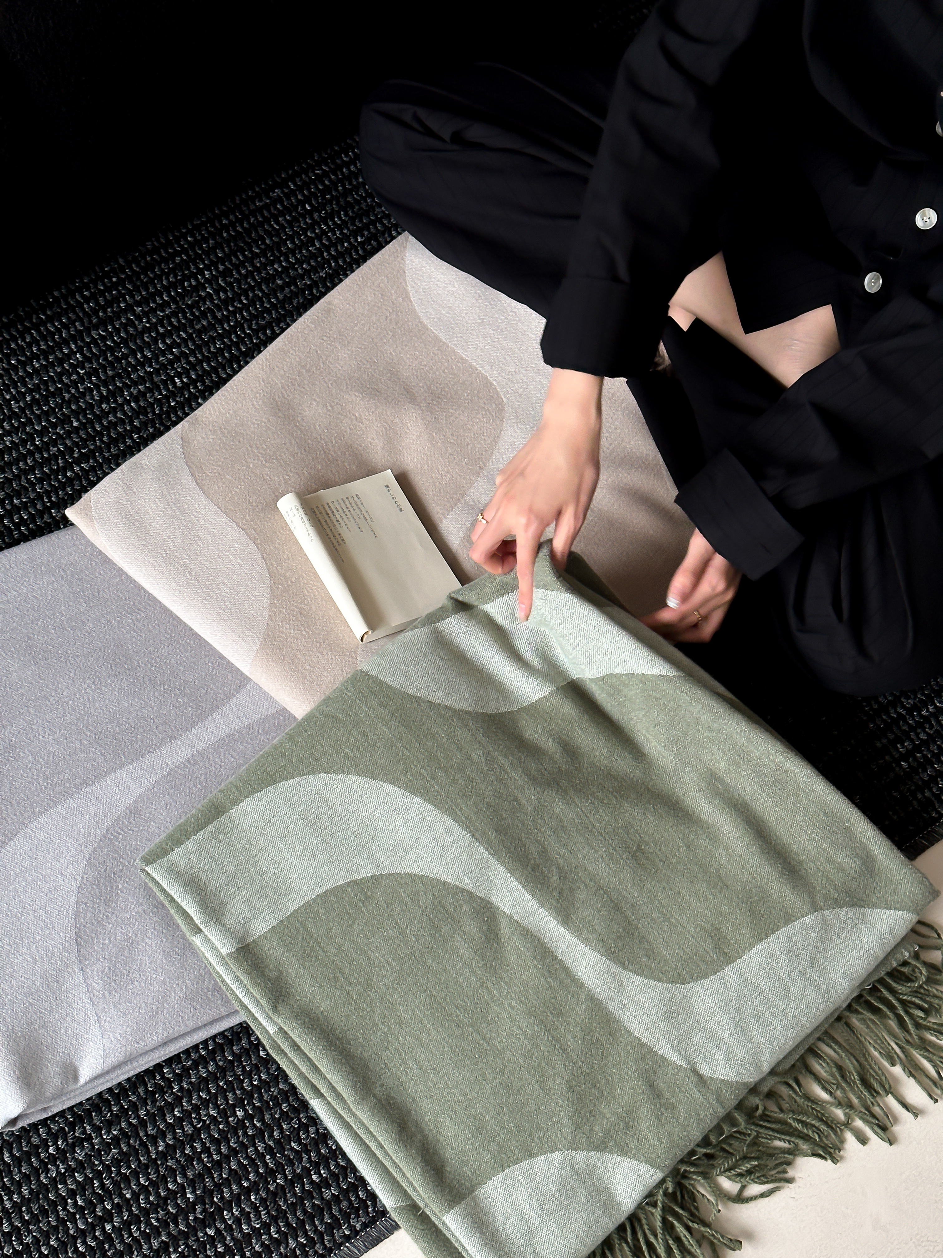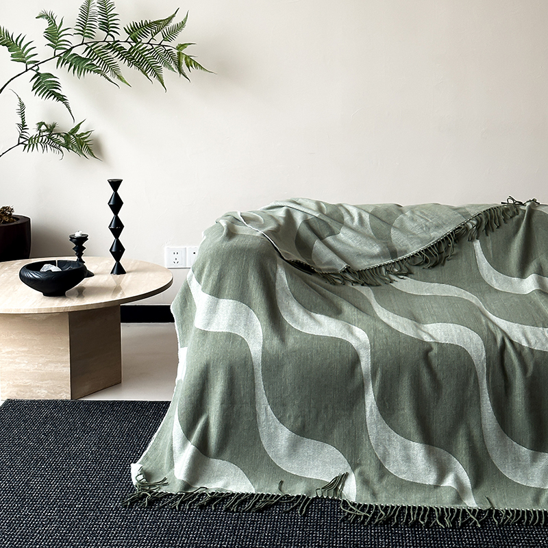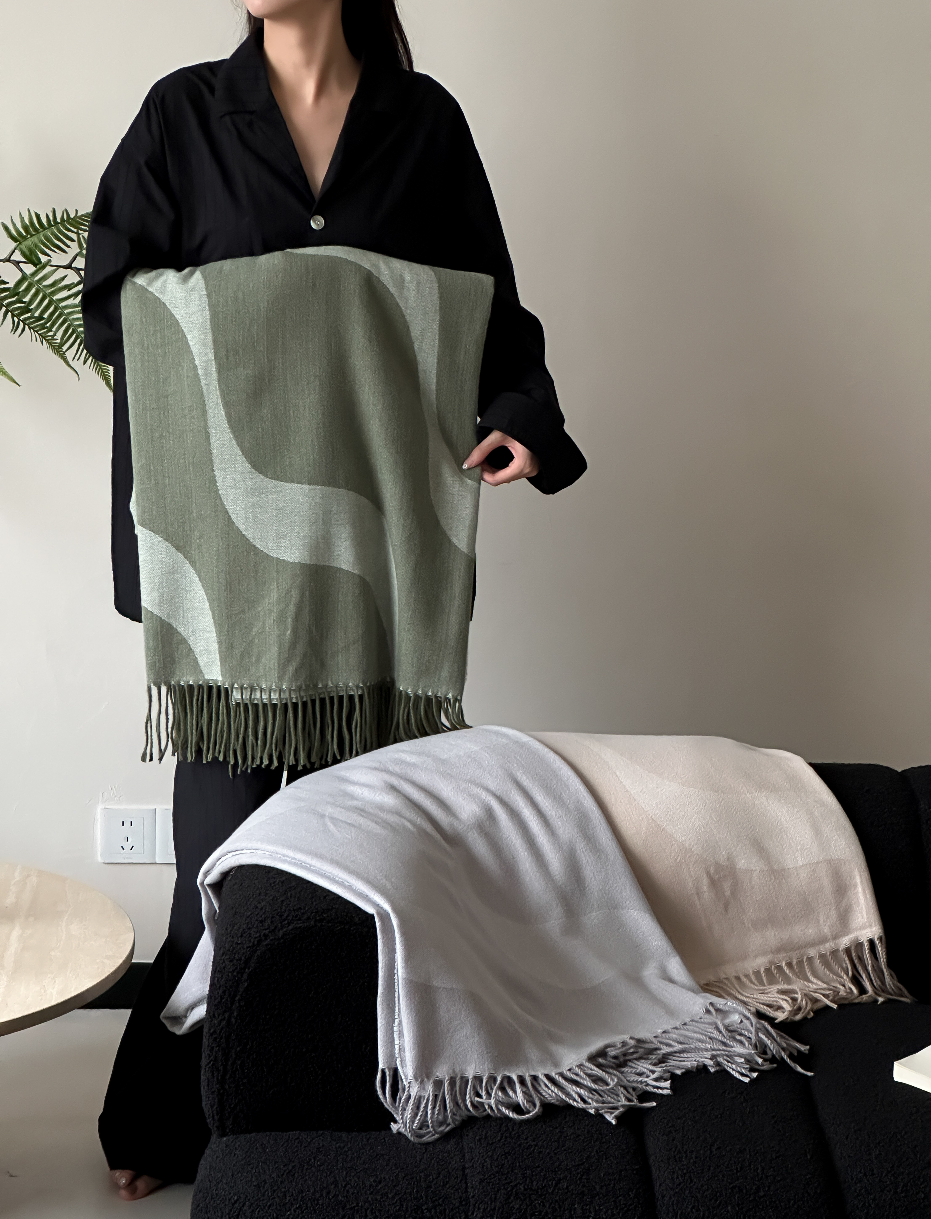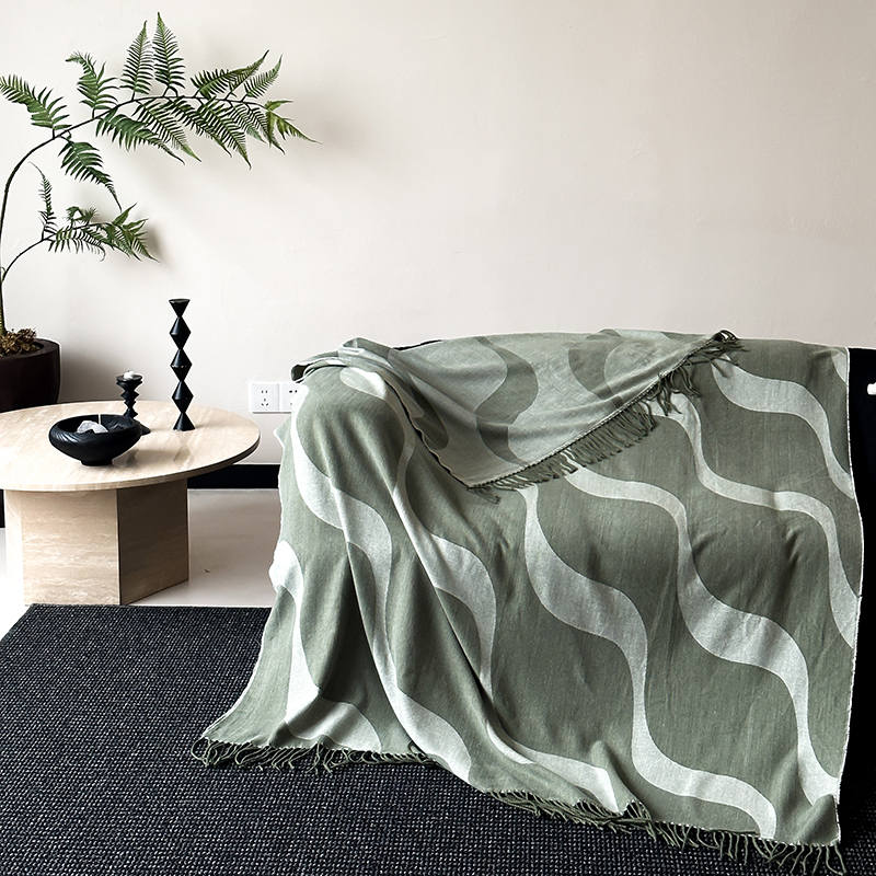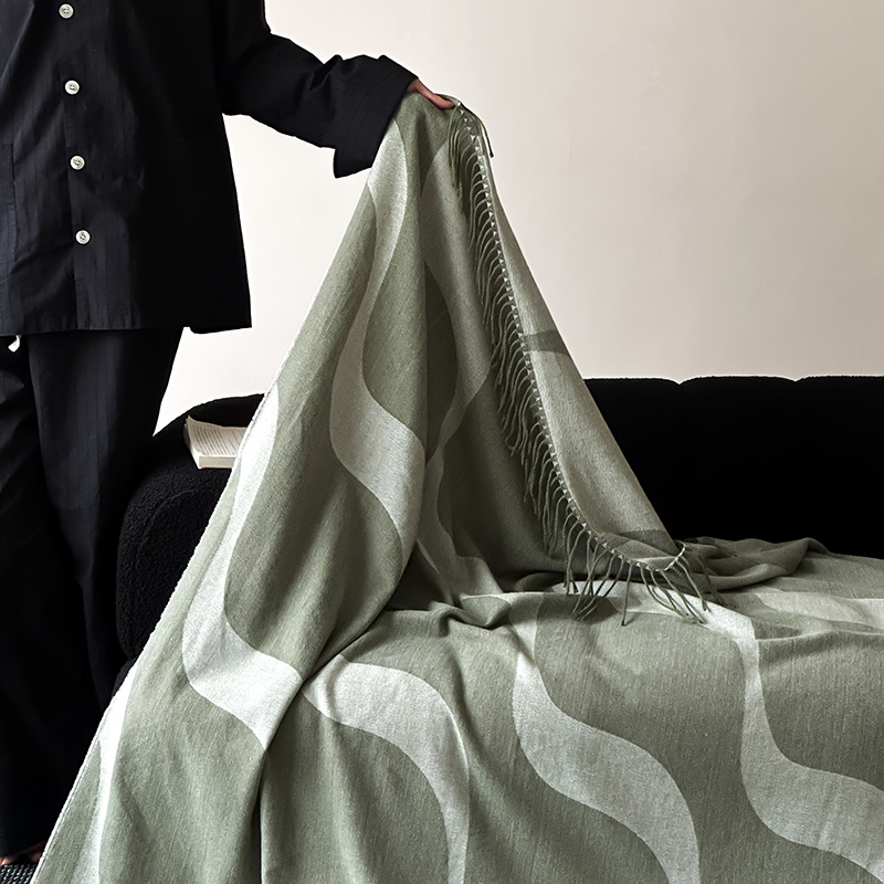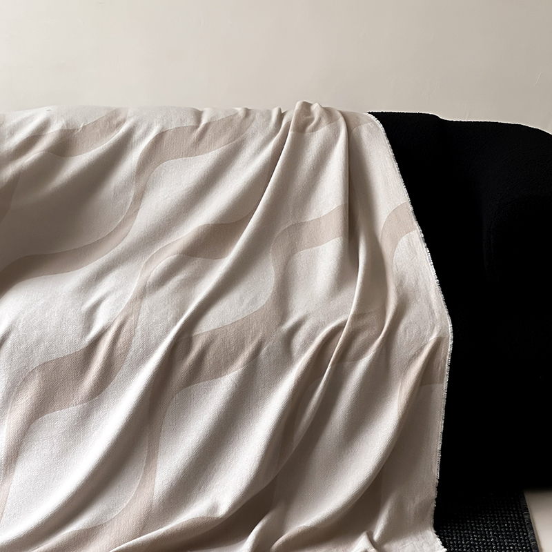 现代简约搭巾,素净雅致,自带花纹,简单流畅,材质触感舒适柔软,流苏有坠感,整体时尚大气。手感蓬松柔软,时时感知生活温度。作为沙发毯,旅行毯,午休毯,床尾毯,满足多场景多用途的需求。