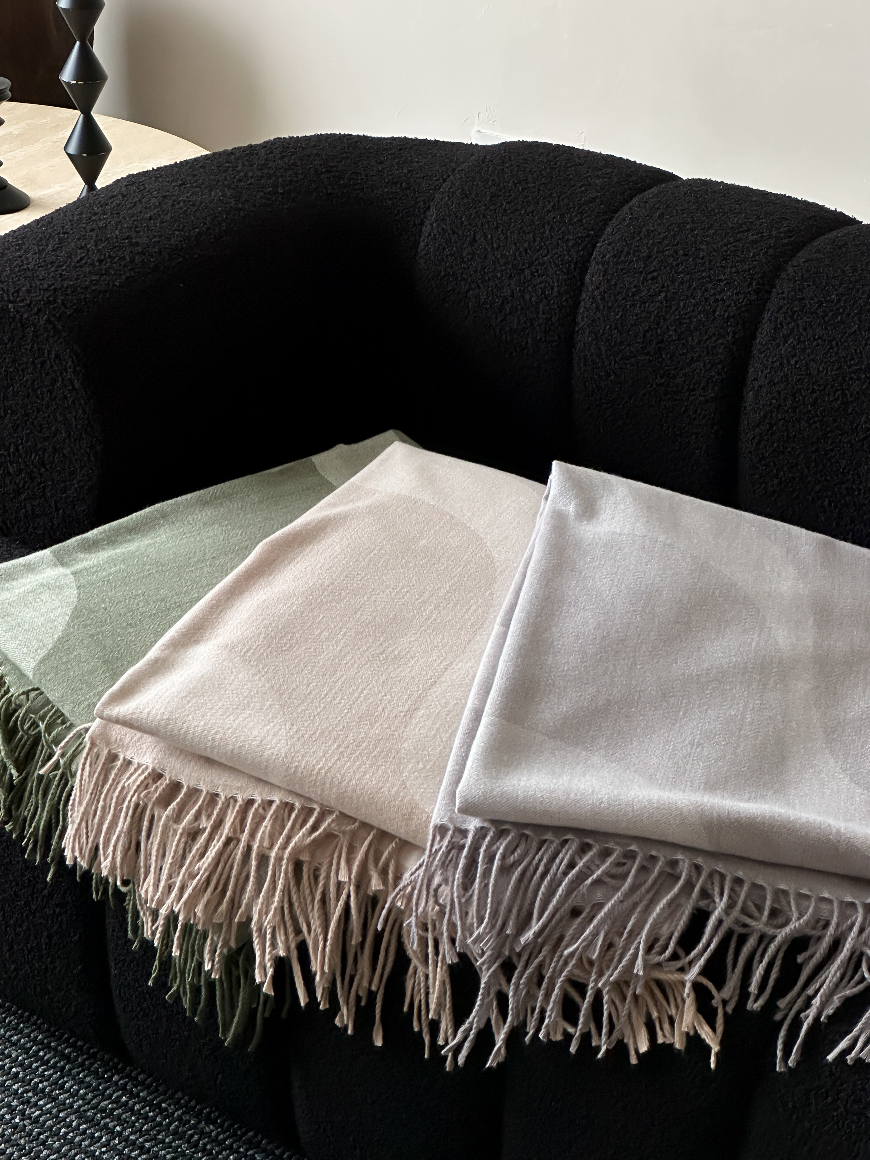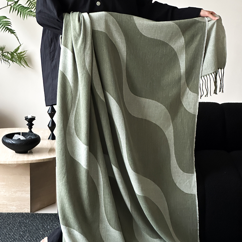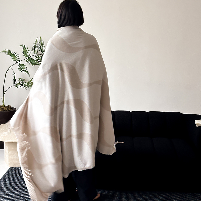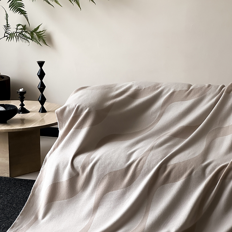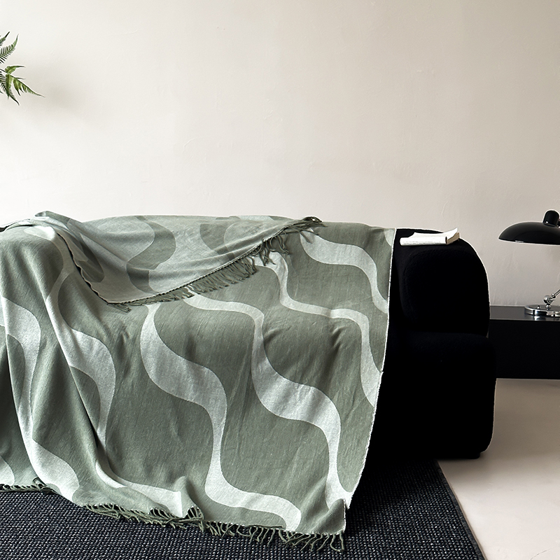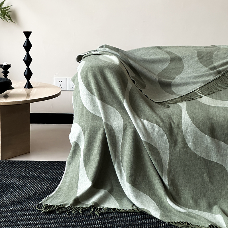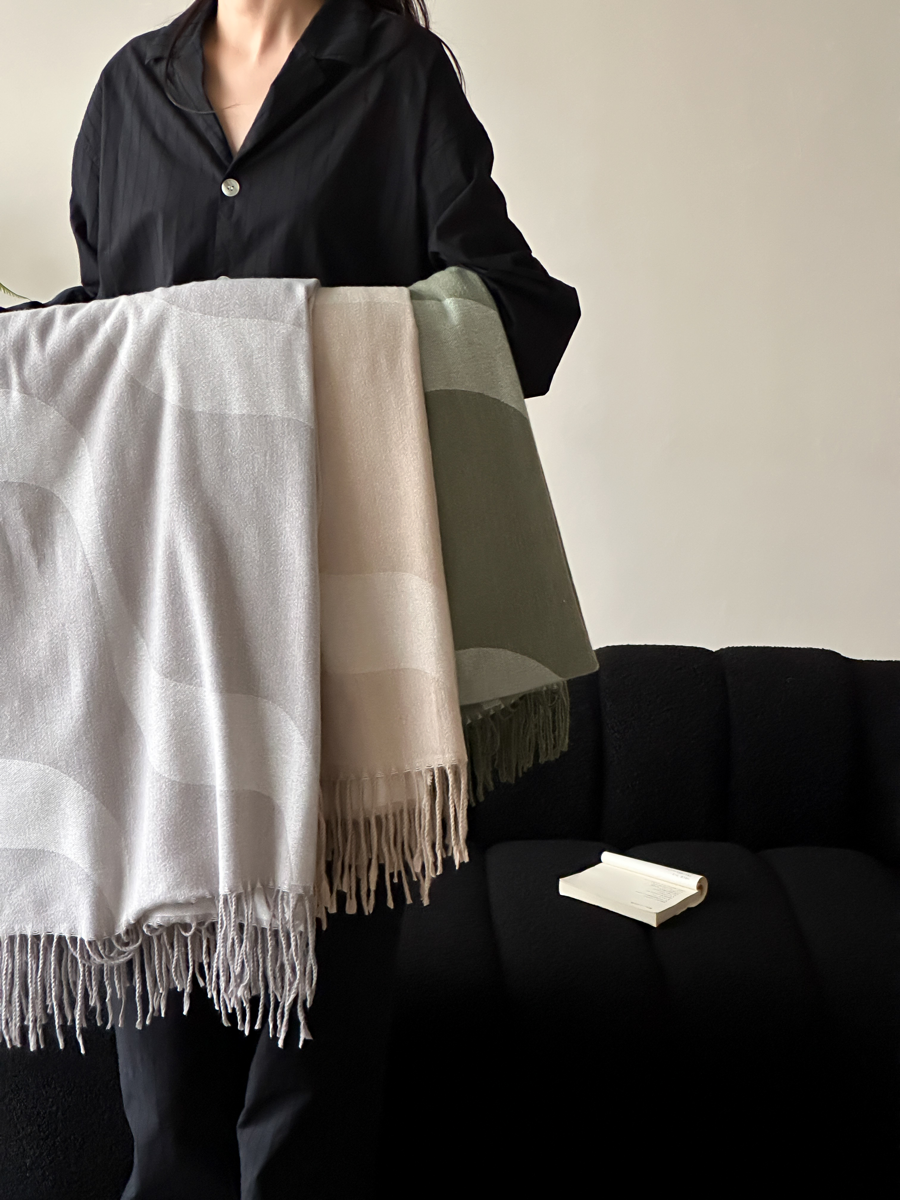 现代简约搭巾,素净雅致,自带花纹,简单流畅,材质触感舒适柔软,流苏有坠感,整体时尚大气。手感蓬松柔软,时时感知生活温度。作为沙发毯,旅行毯,午休毯,床尾毯,满足多场景多用途的需求。