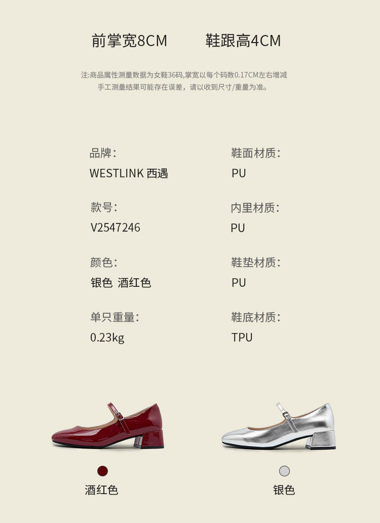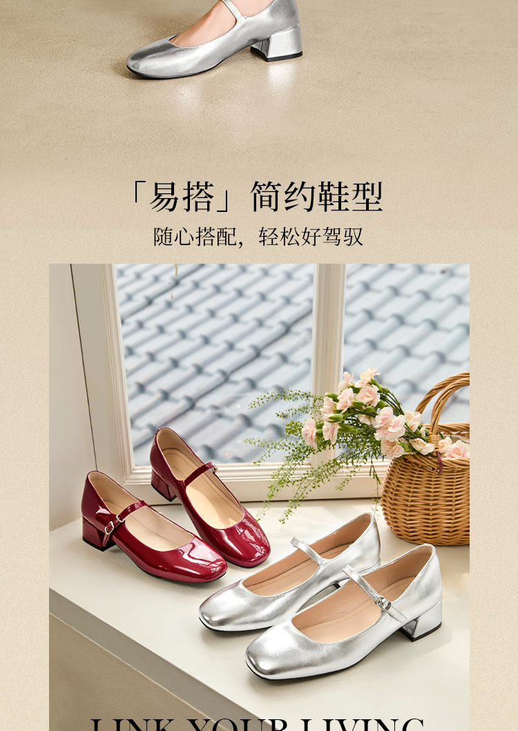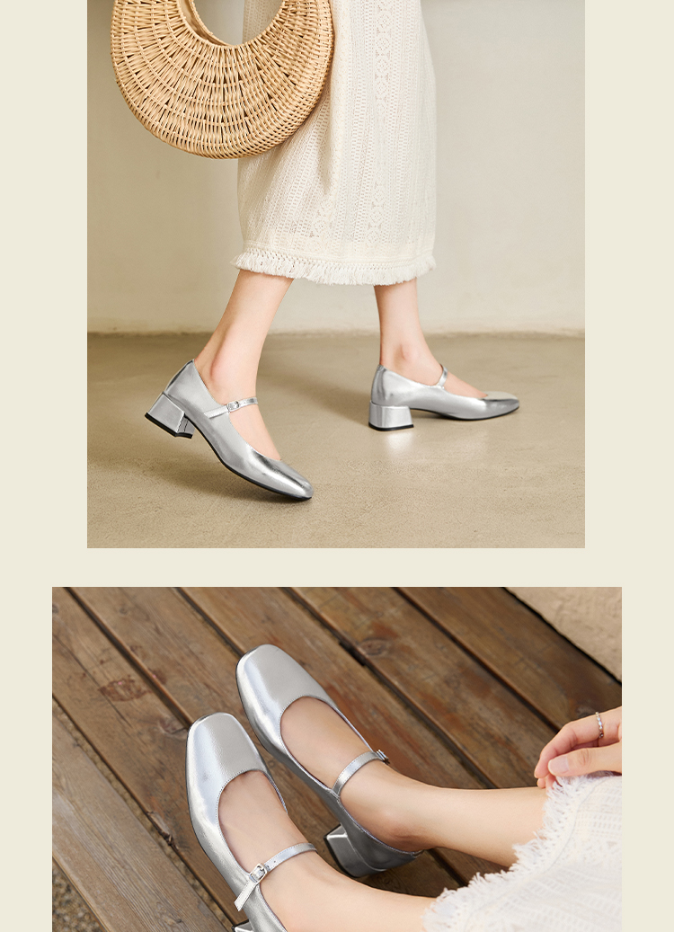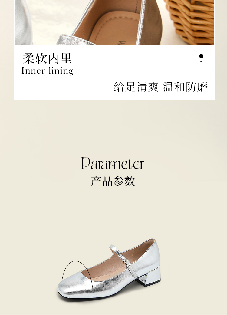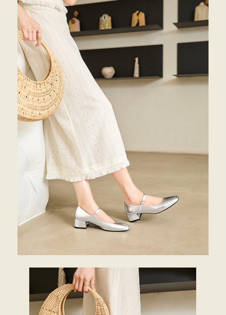 西遇法式玛丽珍鞋女新款早春百搭方头一字带中跟粗跟银色单鞋V2547246