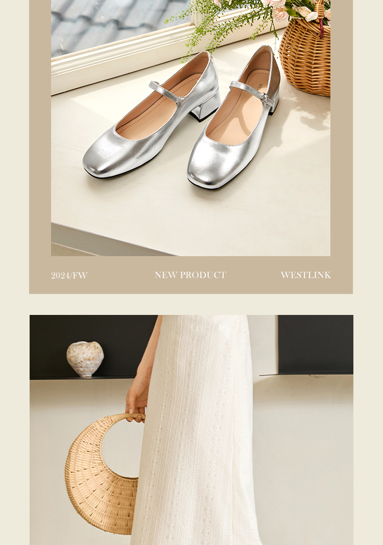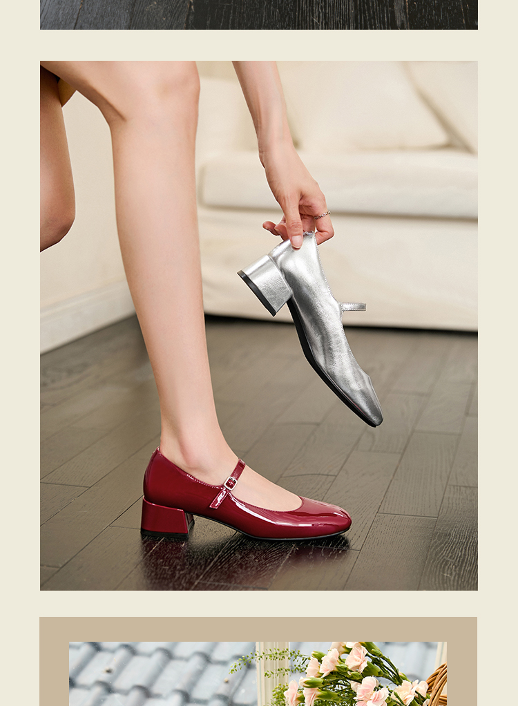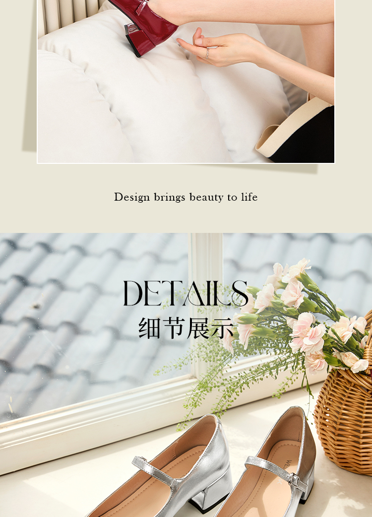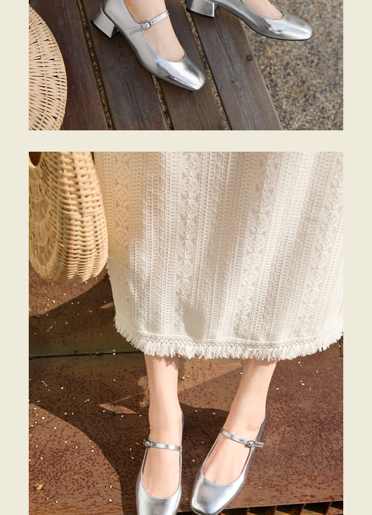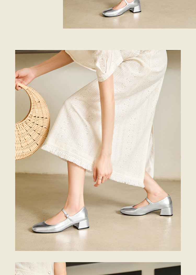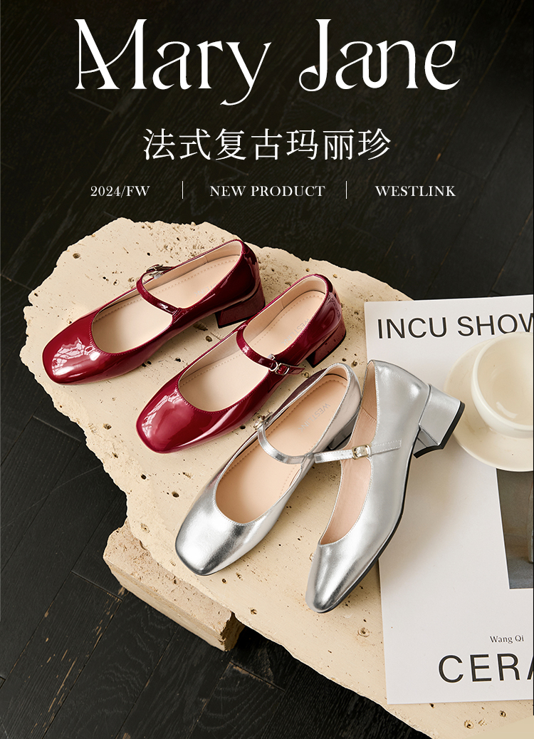 西遇法式玛丽珍鞋女新款早春百搭方头一字带中跟粗跟银色单鞋V2547246
