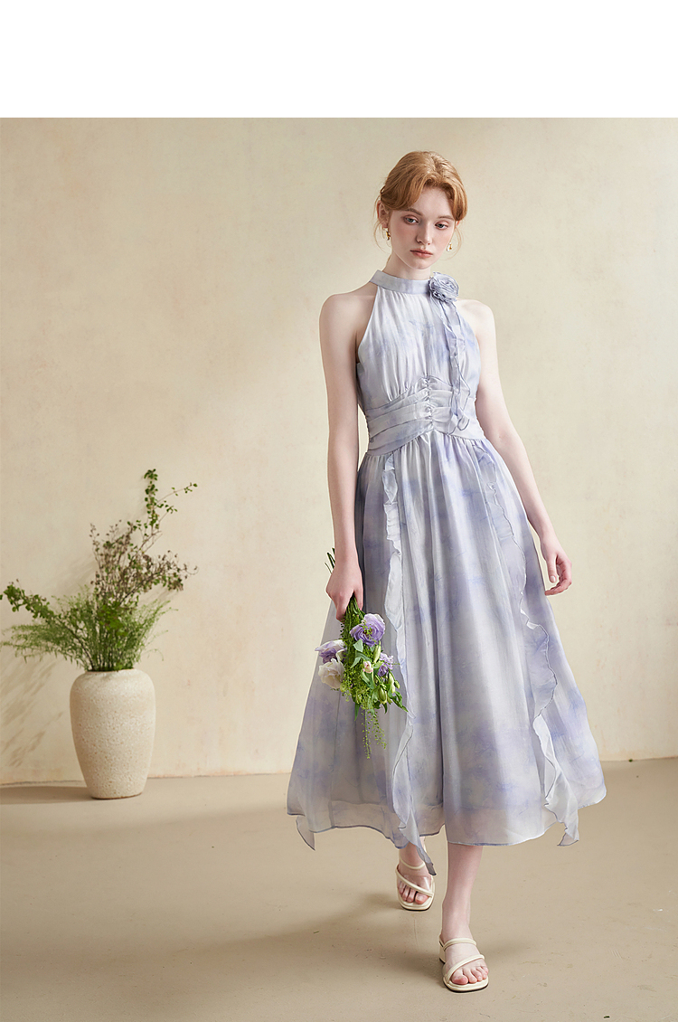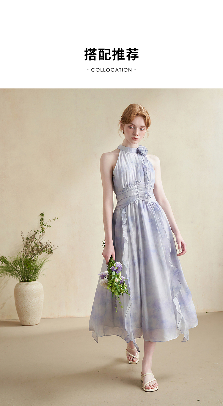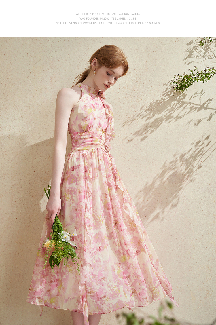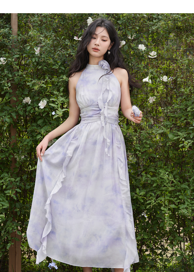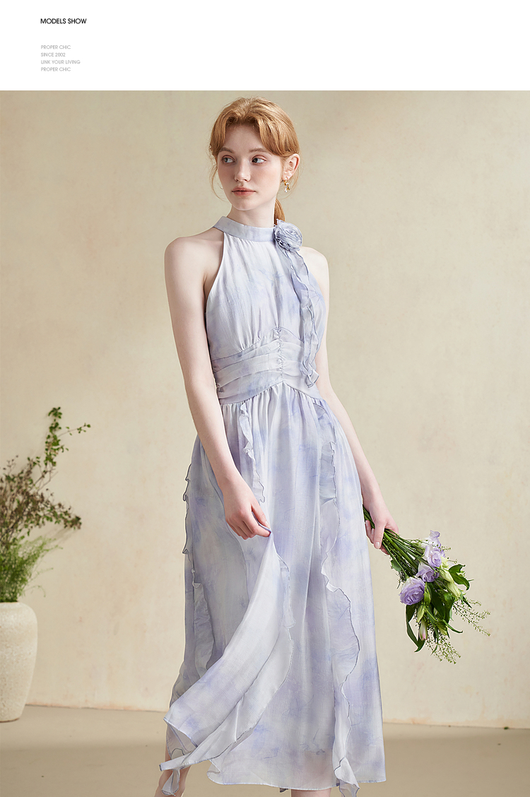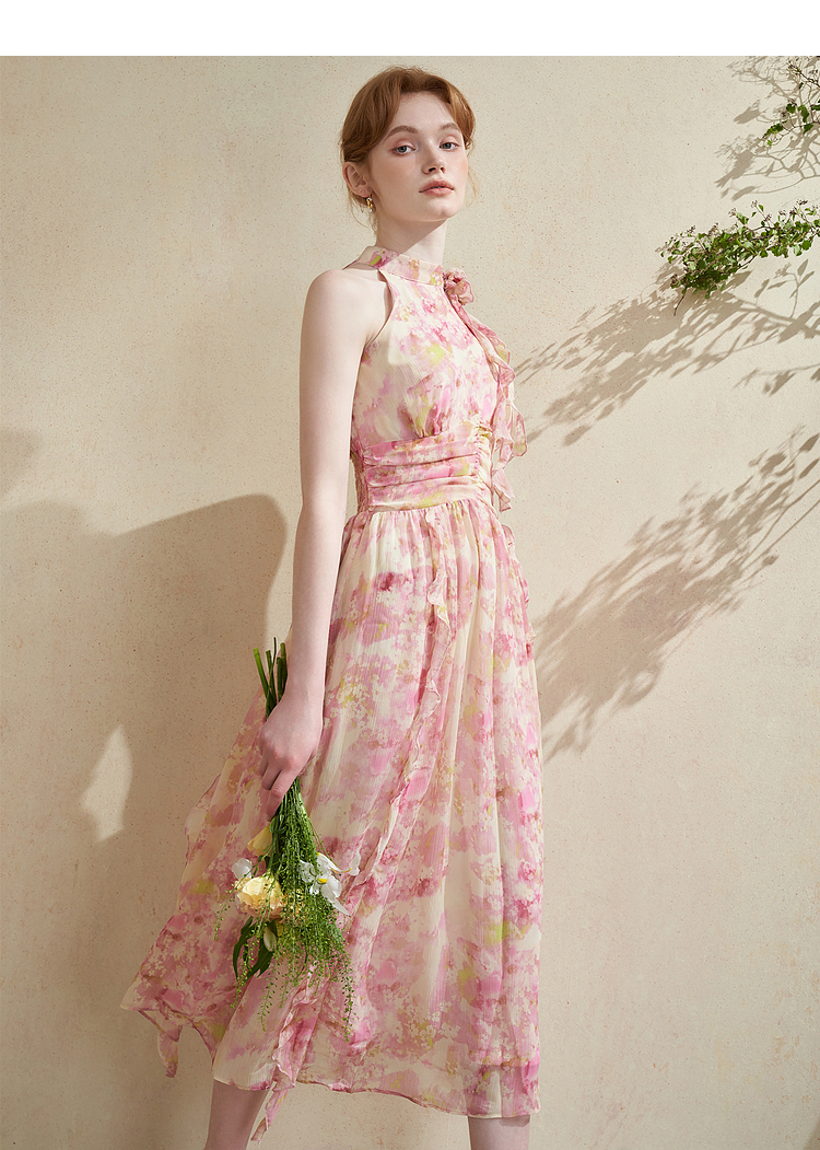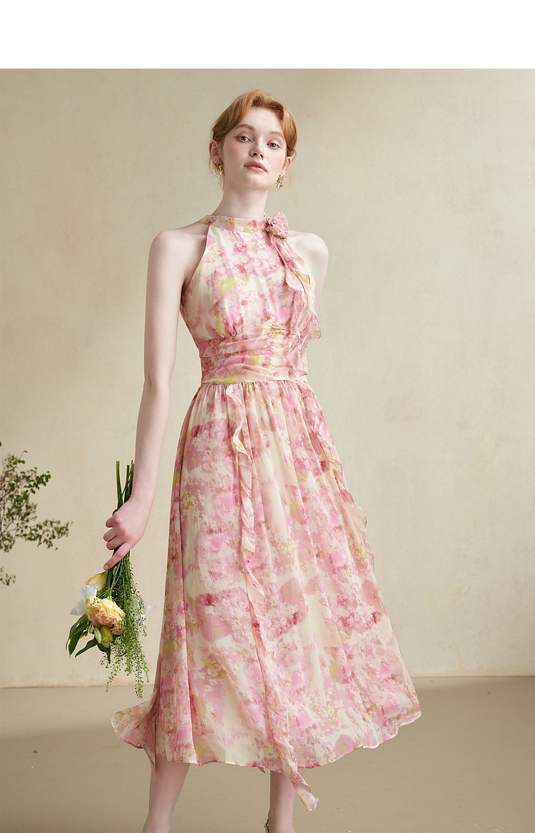 优雅挂脖荷叶边碎花连衣裙新款立领无袖A字型长裙V0740512