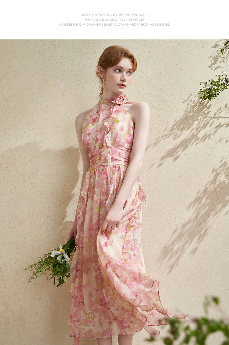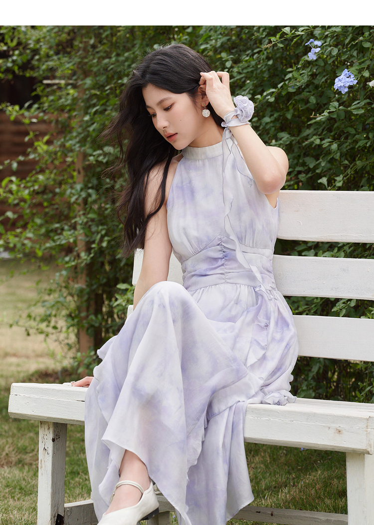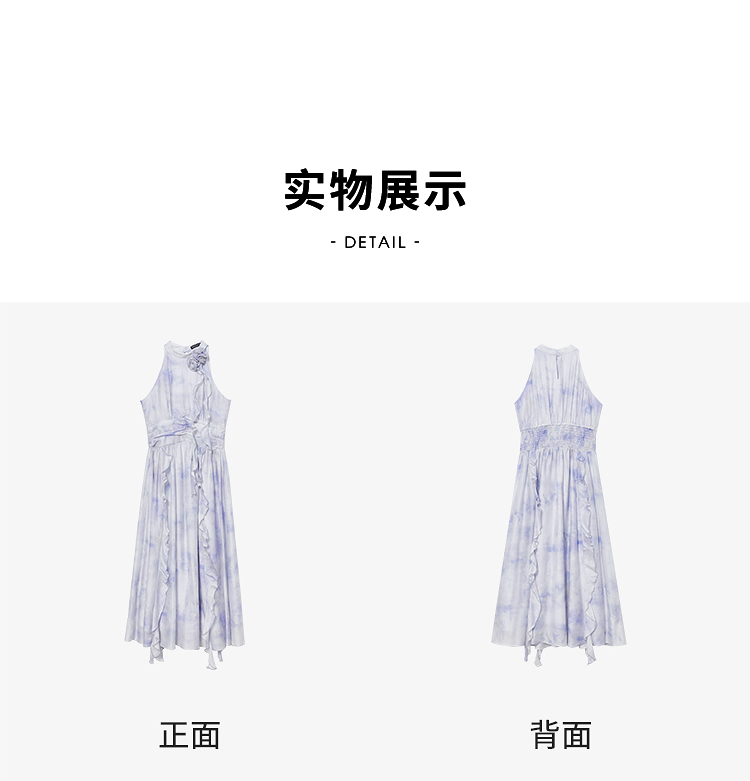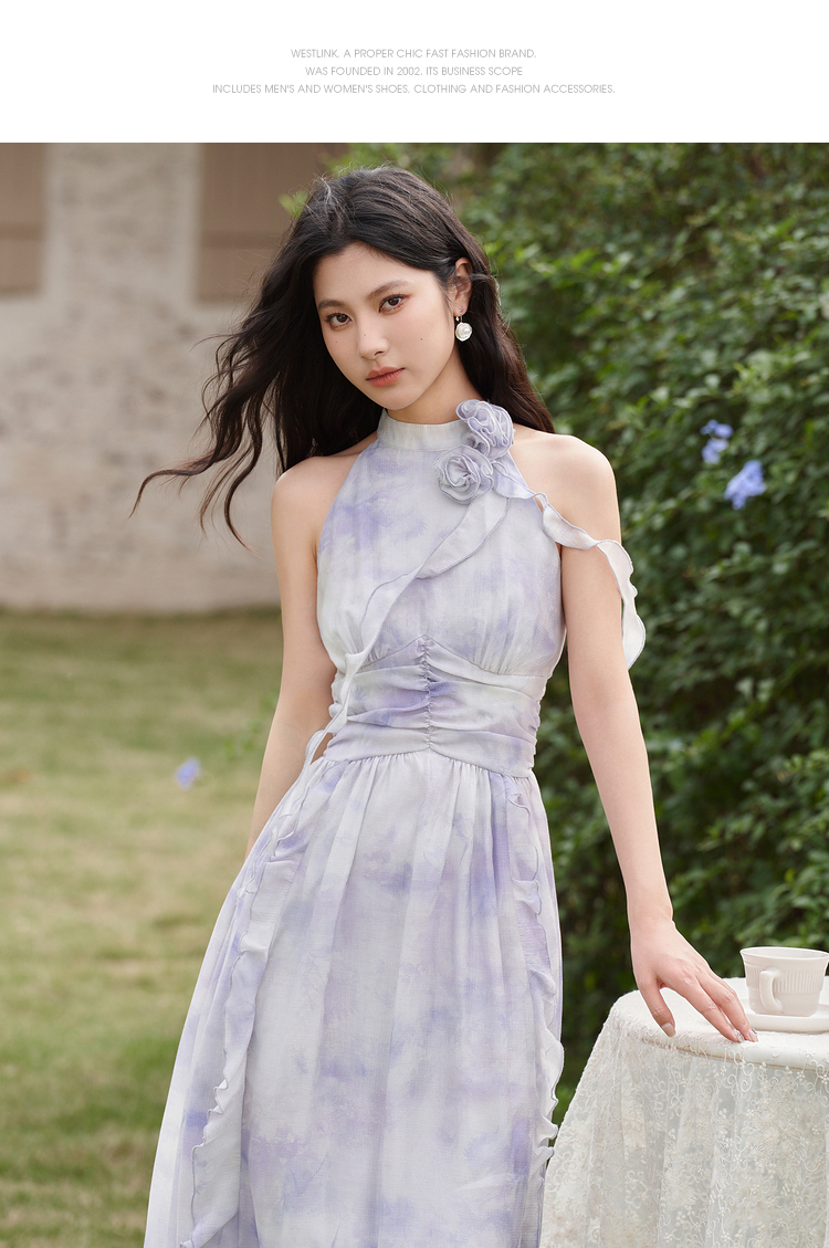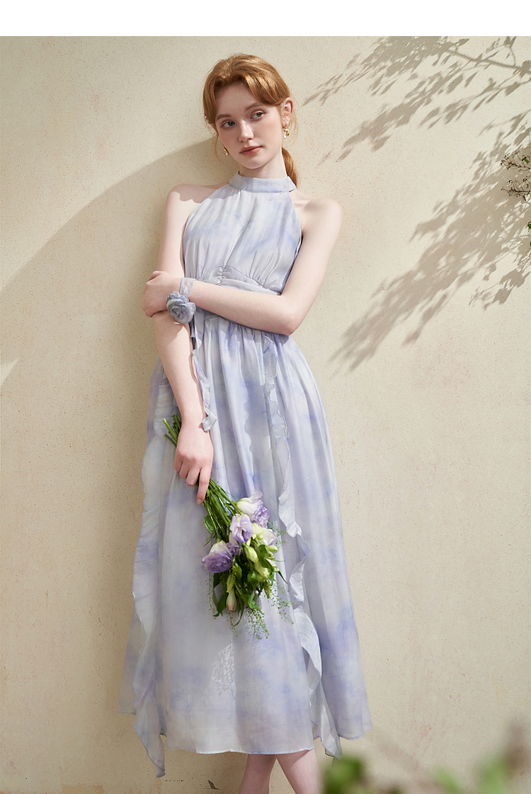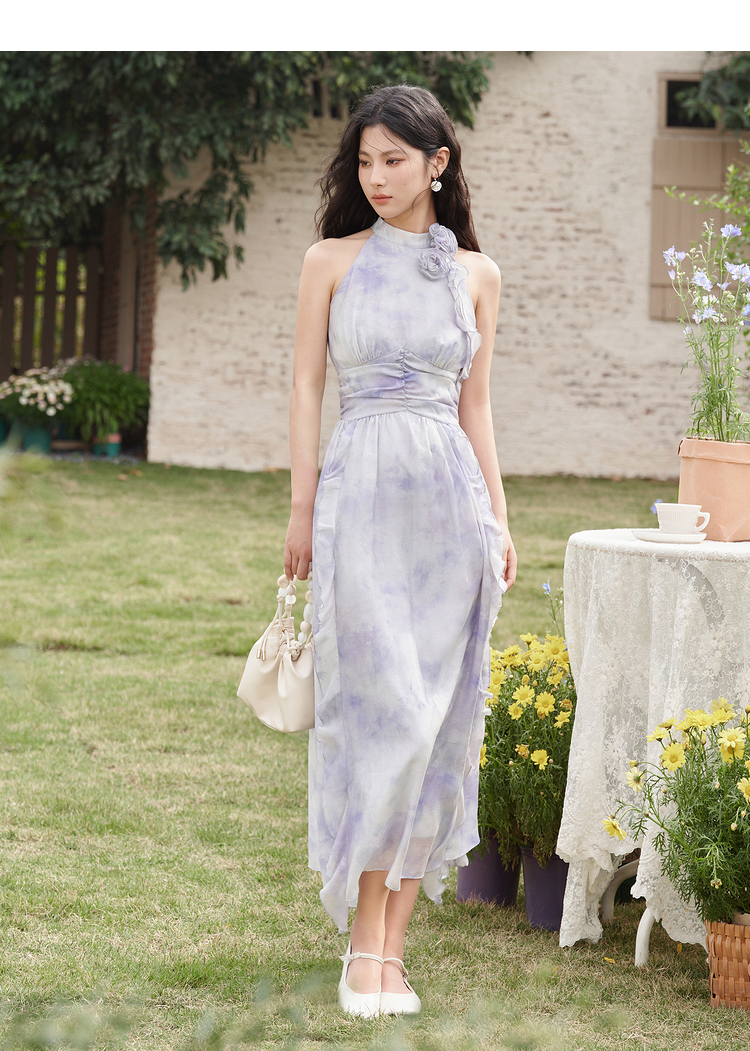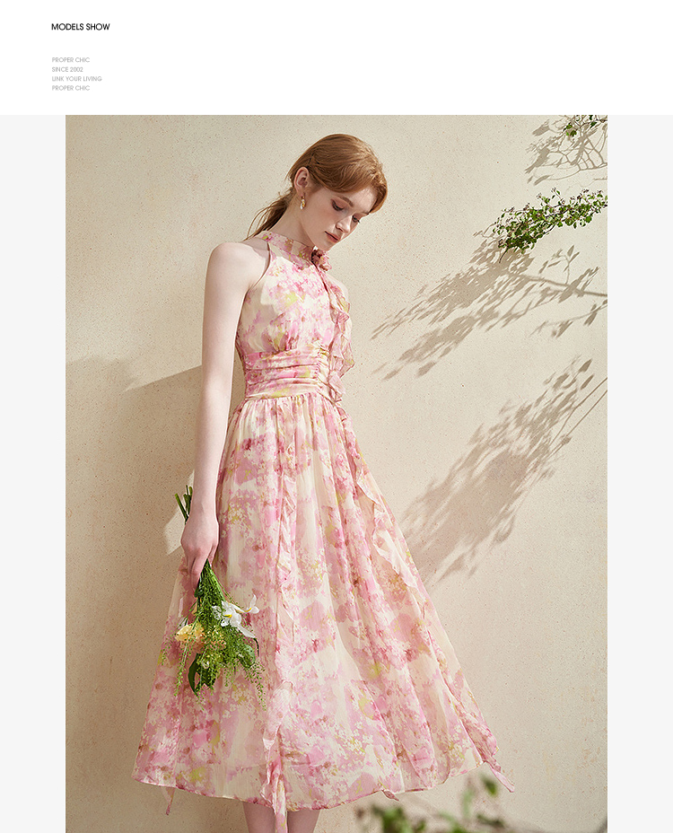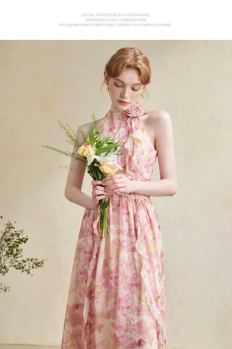 优雅挂脖荷叶边碎花连衣裙新款立领无袖A字型长裙V0740512