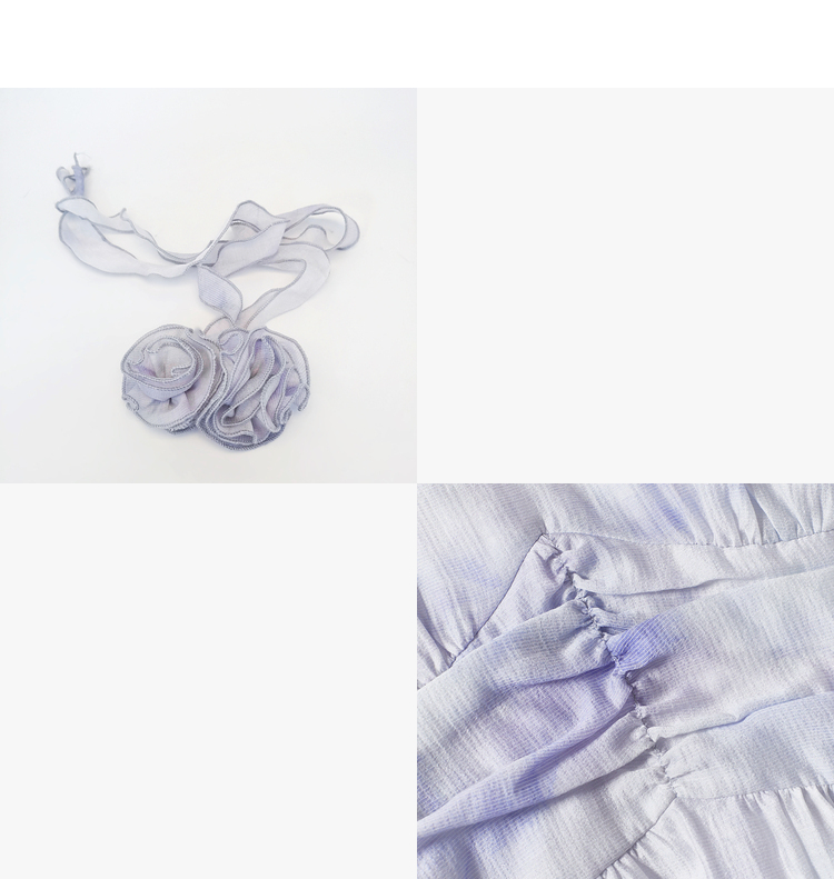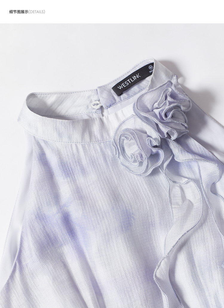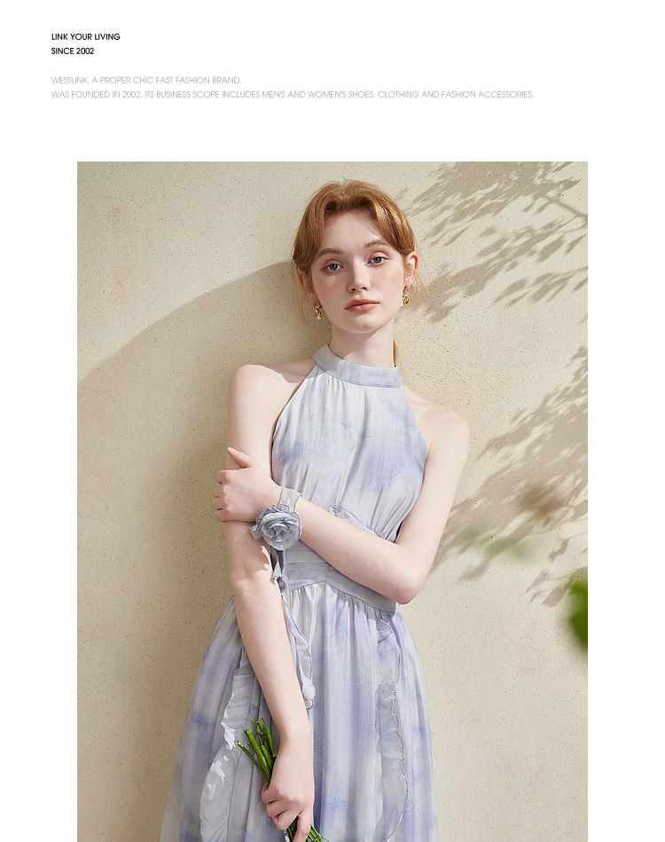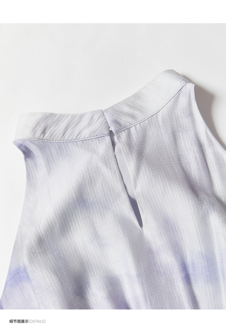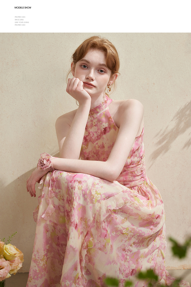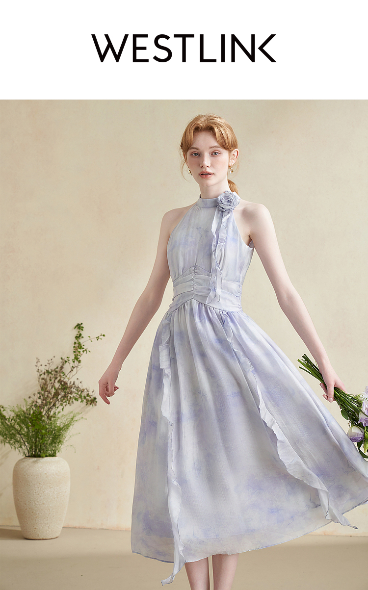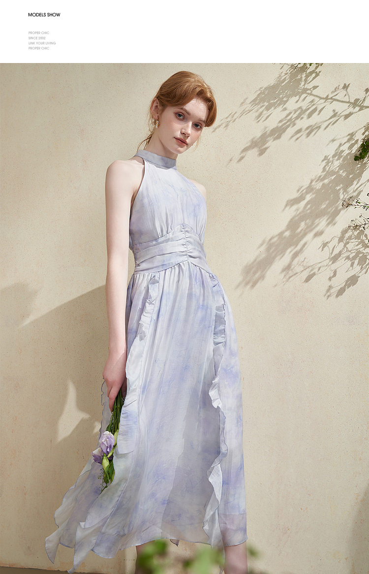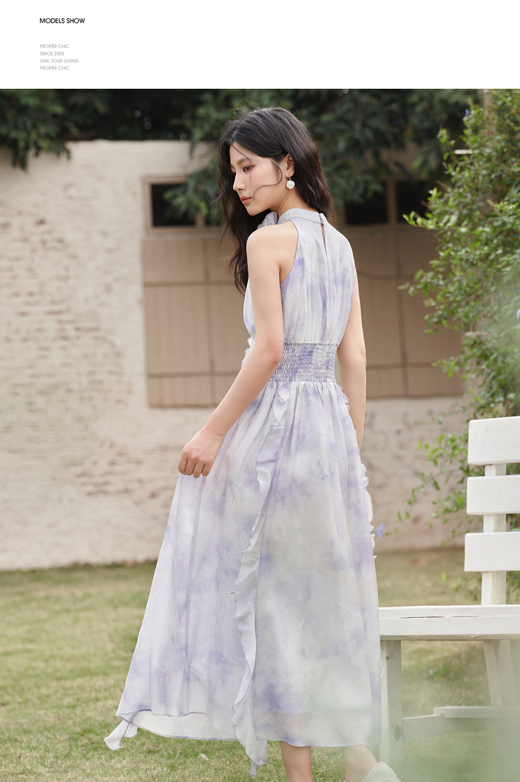 优雅挂脖荷叶边碎花连衣裙新款立领无袖A字型长裙V0740512