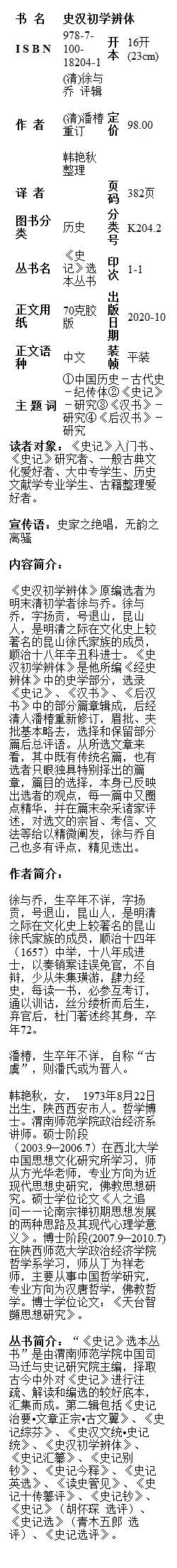 《史汉初学辨体》原编选者为明末清初学者徐与乔。徐与乔,字扬贡,号退山,昆山人,是明清之际在文化史上较著名的昆山徐氏家族的成员,顺治十八年辛丑科进士。《史汉初学辨体》是他所编《经史辨体》中的史学部分,选录《史记》、《汉书》、《后汉书》中的部分篇章辑成,后经清人潘椿重新修订,眉批、夹批基本略去,选择和保留部分篇后总评语。从所选文章来看,其中既有传统名篇,也有选者只眼独具特别择出的篇章,篇目的选择,本身已反映出选者的观点,每一篇中又圈点精华,并在篇末杂采诸家评述,对选文的宗旨、考信、文法等给以精微阐发,徐与乔自己也多有评点,精见迭出。