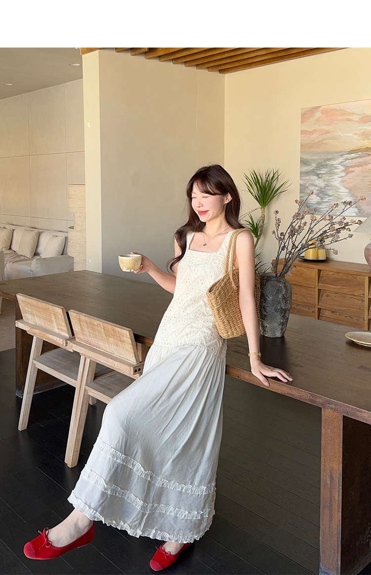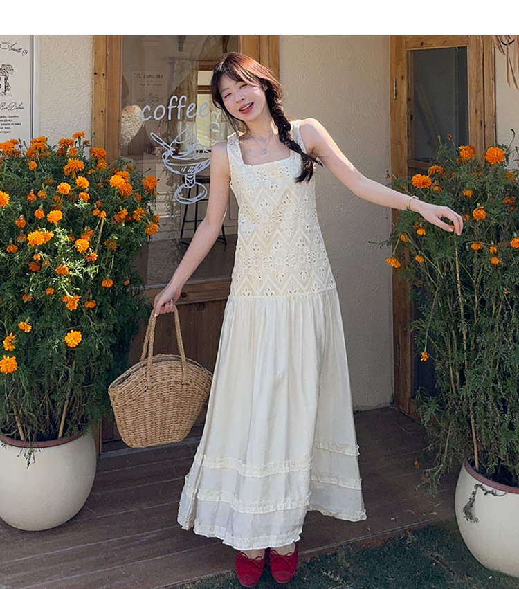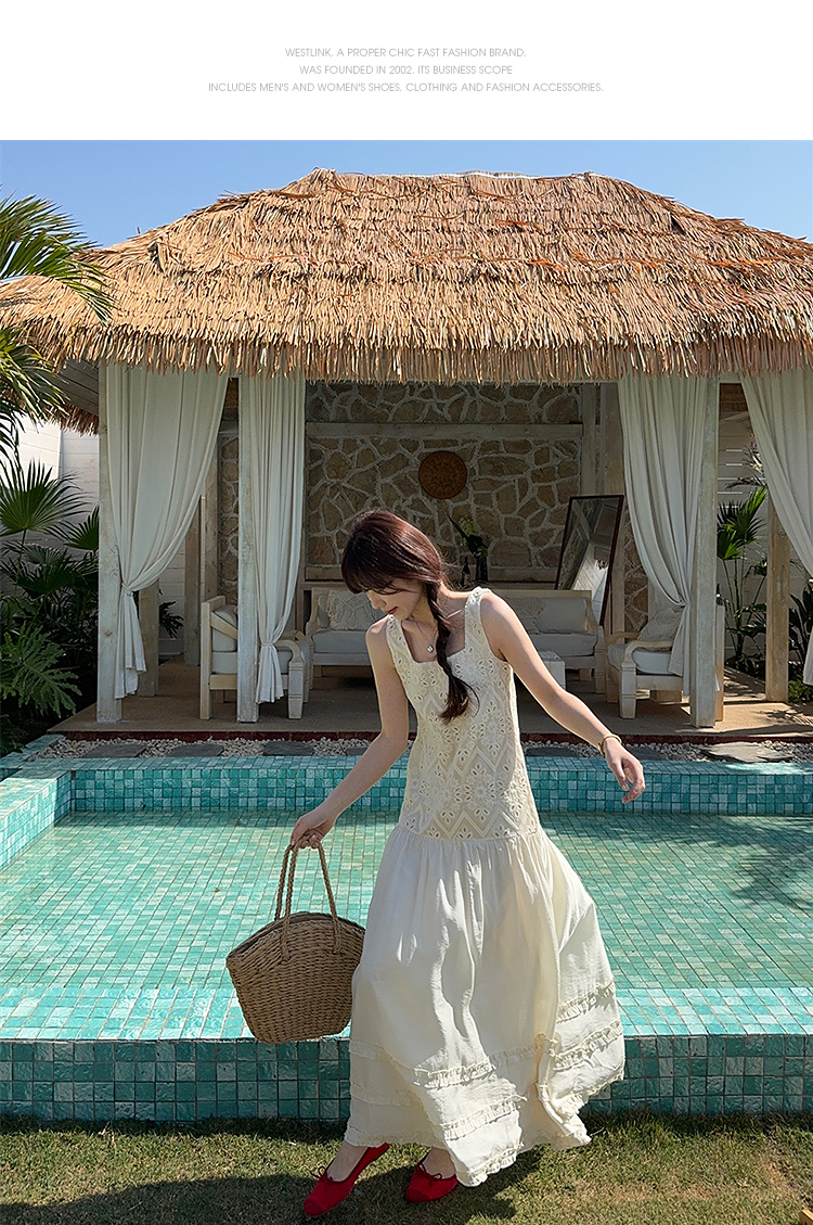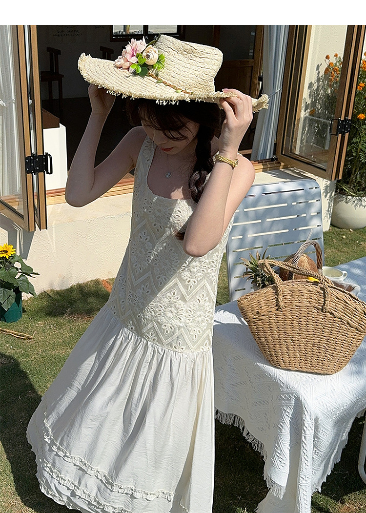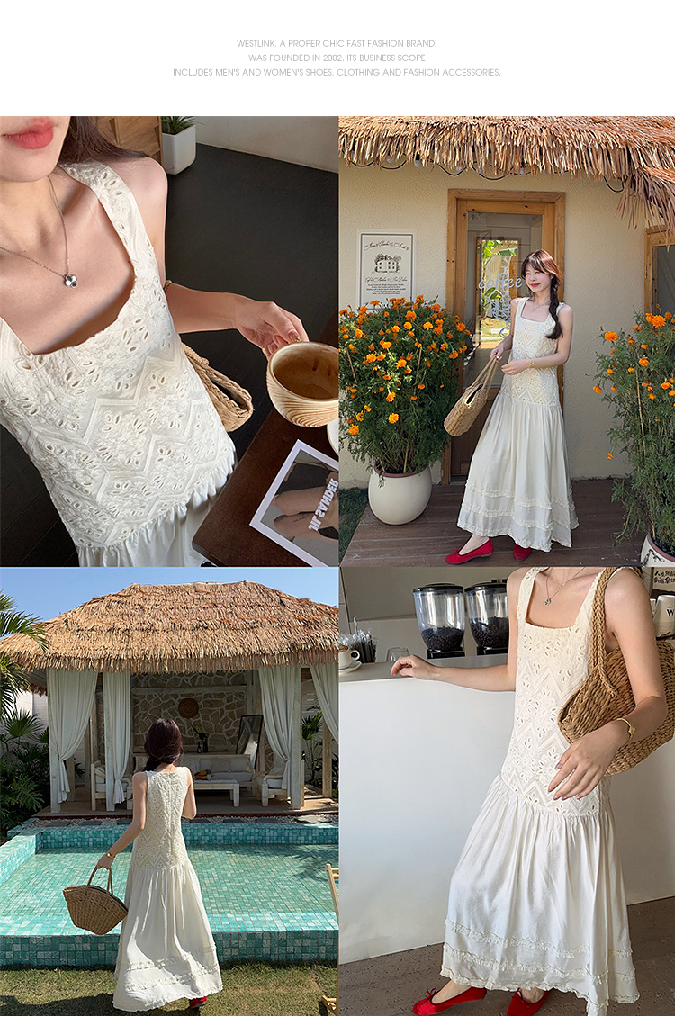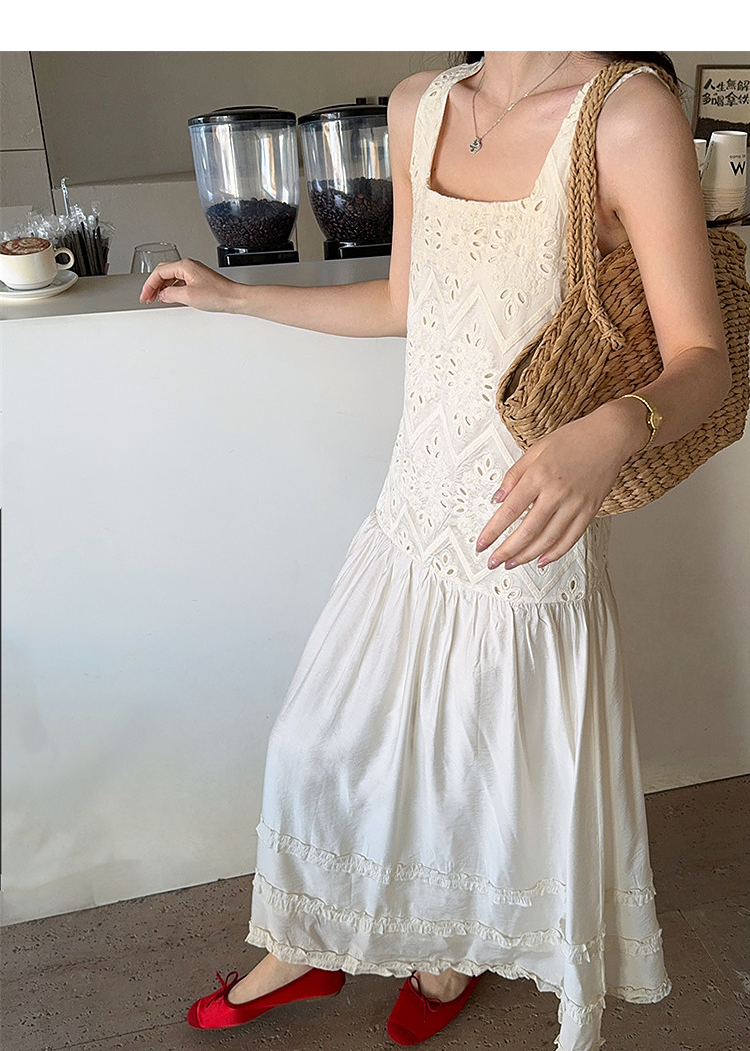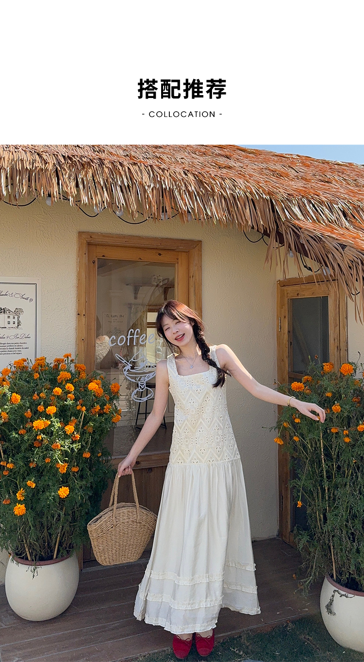 西遇法式吊带连衣裙女春夏新款杏色方领a字收腰度假风长裙SS150317