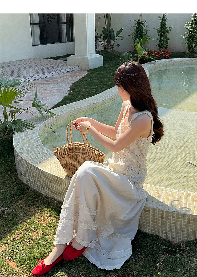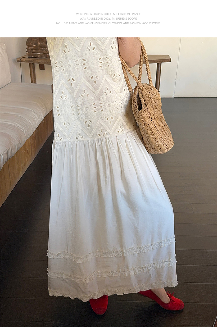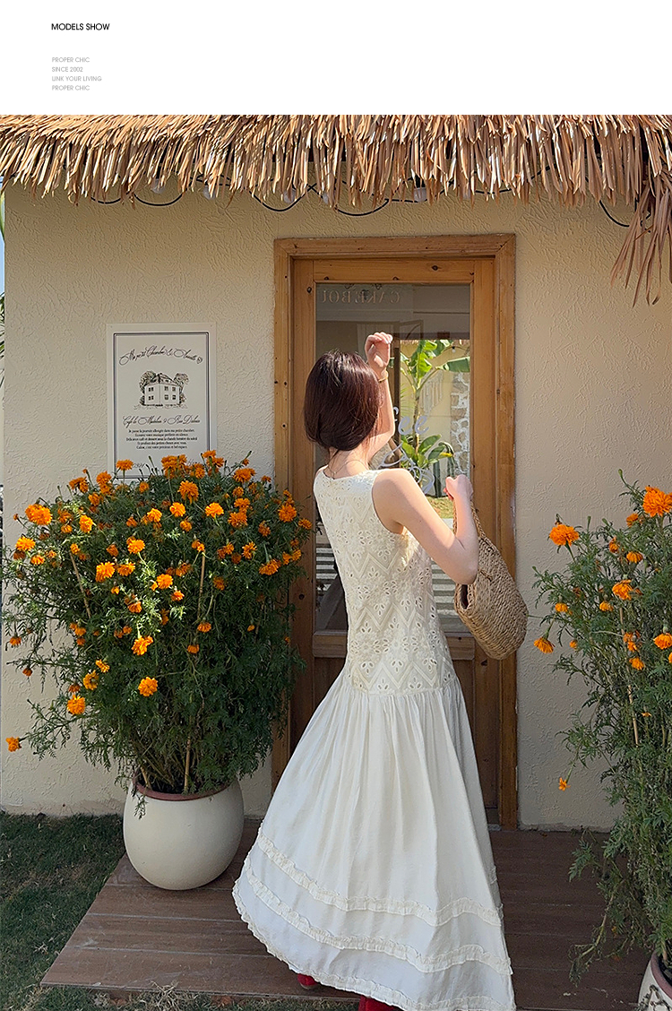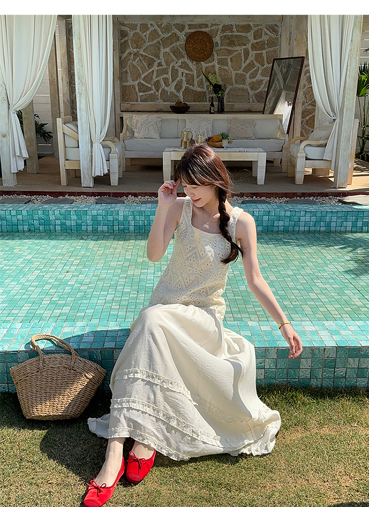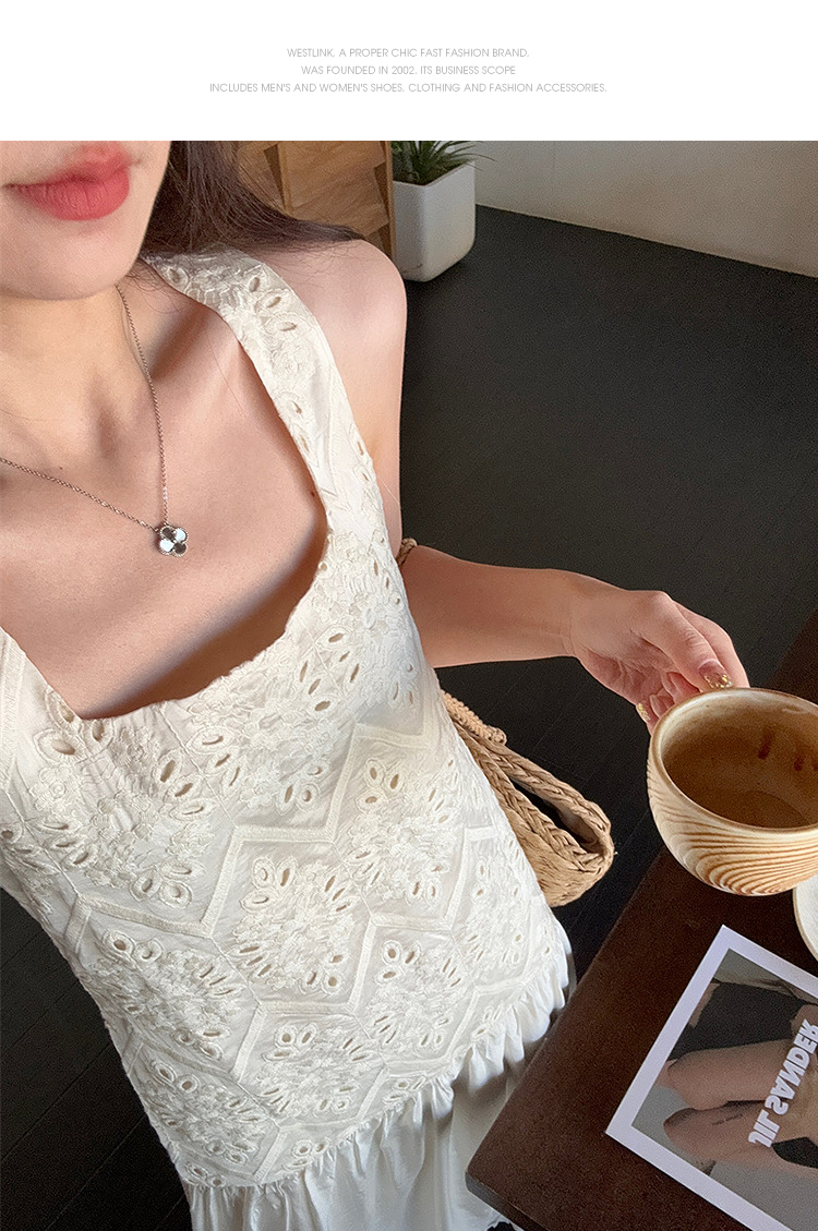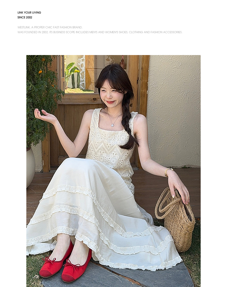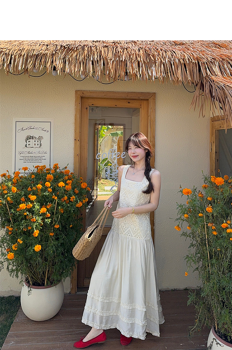 西遇法式吊带连衣裙女春夏新款杏色方领a字收腰度假风长裙SS150317