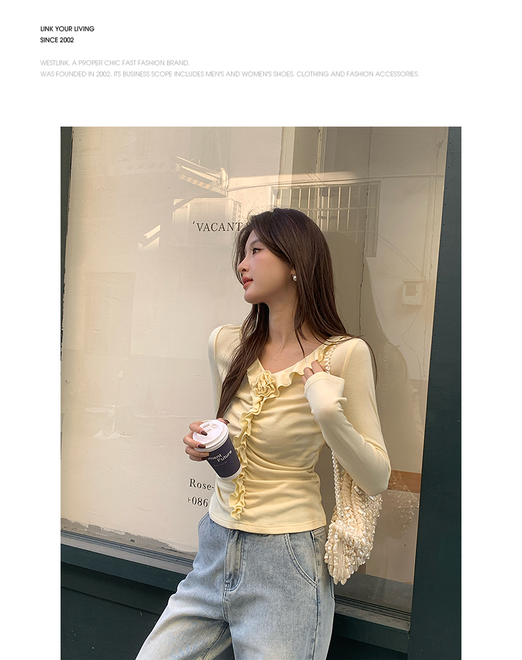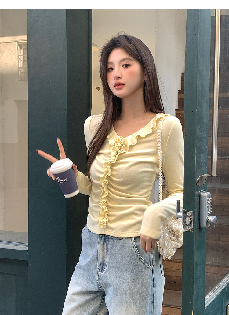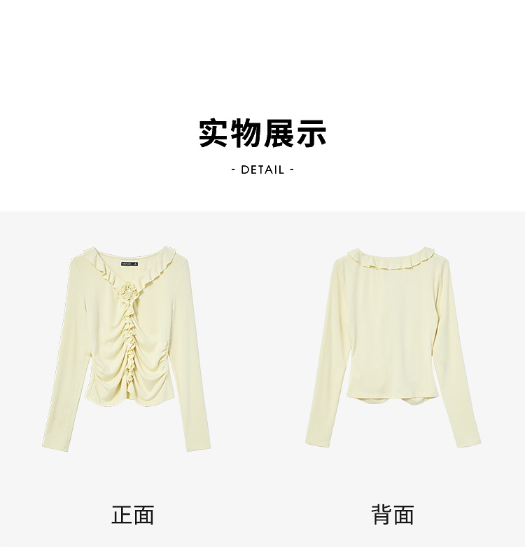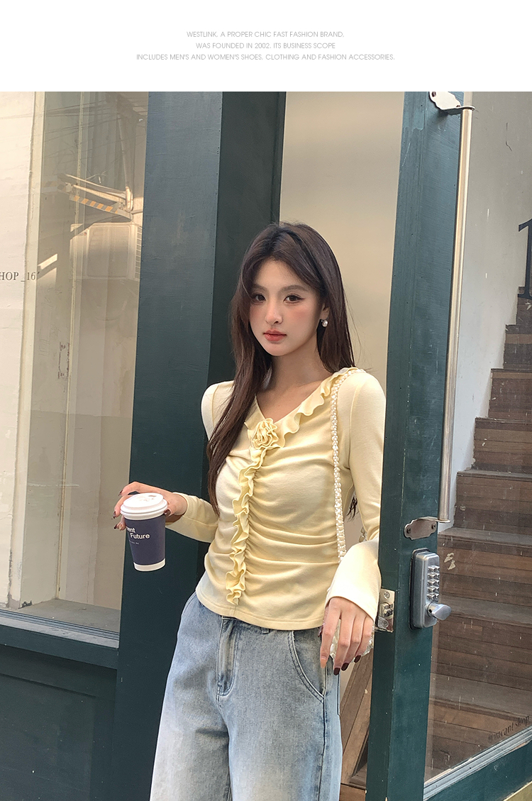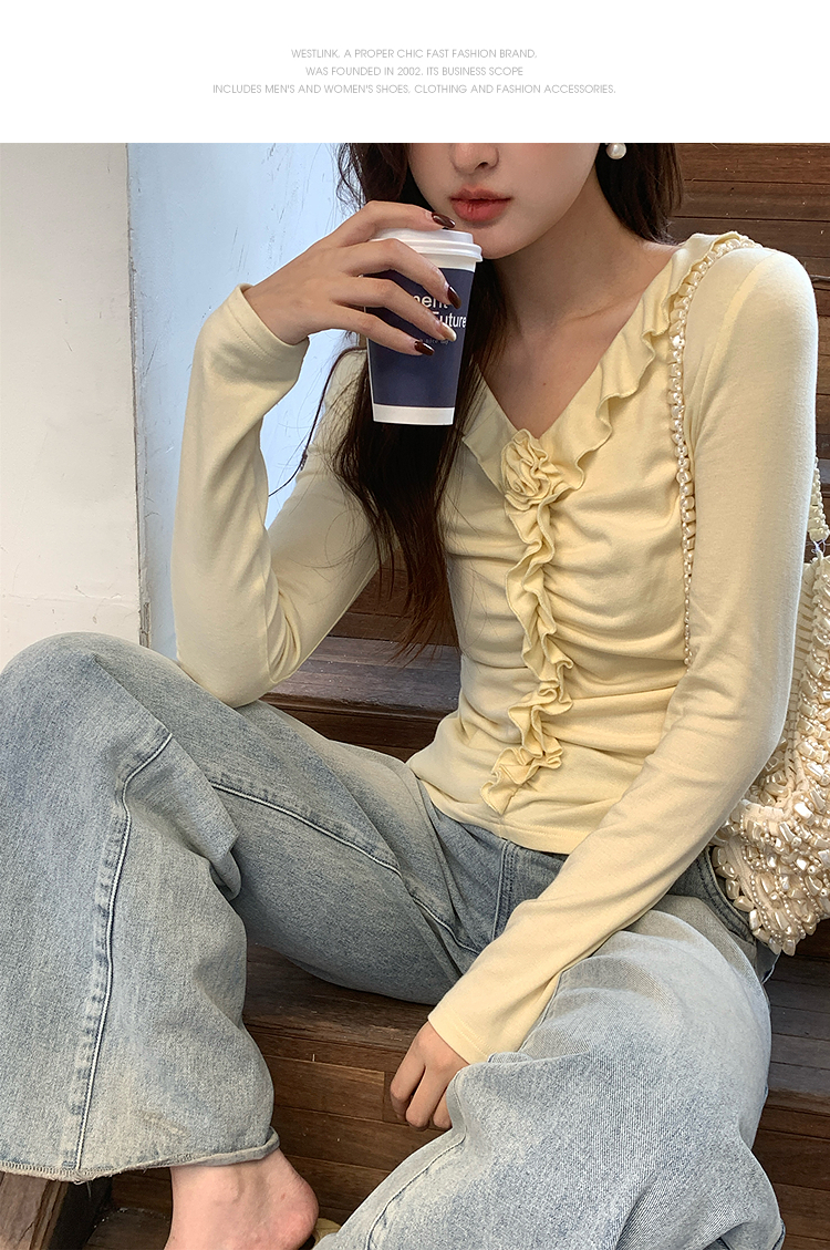 【春日明媚】玫瑰花拼接荷叶边收腰V领针织衫女上衣V0450191