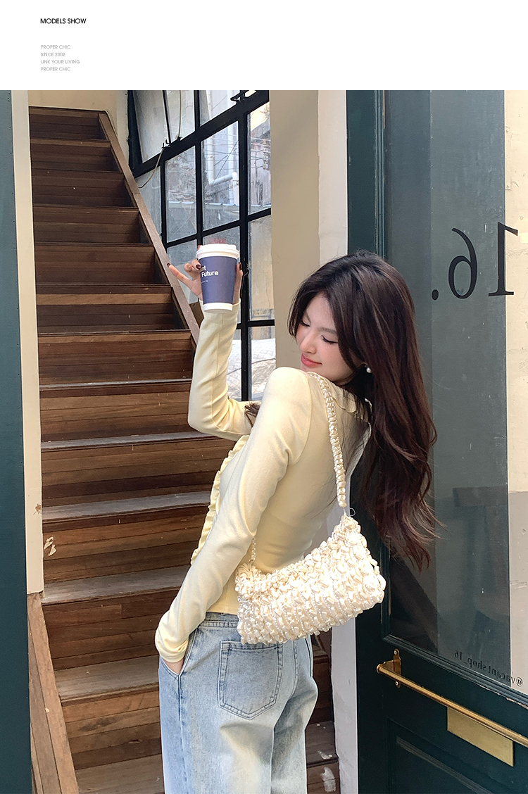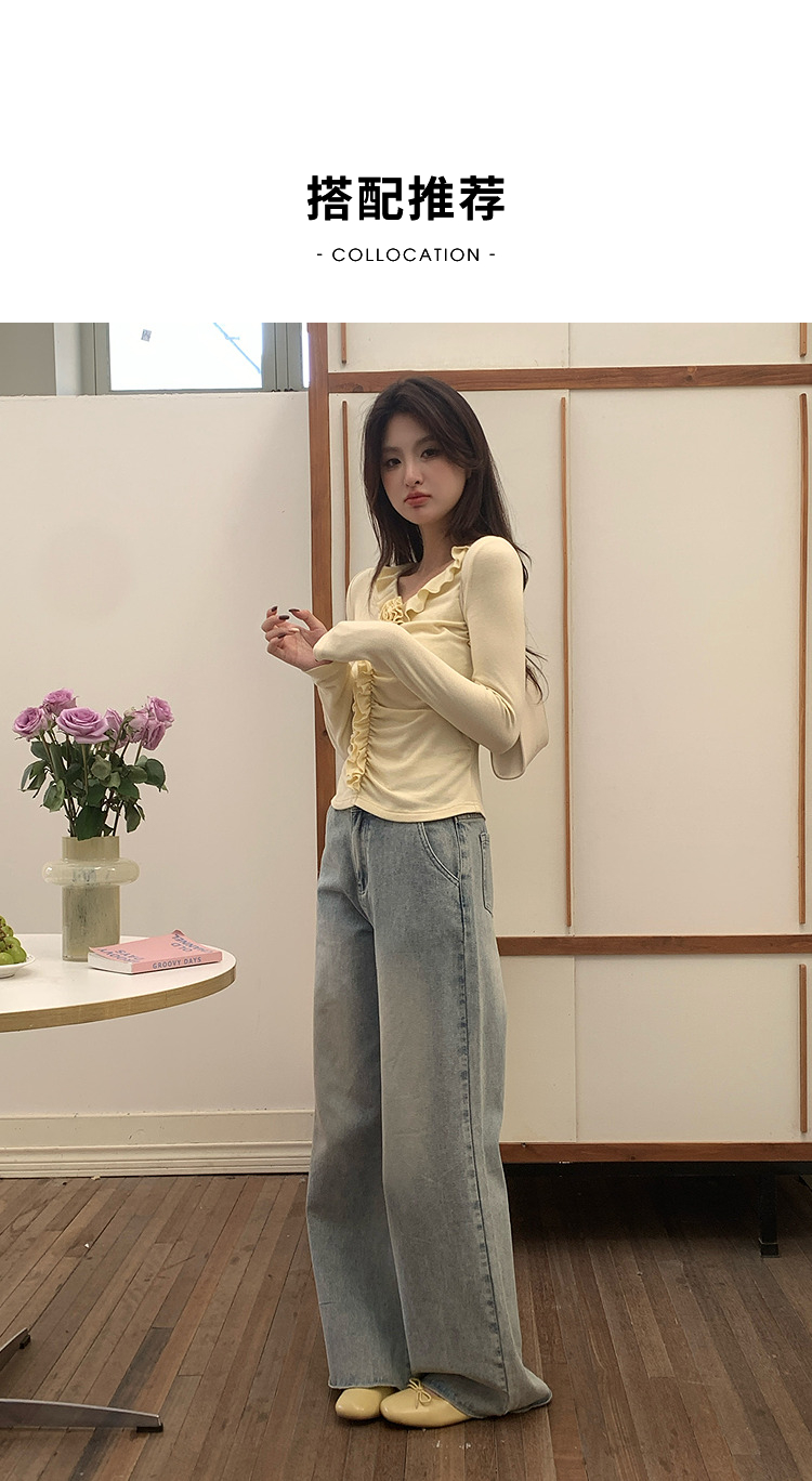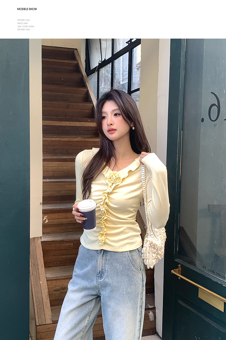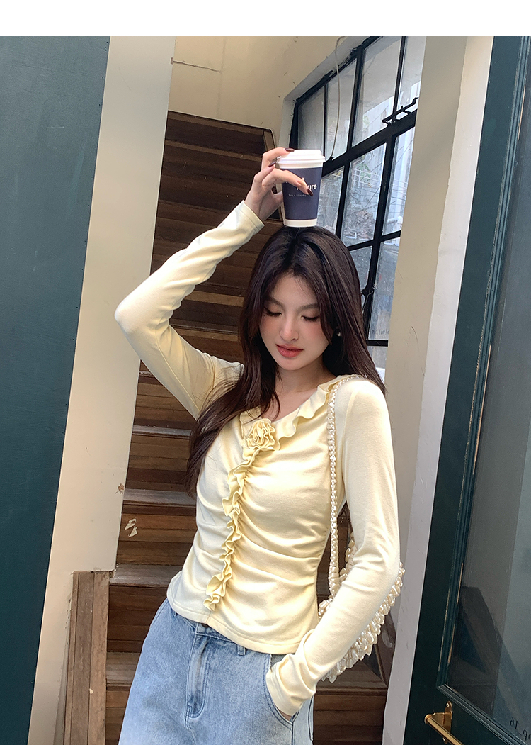 【春日明媚】玫瑰花拼接荷叶边收腰V领针织衫女上衣V0450191