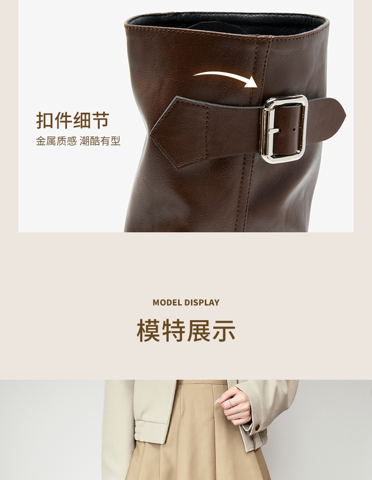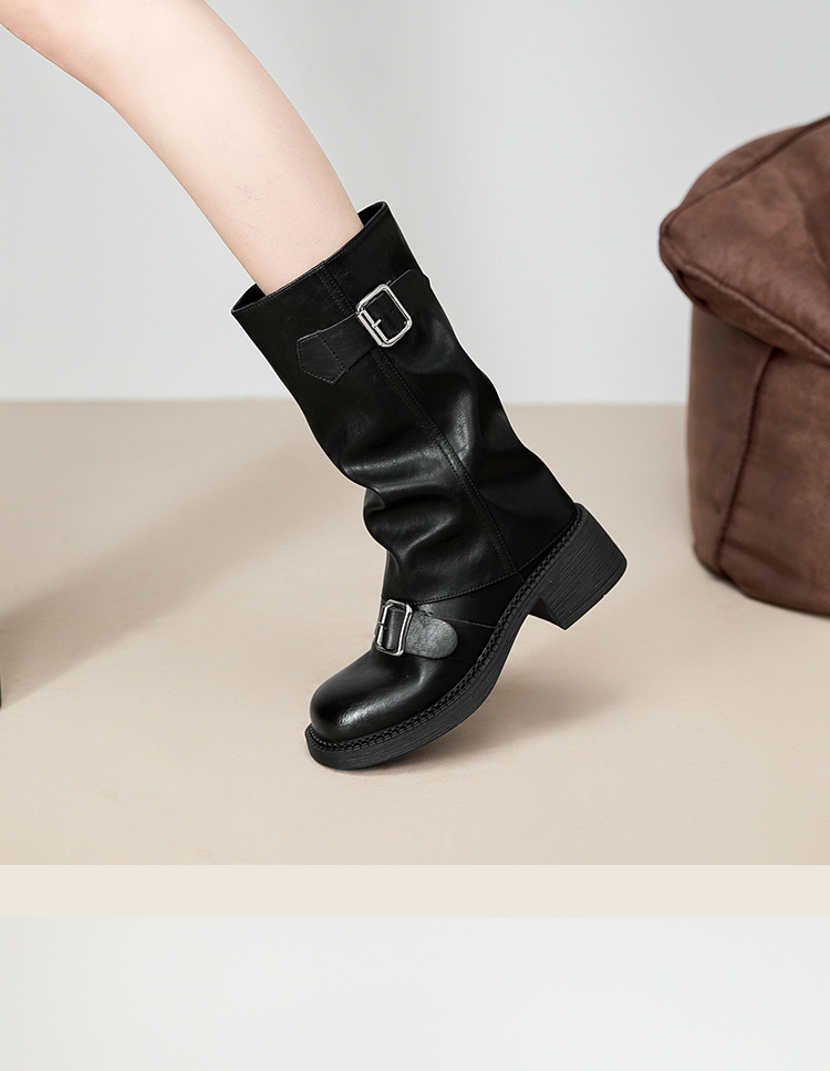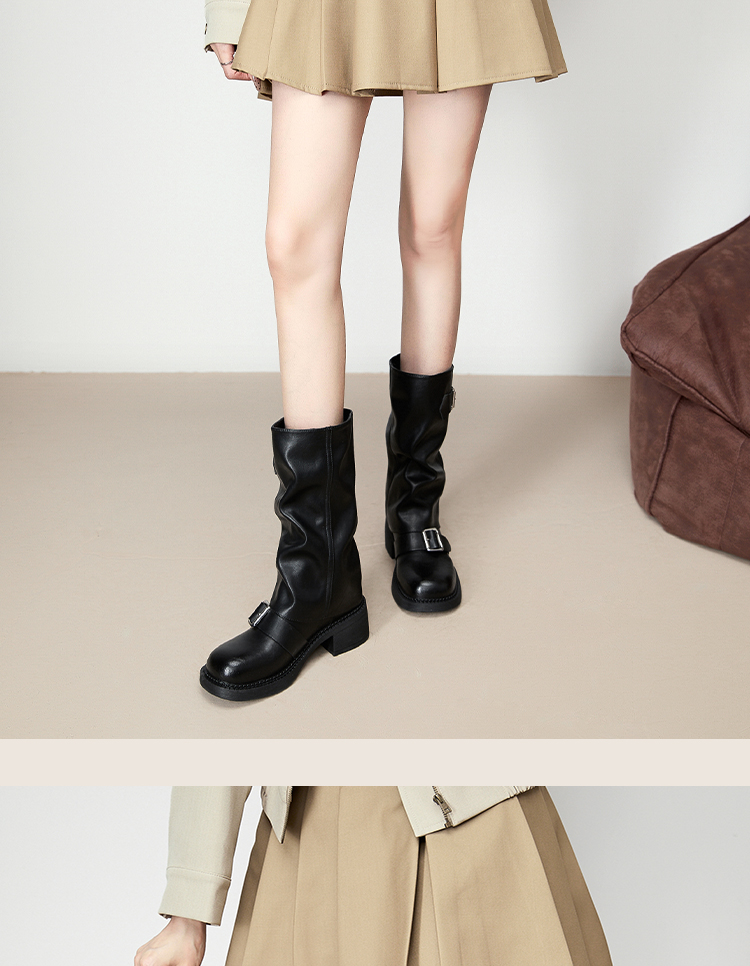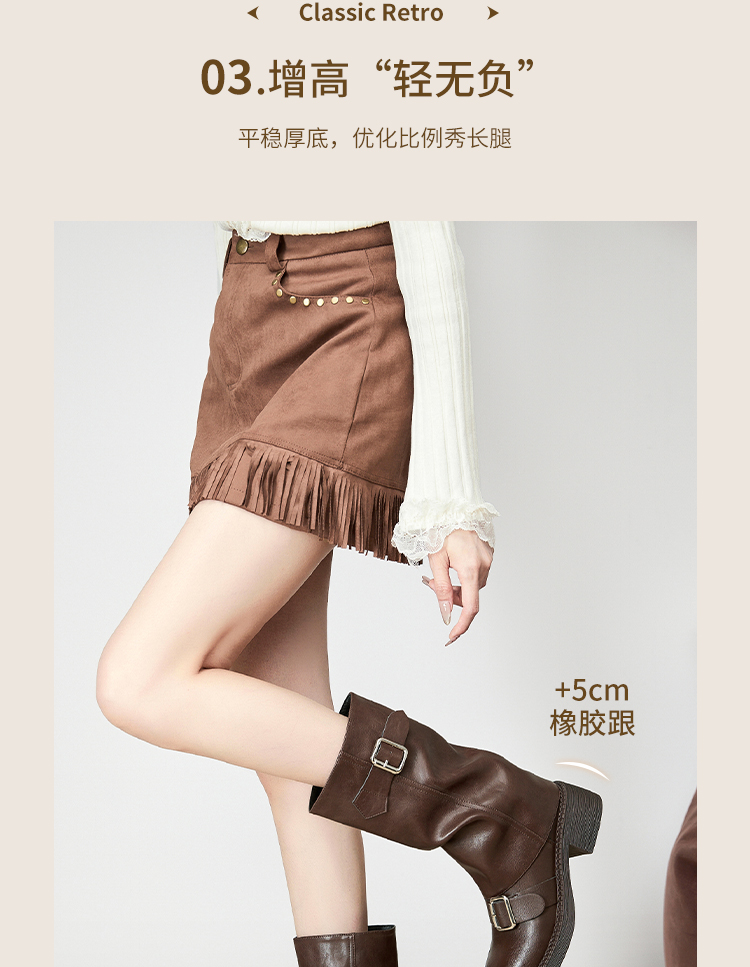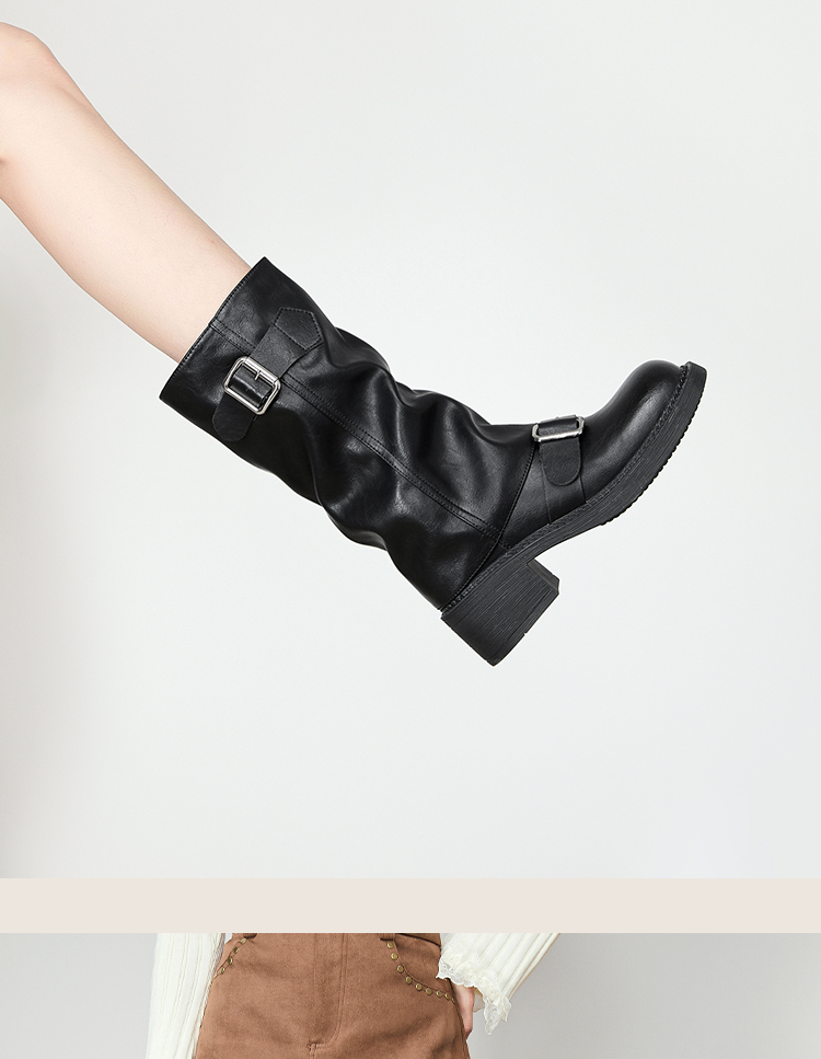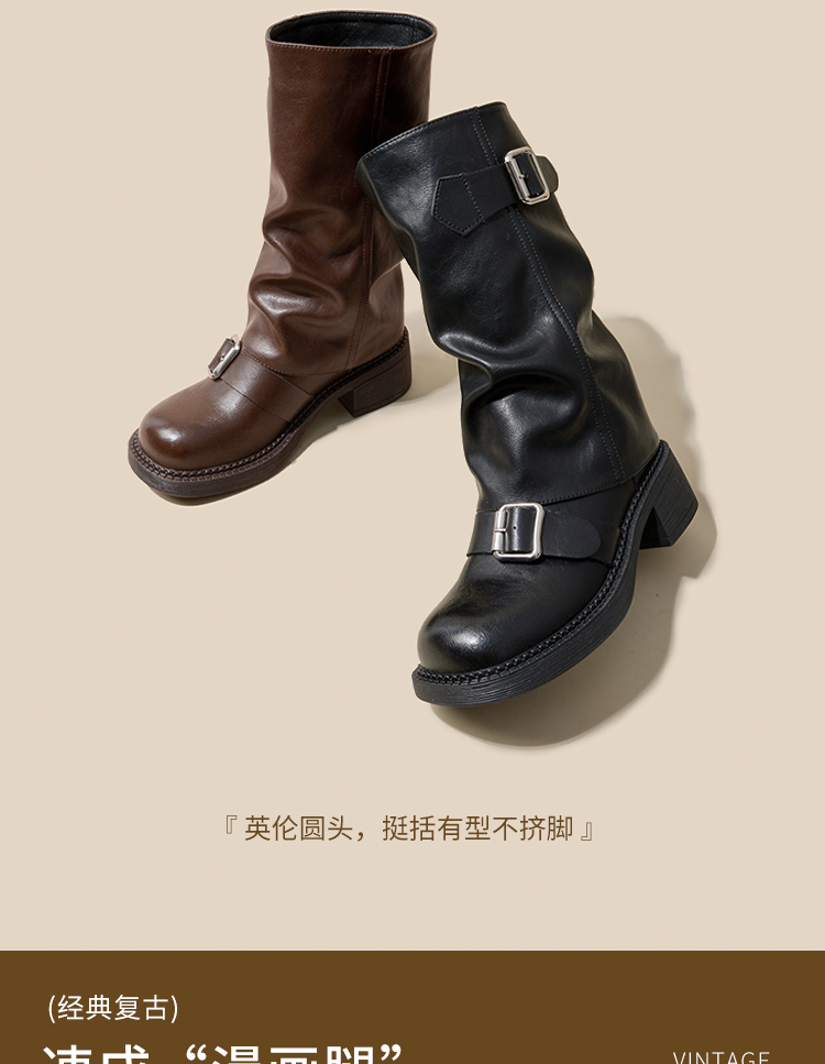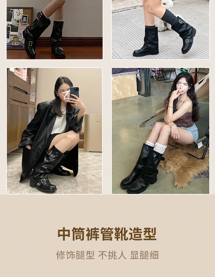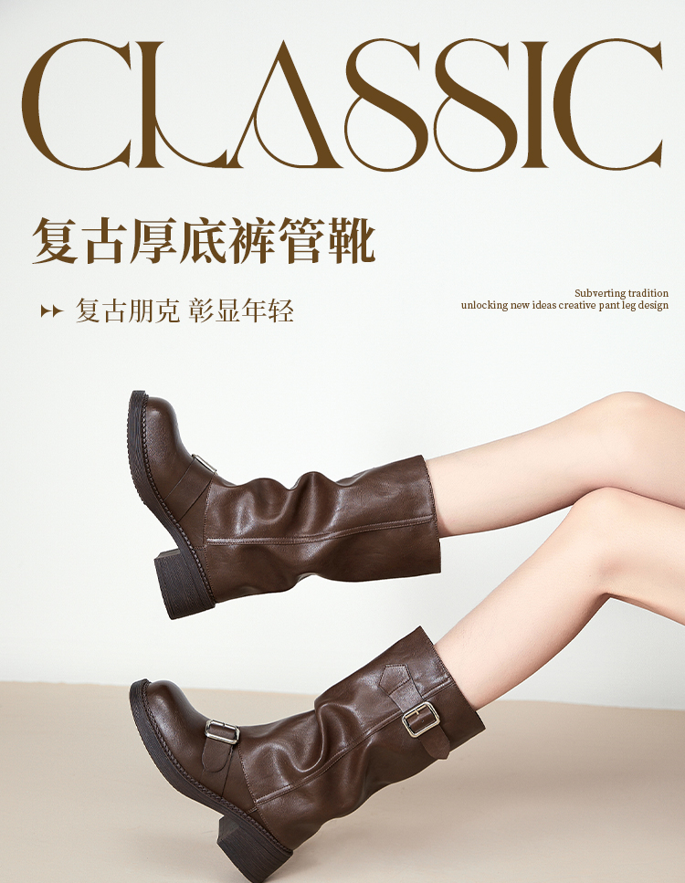 西遇复古裤管靴女新款秋冬西部牛仔堆堆靴小个子厚底中筒靴子D3947700