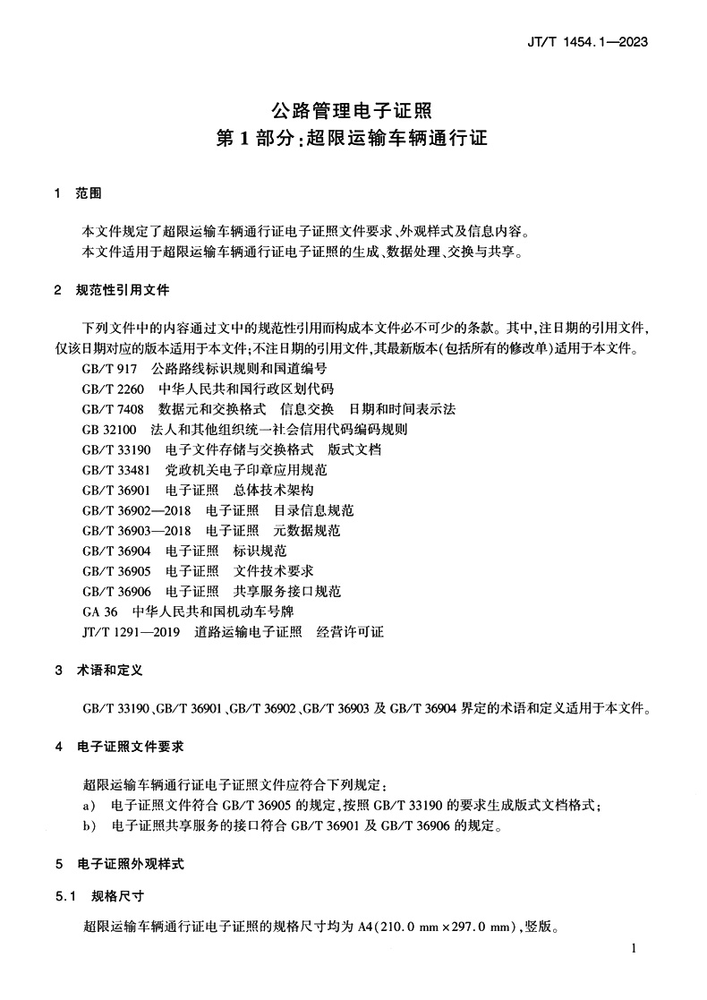 书名:公路管理电子证照 第1部分:超限运输车辆通行证(JT/T 1454.1—2023)