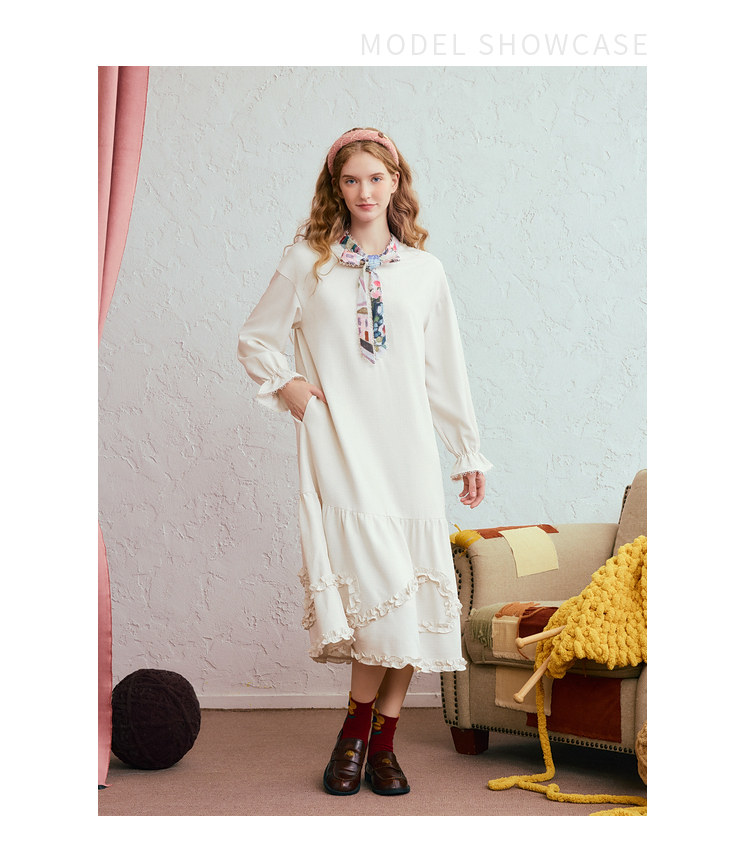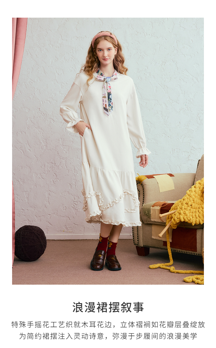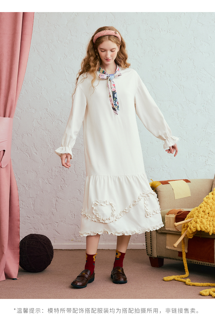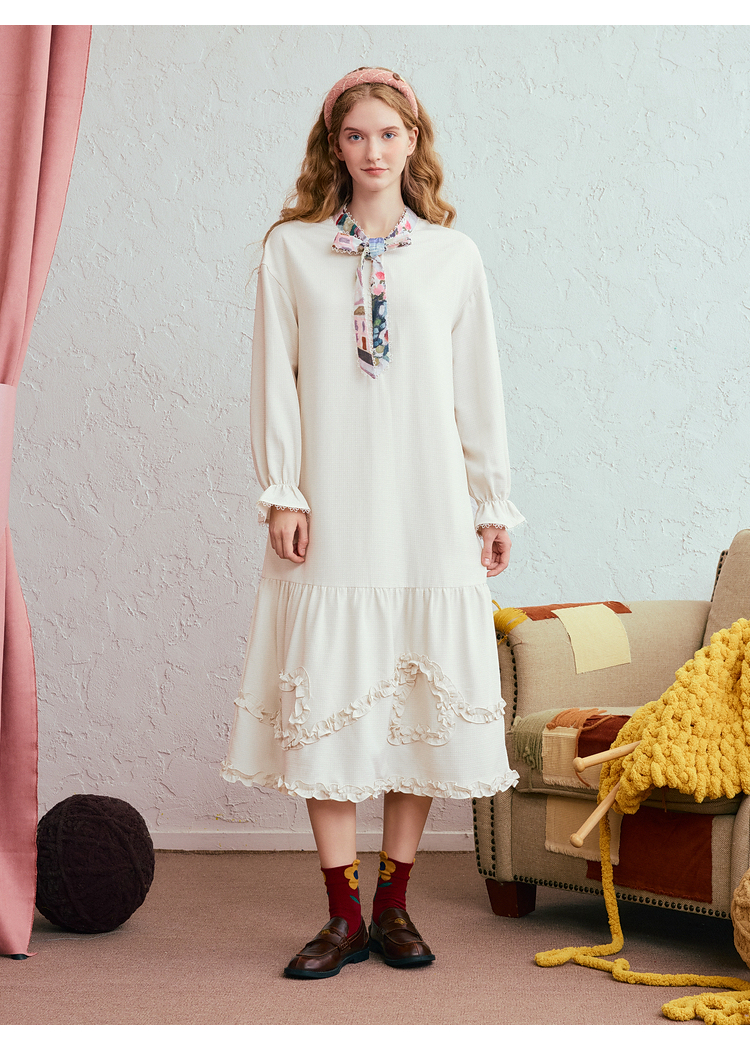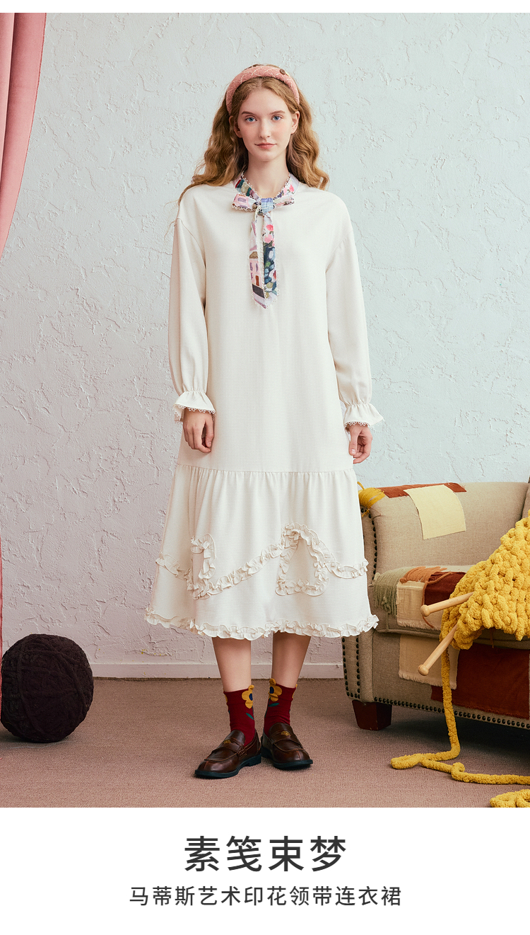 两三事 素笺束梦 2025冬季新款复古印花领带木耳边裙摆连衣裙长裙