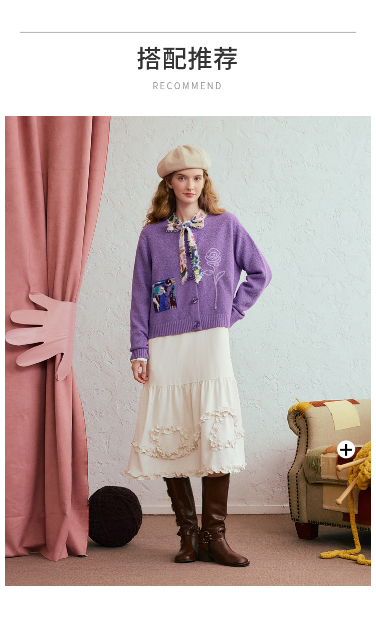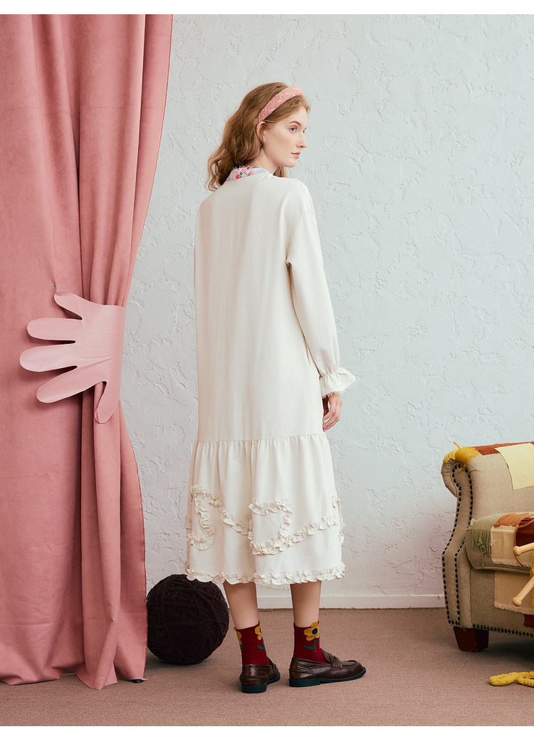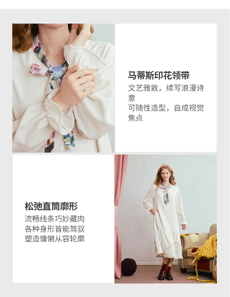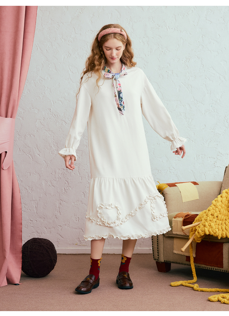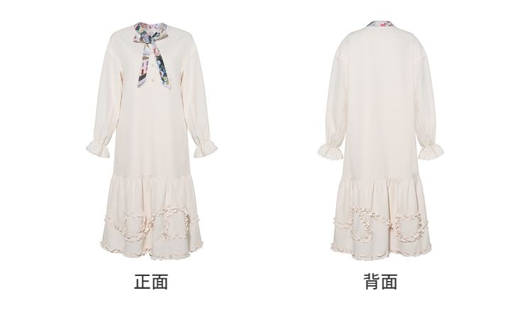 两三事 素笺束梦 2025冬季新款复古印花领带木耳边裙摆连衣裙长裙