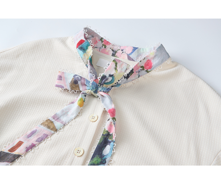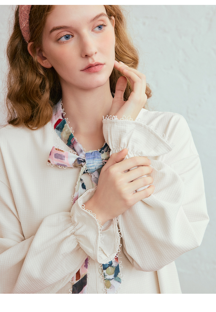 两三事梵高文艺春日序言2025春季新款蕾丝拼接荷叶边领绑带上衣女S25CLS342