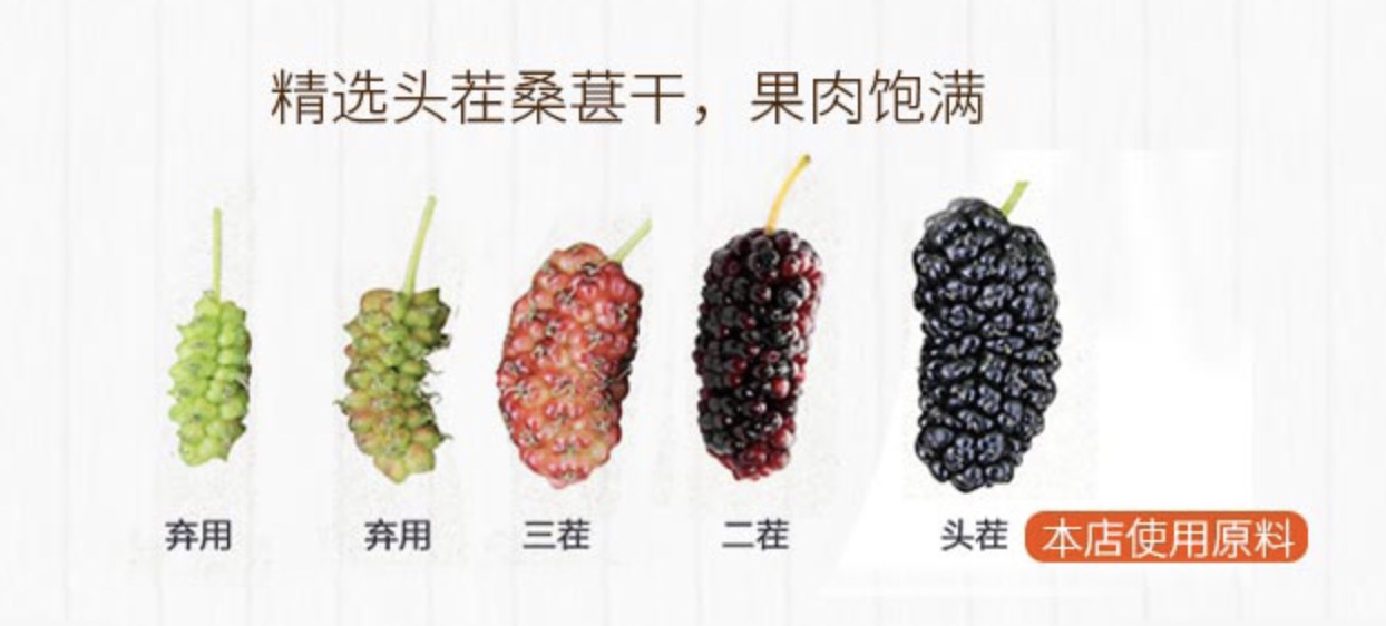 2.大多来自10~20多年树龄的老桑葚树,都是手工采摘的头茬桑葚。和2年结果的桑葚树相比,老树更高大、粗壮,结出来的桑葚更加甘甜、色泽更黑,营养价值也更高。