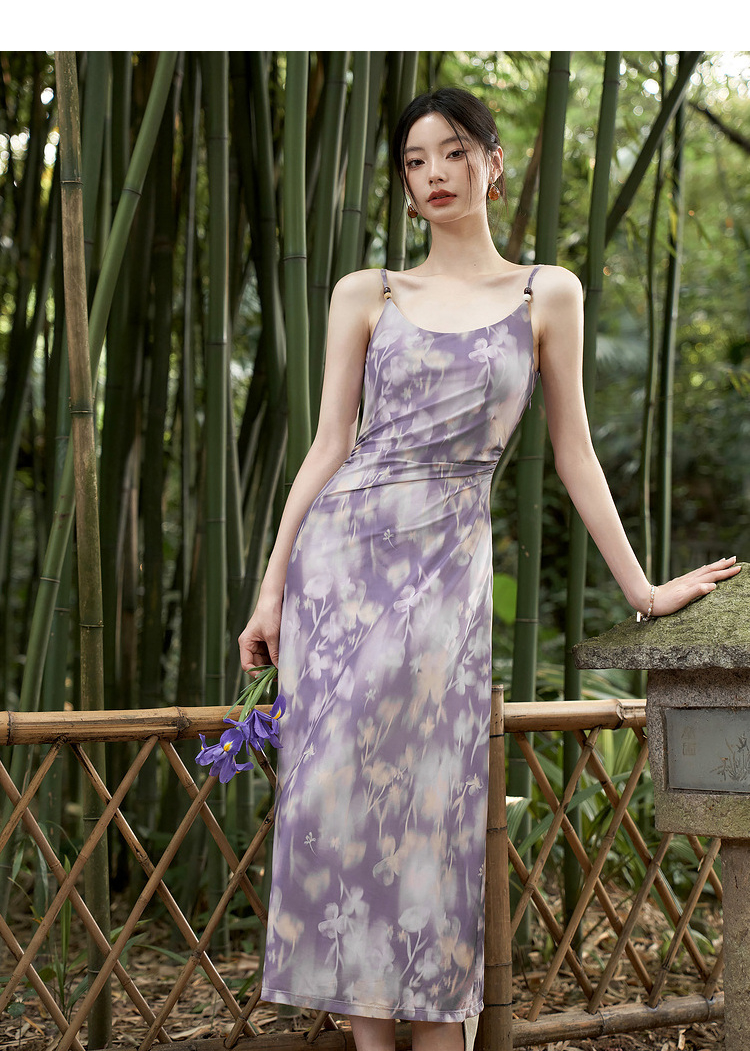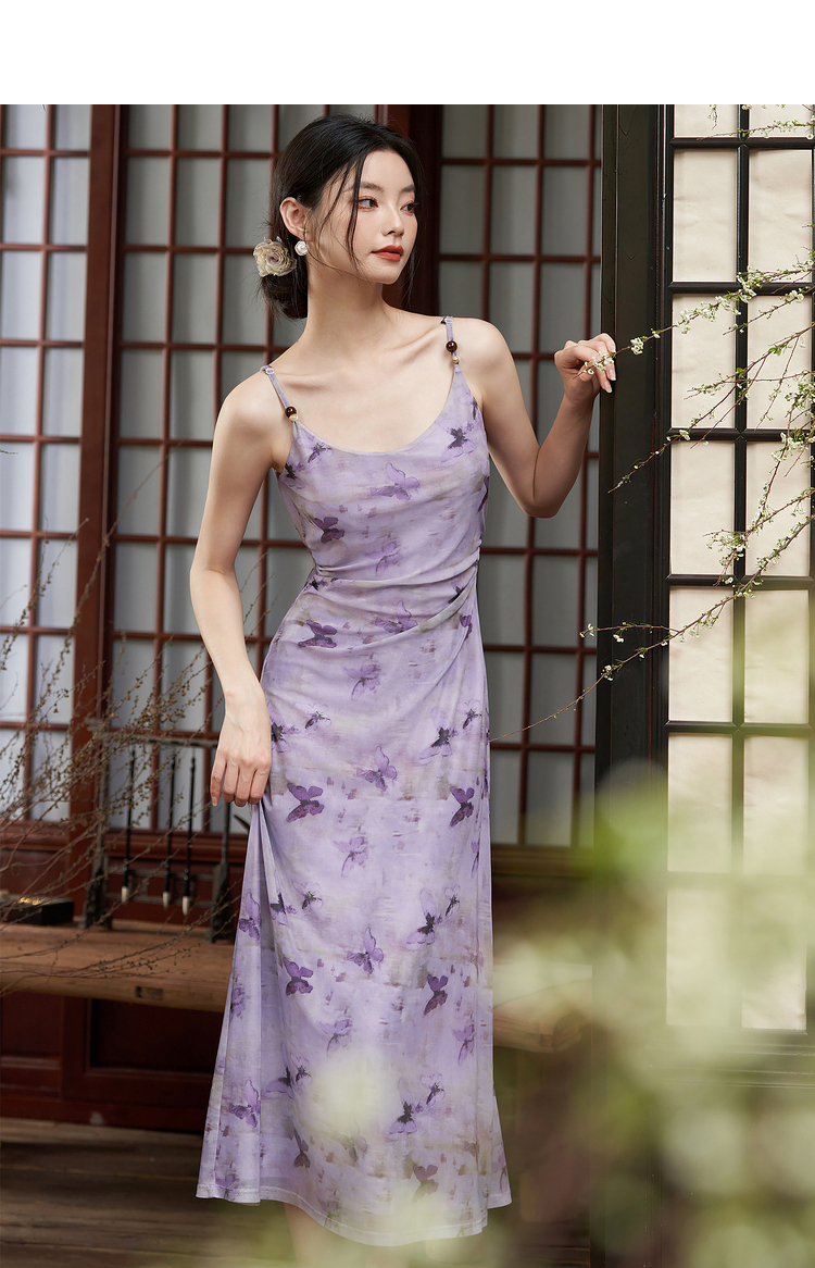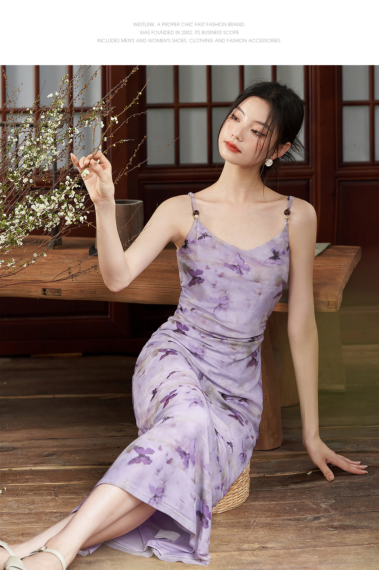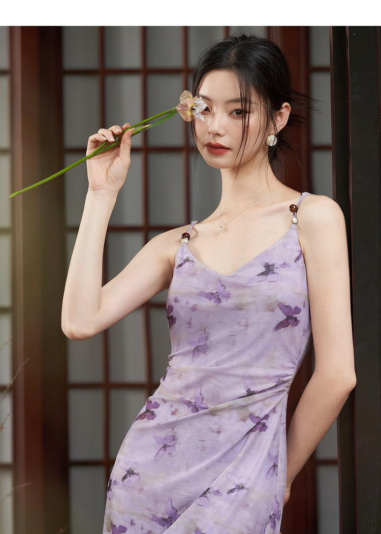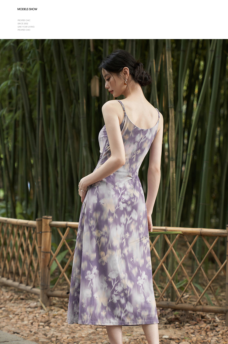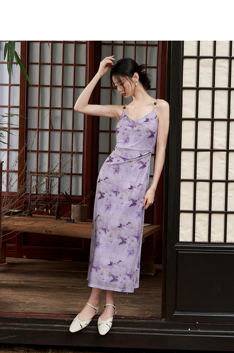 法式浪漫晕染蝴蝶花卉印花针织连衣裙女夏季吊带连衣裙V2141782