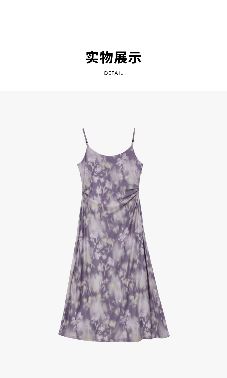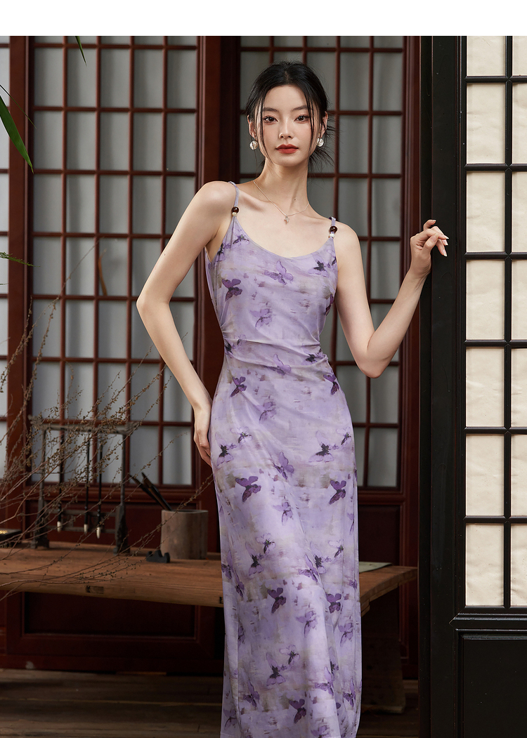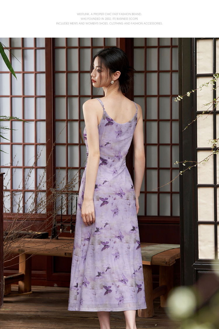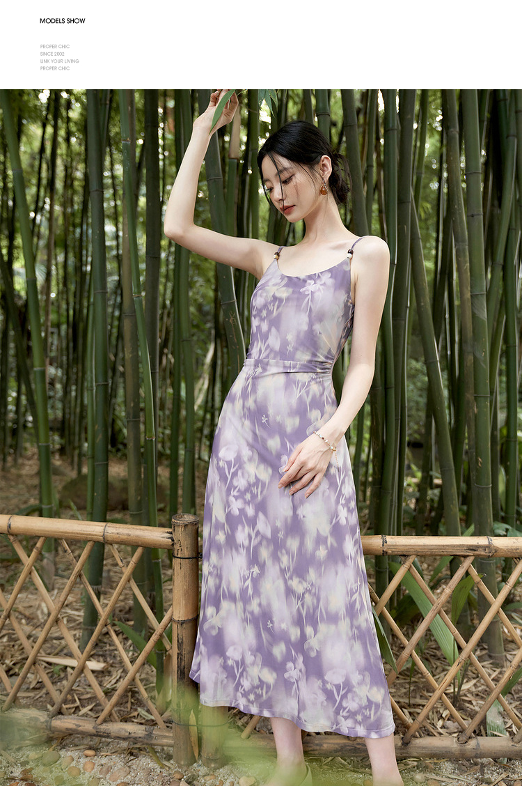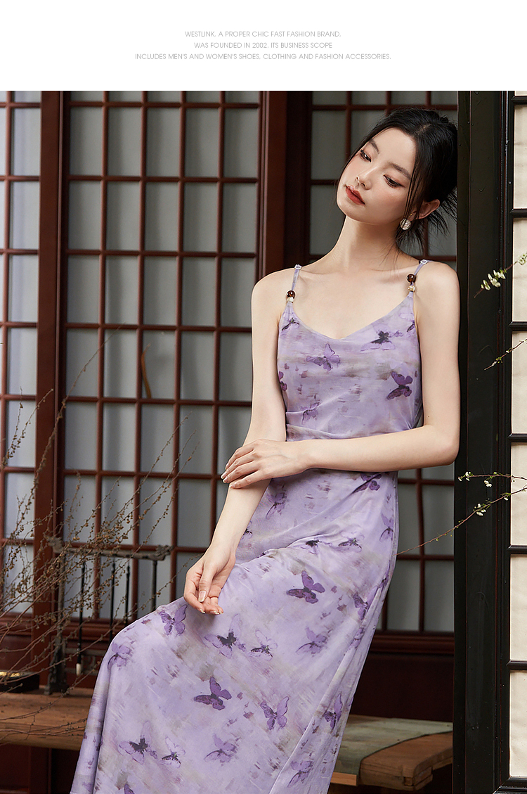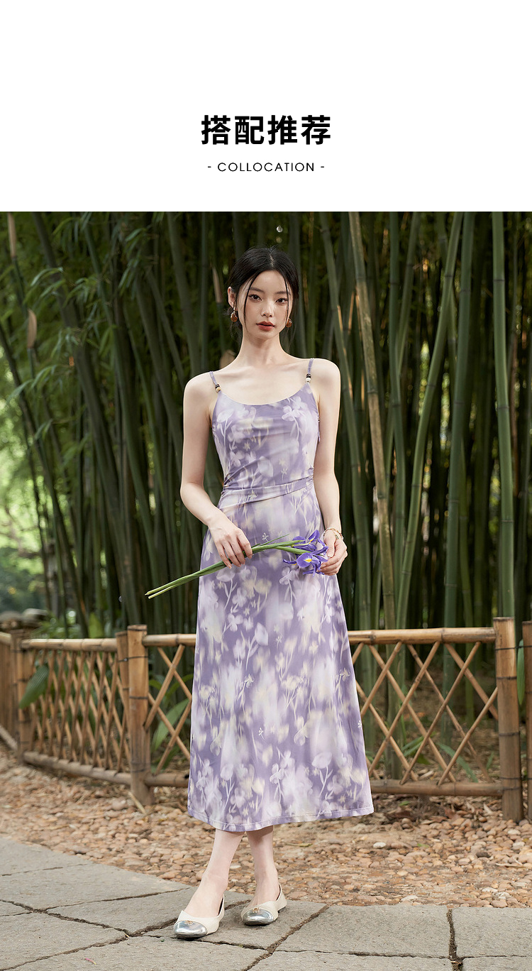 法式浪漫晕染蝴蝶花卉印花针织连衣裙女夏季吊带连衣裙V2141782