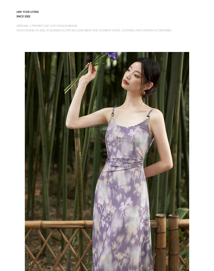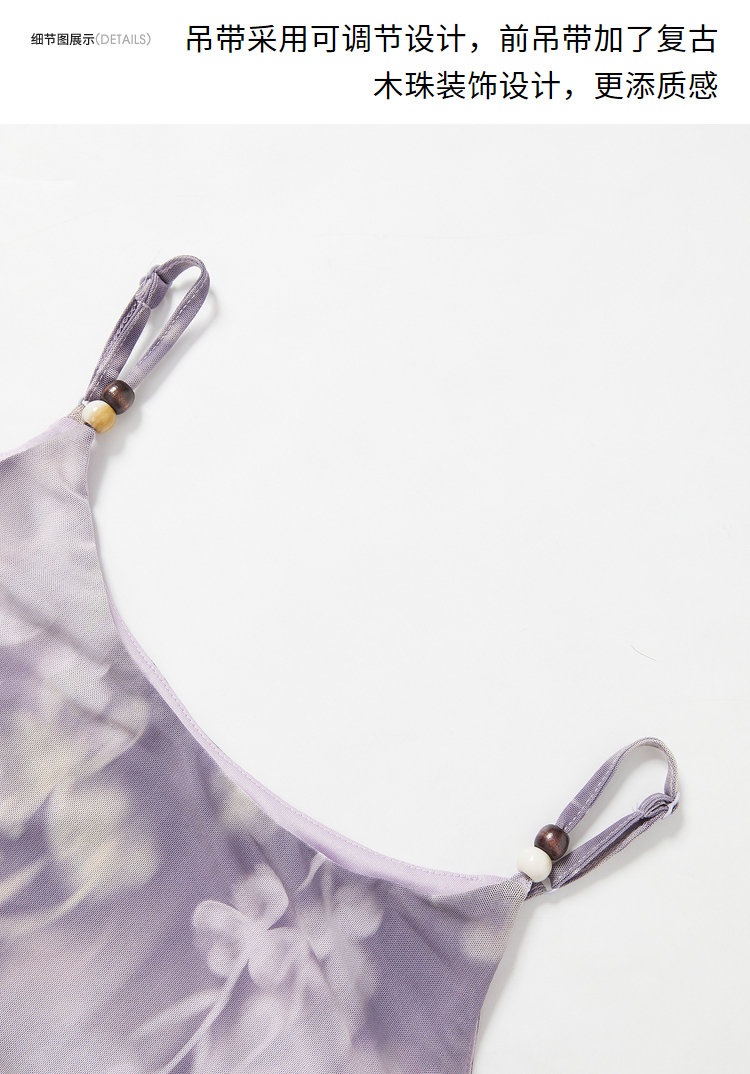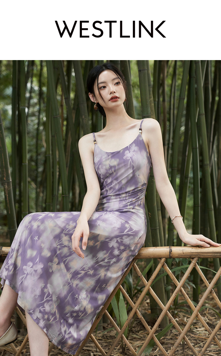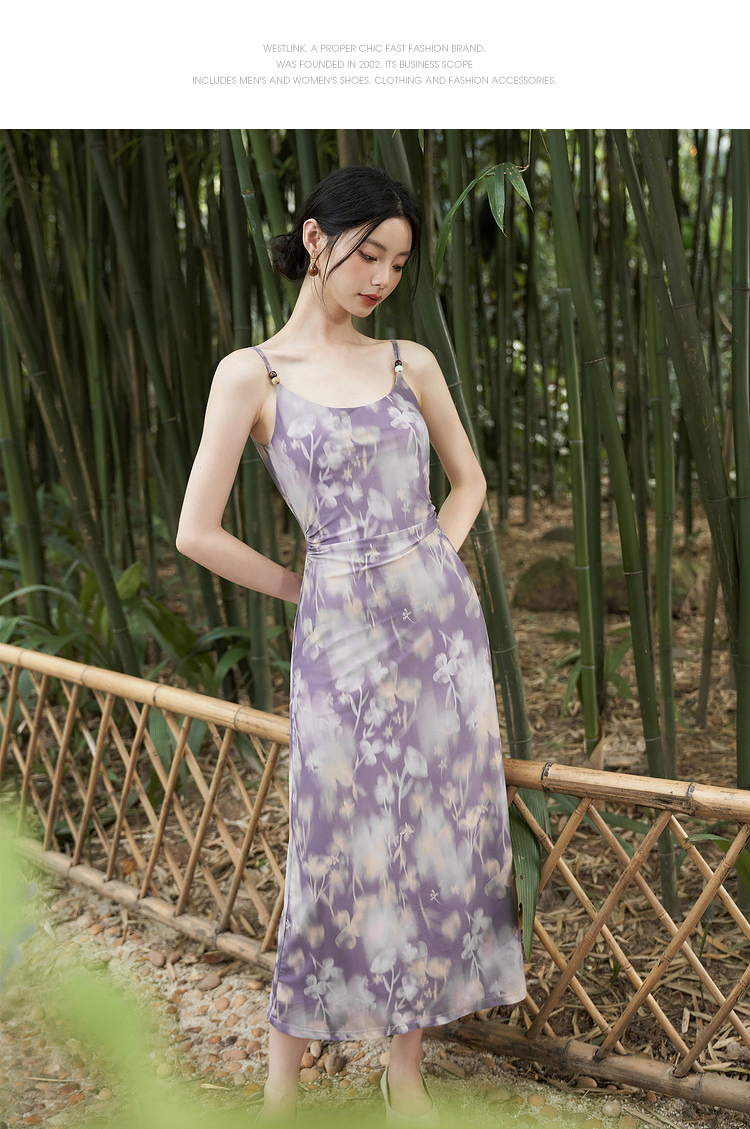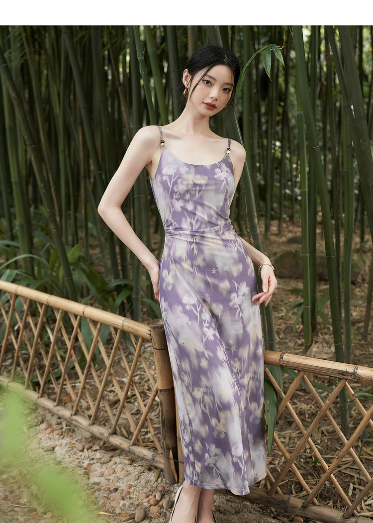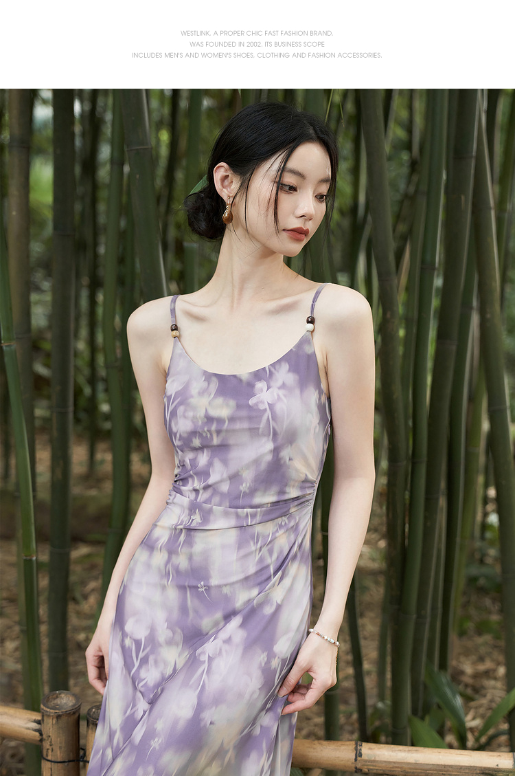 法式浪漫晕染蝴蝶花卉印花针织连衣裙女夏季吊带连衣裙V2141782