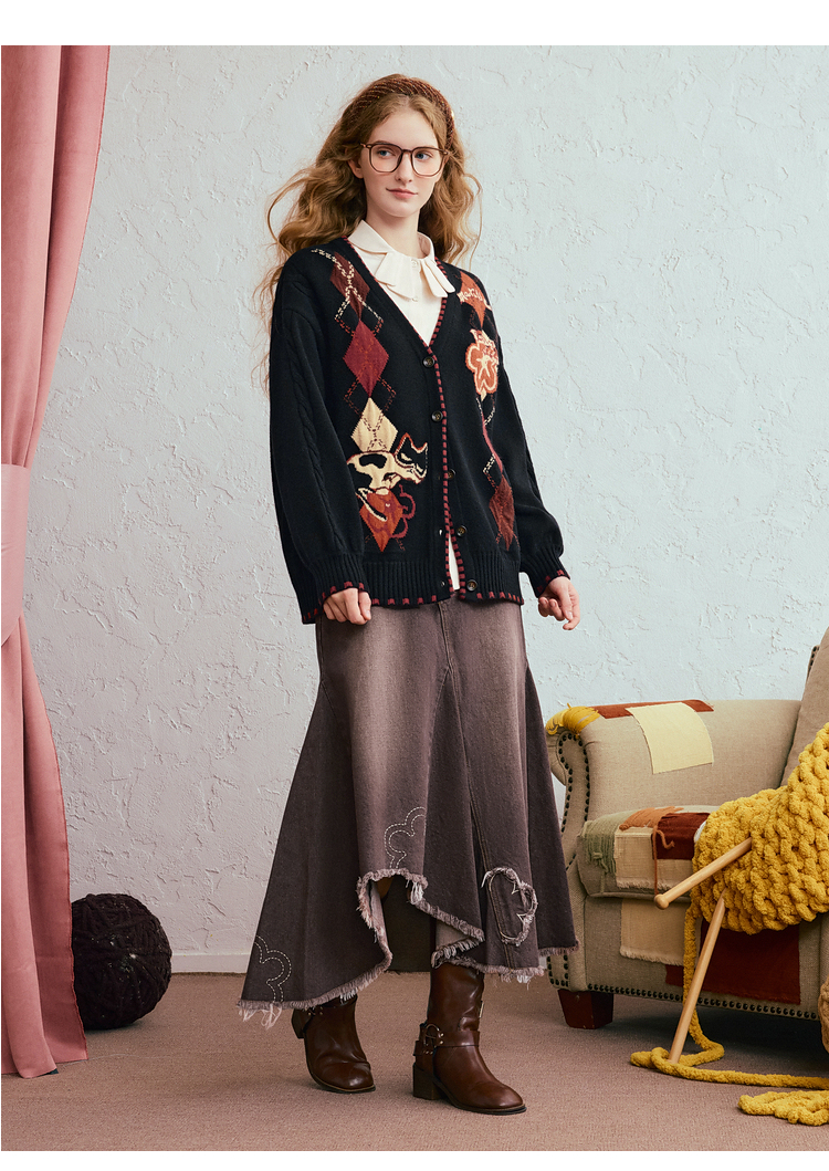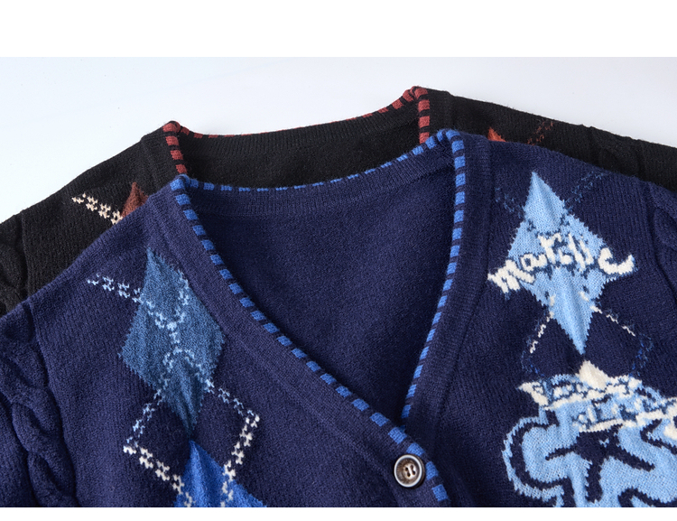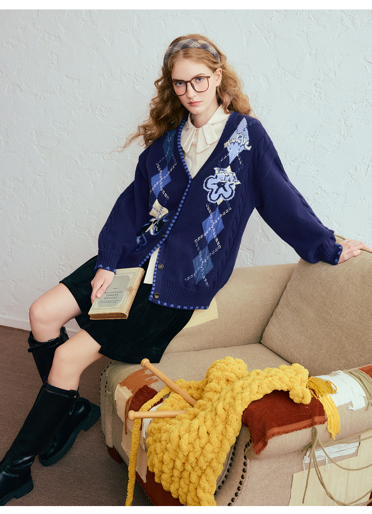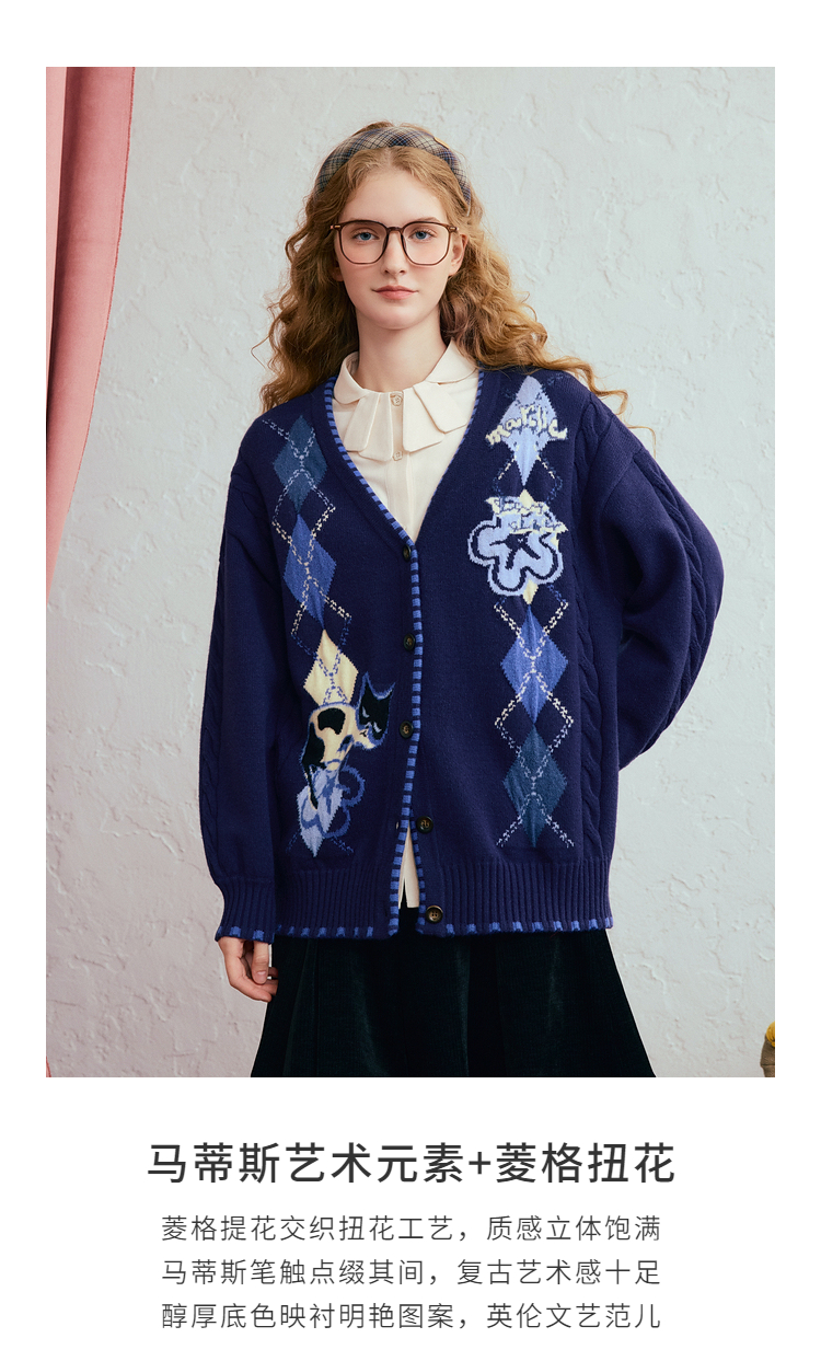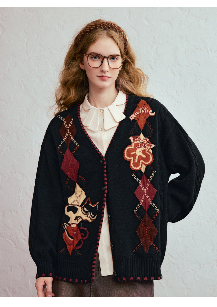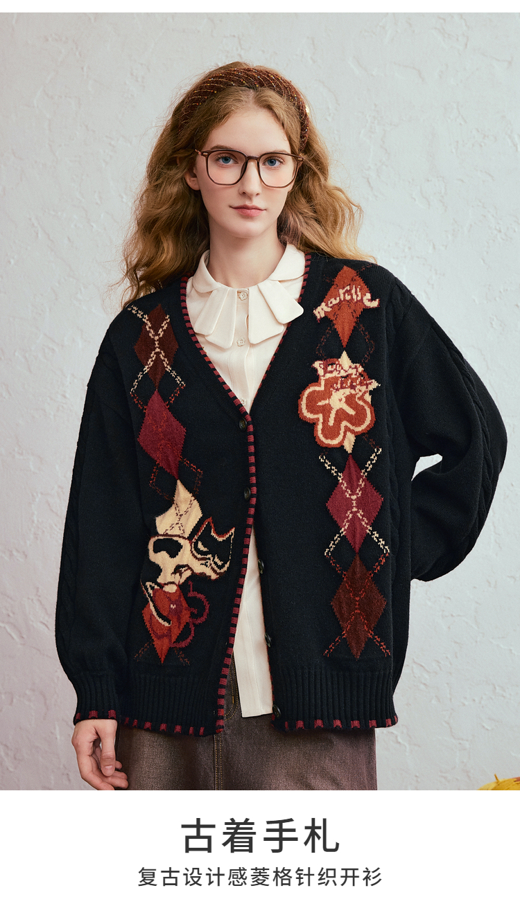 两三事 古着手札 2025冬季新款复古菱形格花色毛衣开衫女宽松