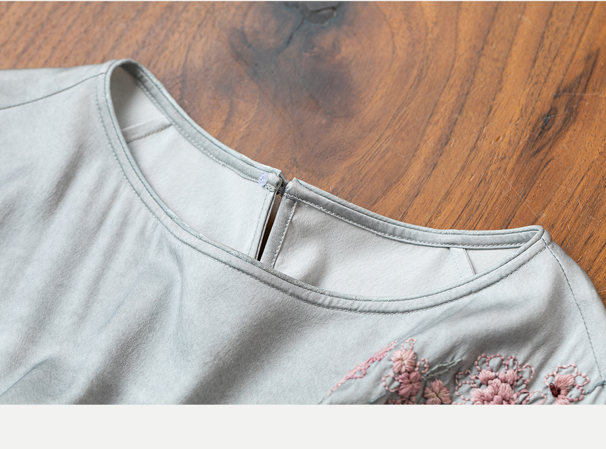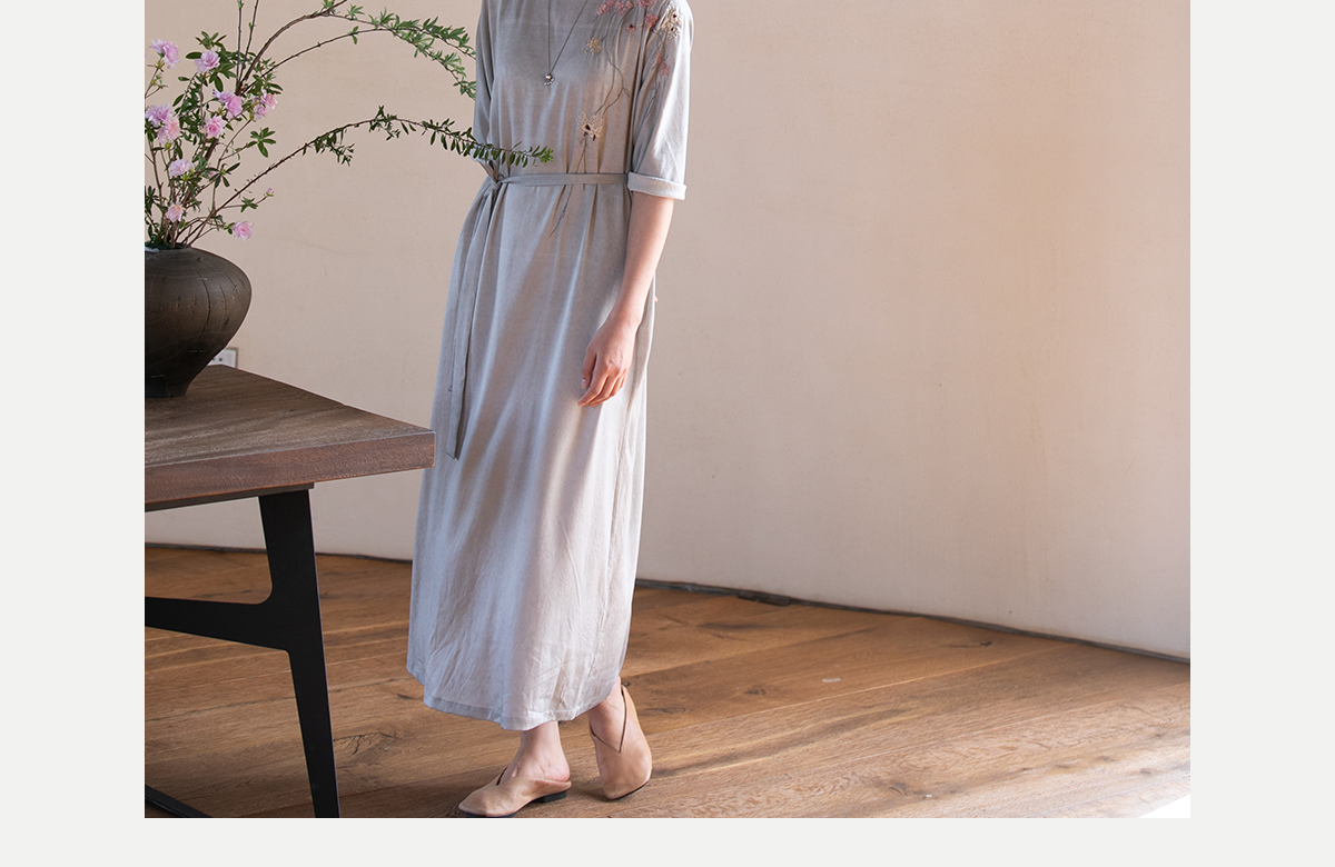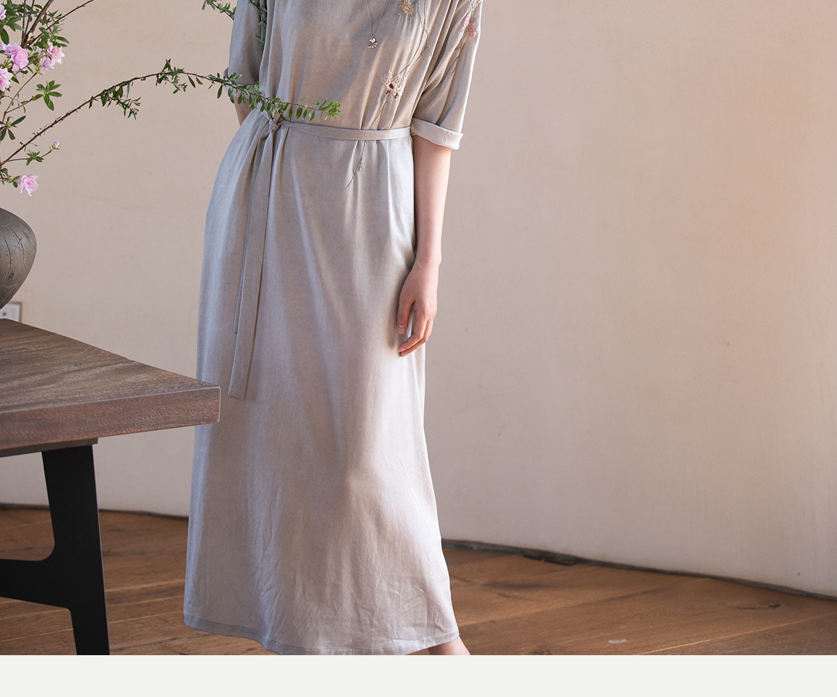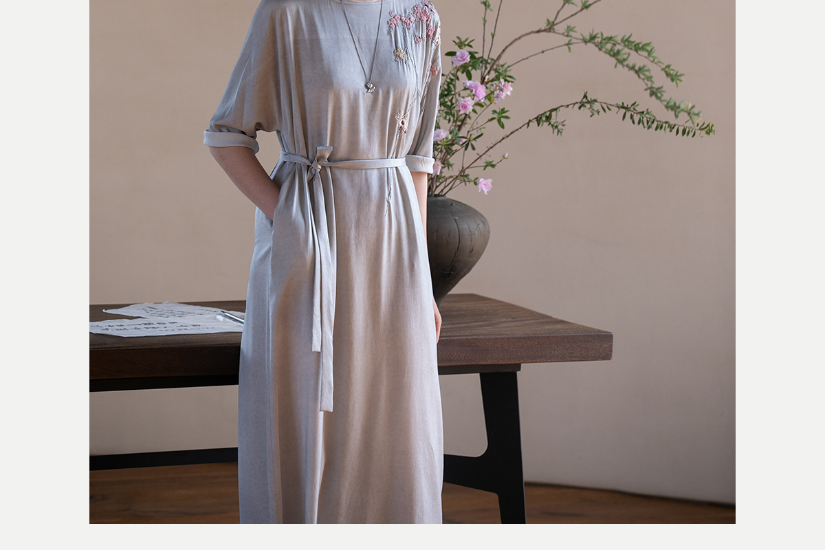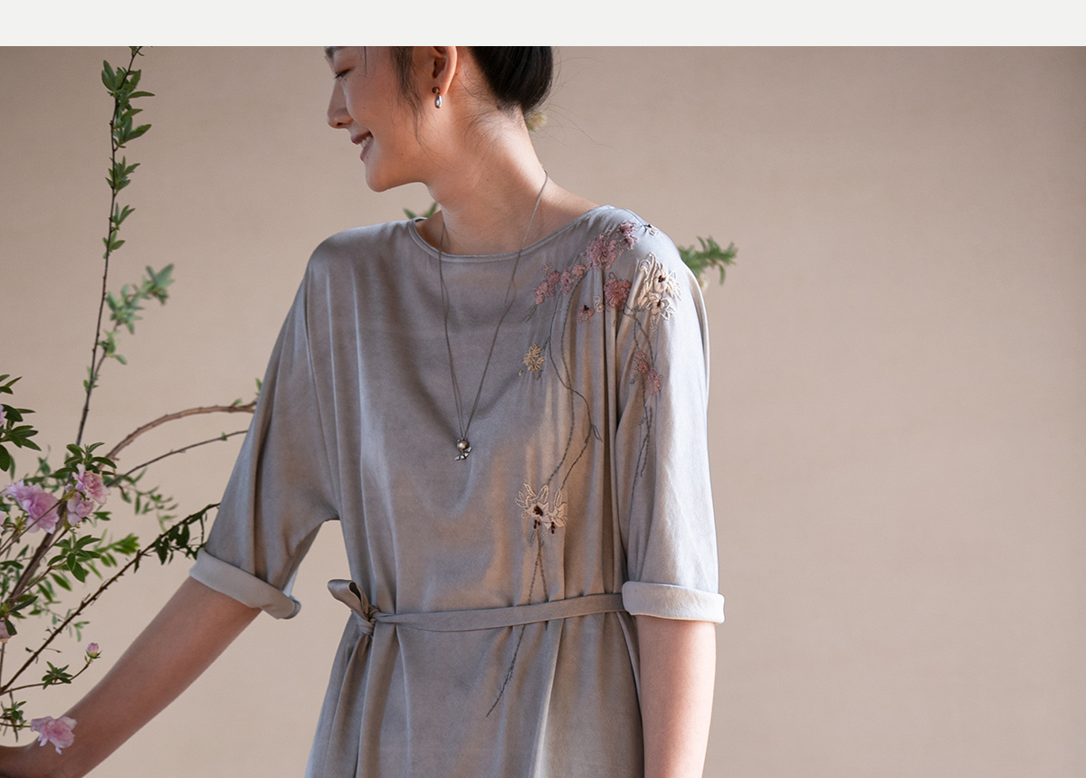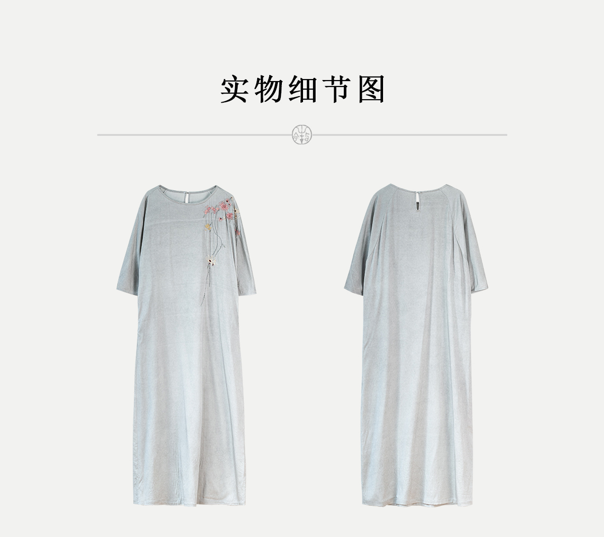 牧衣游原创 手工刺绣重磅真丝炒色连衣裙轻薄圆领宽松长裙 笙调