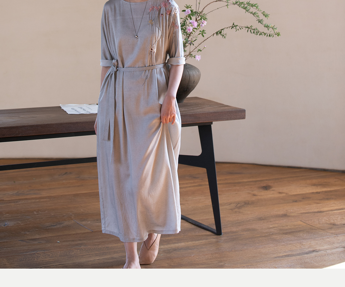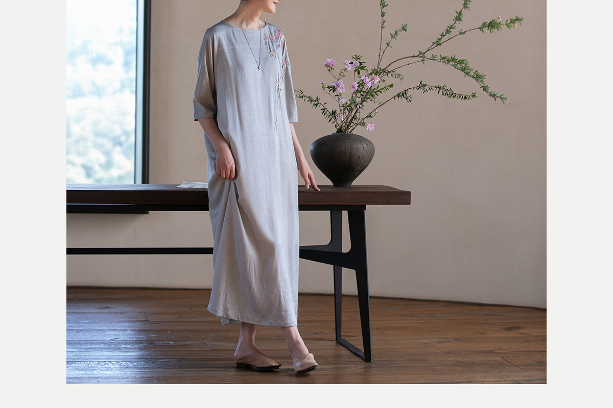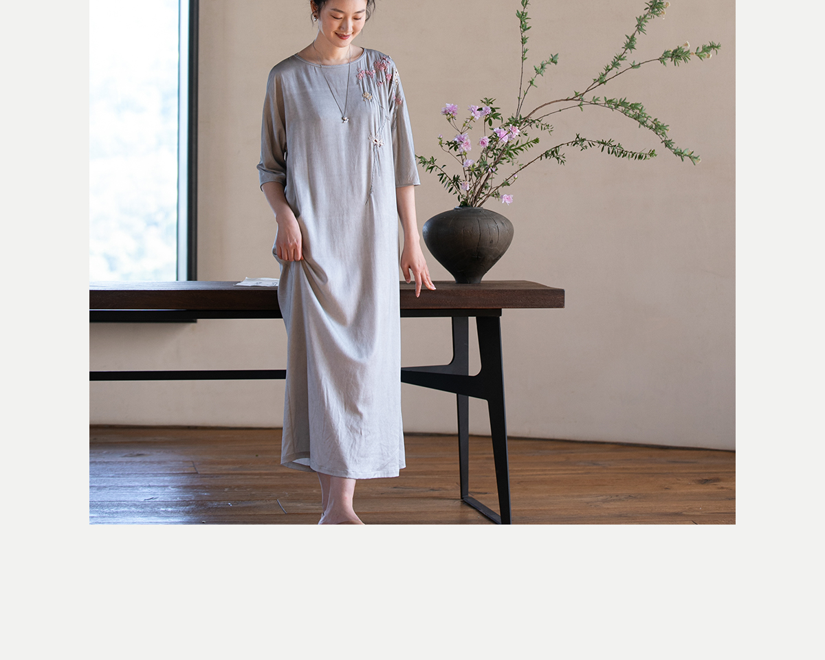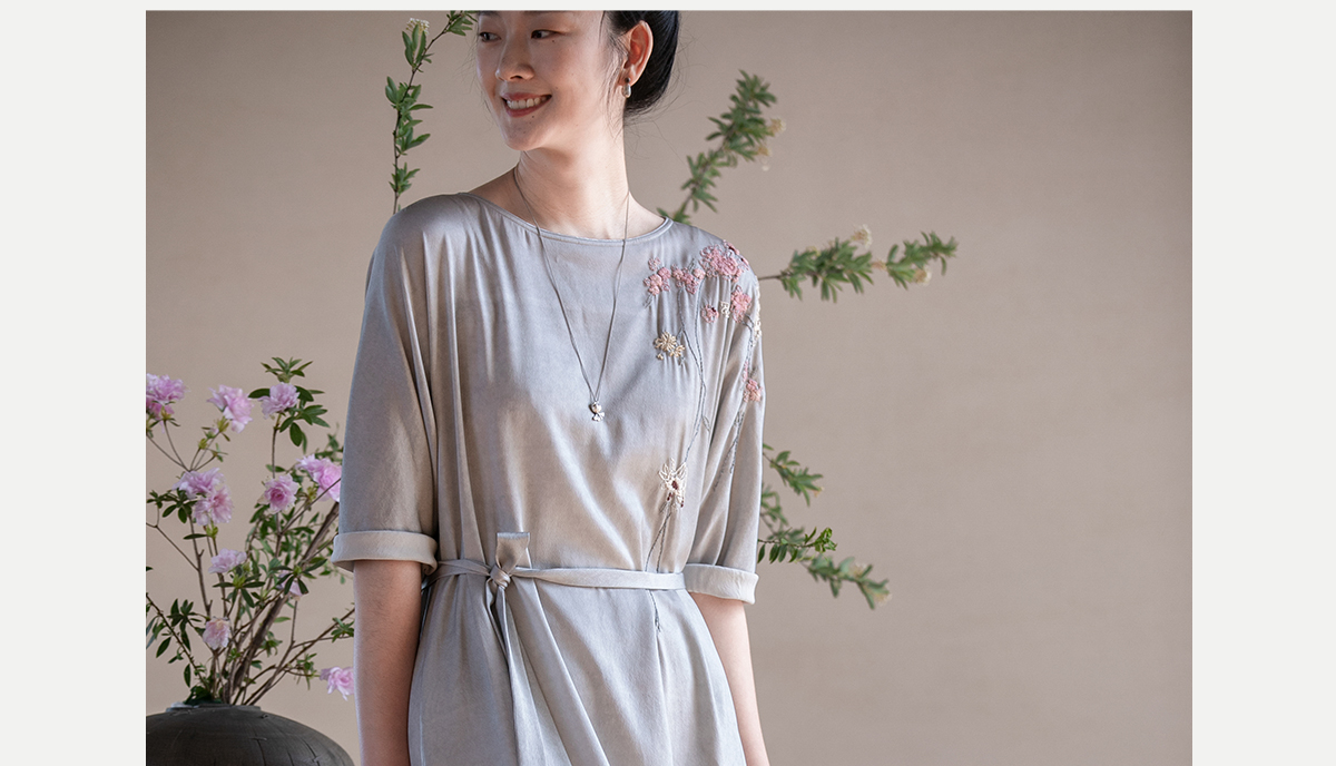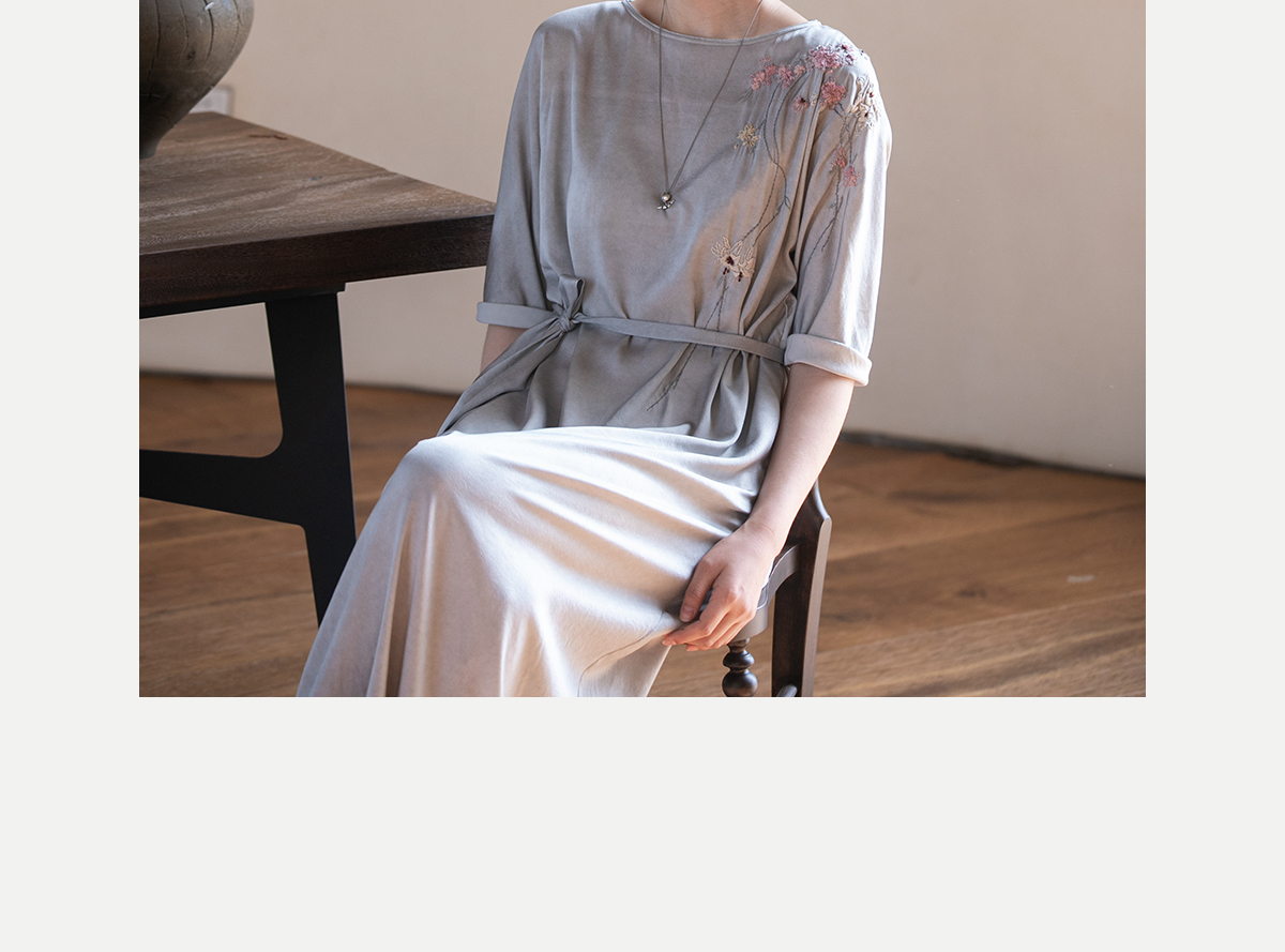 牧衣游原创 手工刺绣重磅真丝炒色连衣裙轻薄圆领宽松长裙 笙调