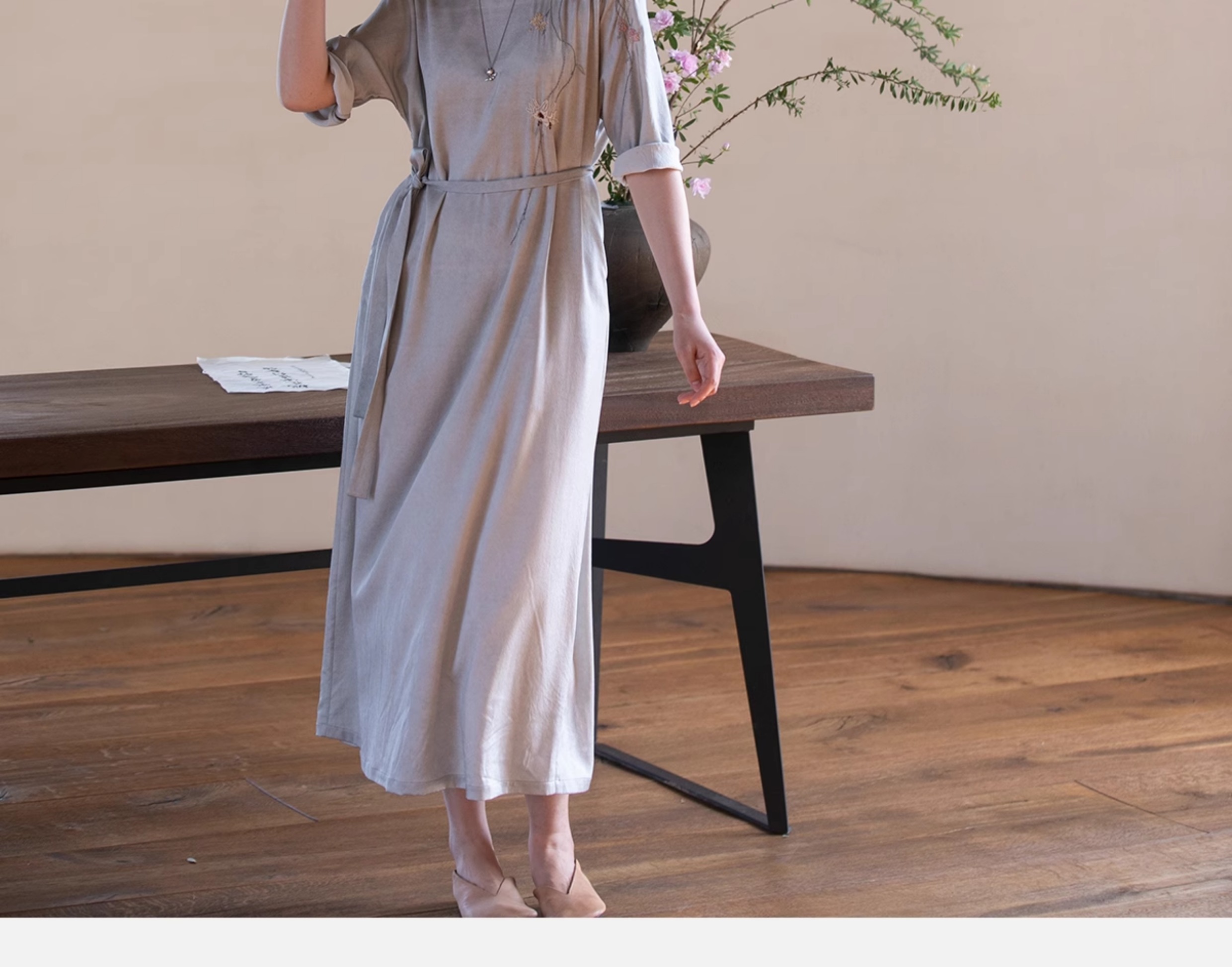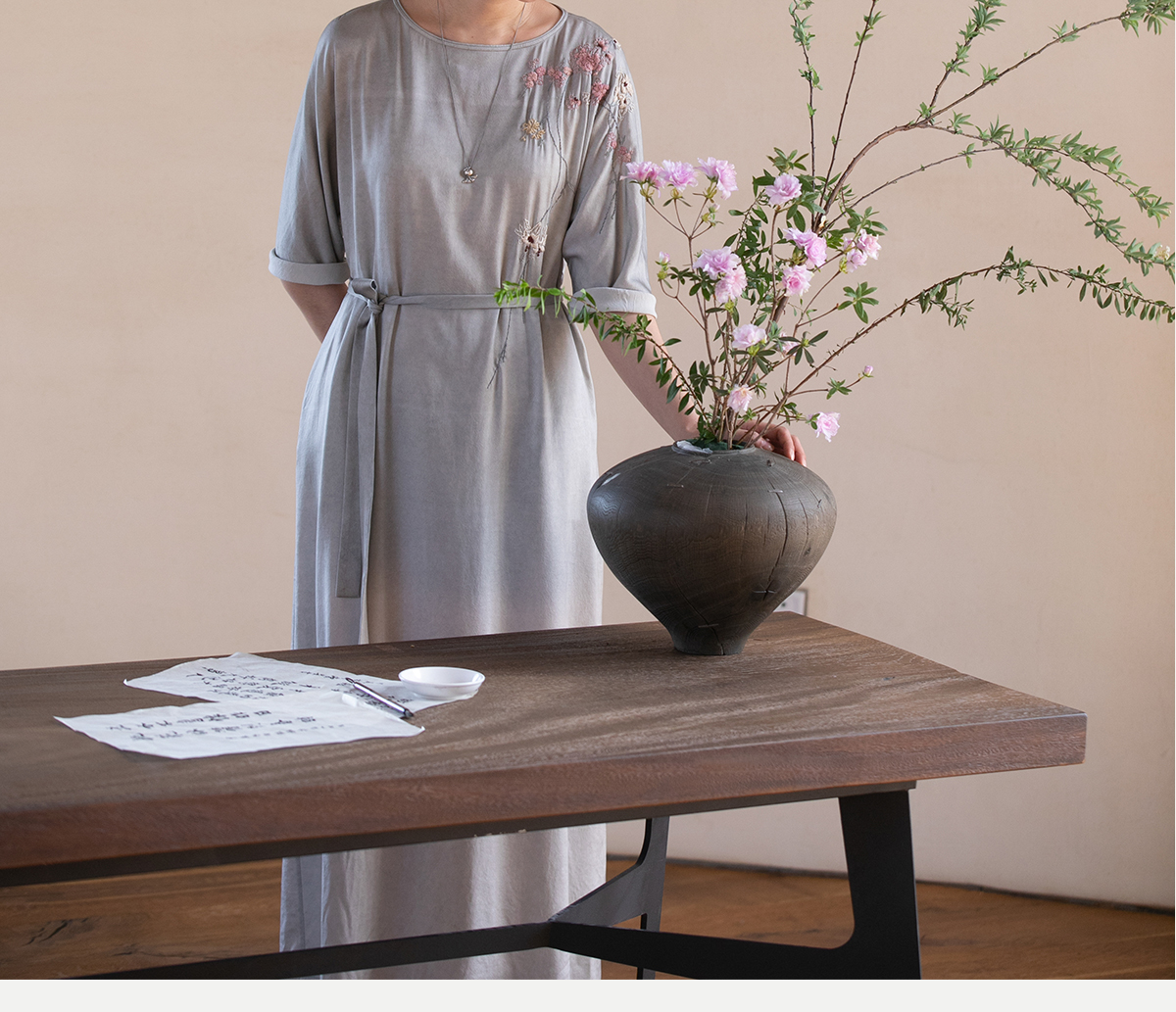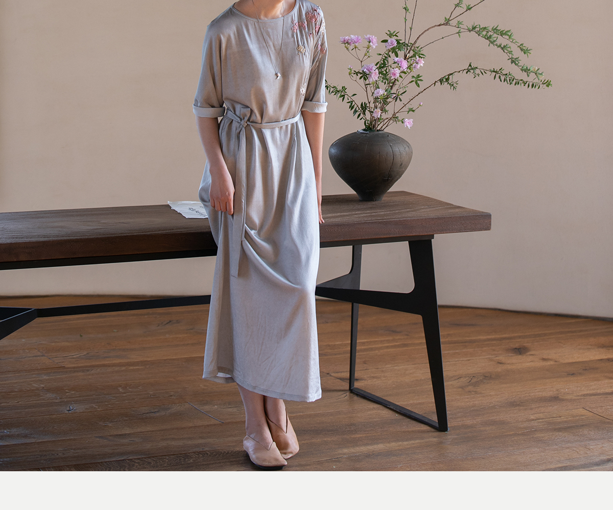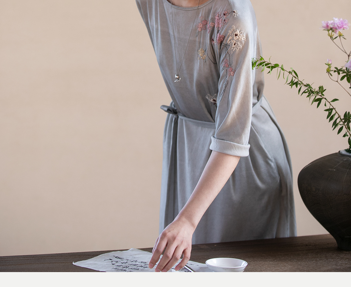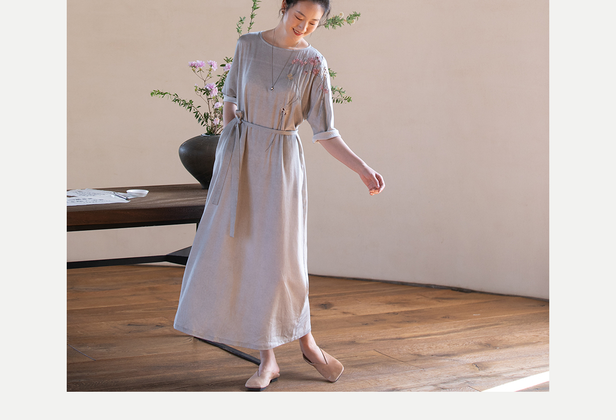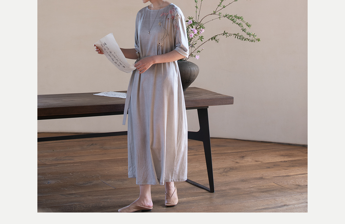 牧衣游原创 手工刺绣重磅真丝炒色连衣裙轻薄圆领宽松长裙 笙调