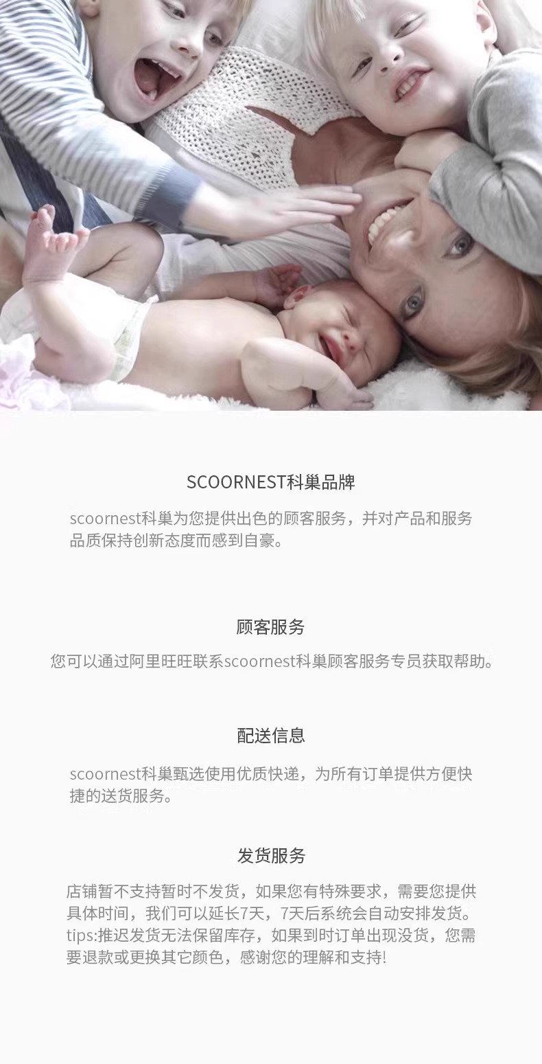 - Scoornest始终秉承给每一位宝宝送去科学的、关心的、创新的成长体验,通过提供商品和服务,使顾客形成守护、发展、巩固这种弥足珍贵的亲情的爱。