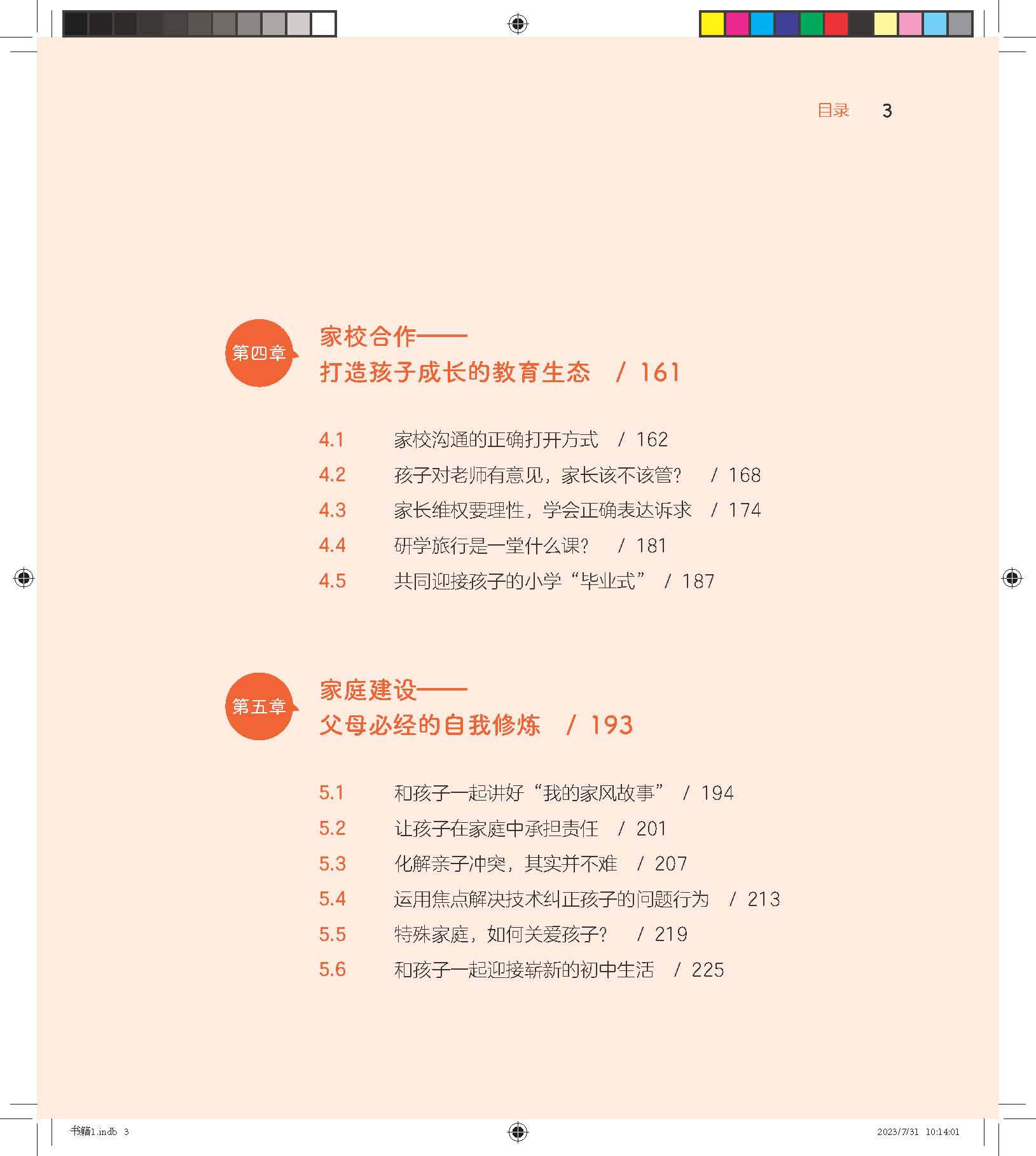 一套为家长精心打造的家长学校教材和家长 自我修炼工具箱;兼具系统性和全面性、发展性和典型性、科学性和 操作性,全面而系统地阐述了从小学至高中各年级家庭教育和家校共育的实施要点,满 足学校开展家校合作、家长学校及家长提升家庭教育能力的多方需求;既统一全套丛书的基本内容体现出孩子从小学至高中的 发展特征,又根据不同阶段孩子的特点找出该阶段的典型问题,满足学校开展家校合作 与家长学校等多方需求。
