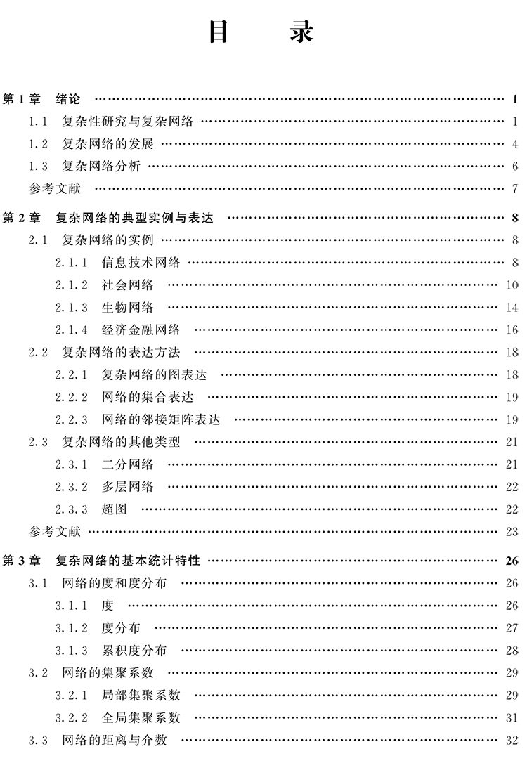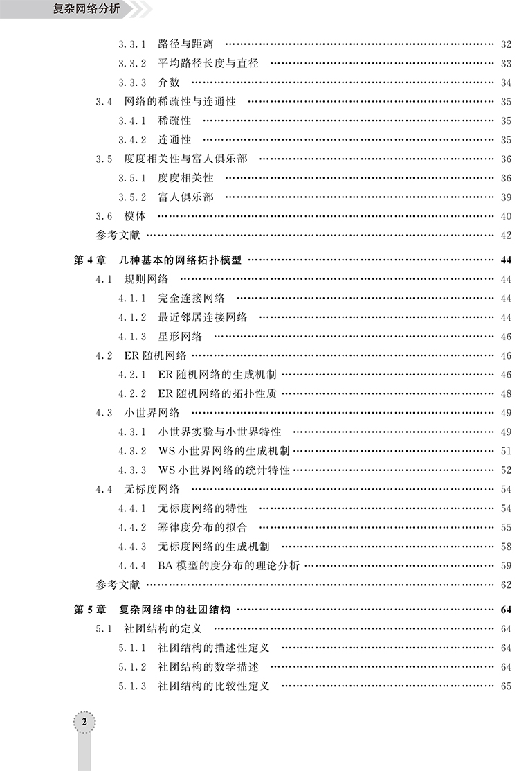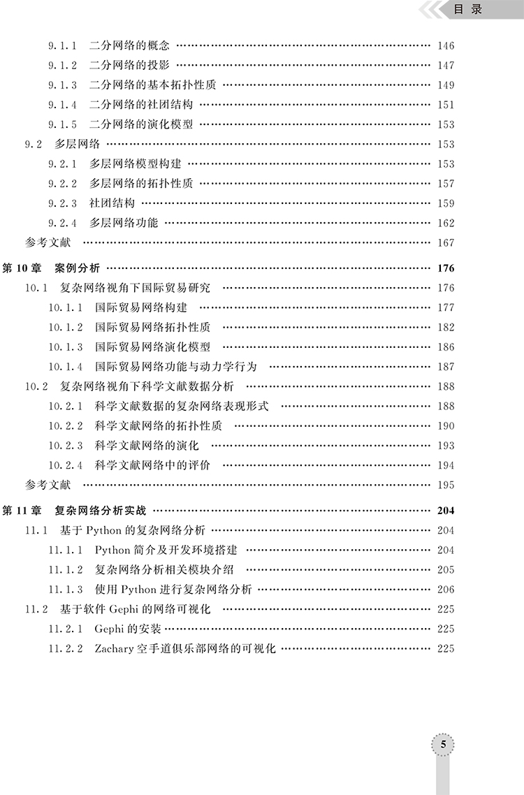 本书共十一章,内容涵盖了从基础理论到实际应用的多个主题,旨在为读者提供复杂网络分析的深入理解和实践指导。全书可分为三大模块,分别为与复杂网络分析相关的理论知识、案例分析、编程计算和网络可视化。第一模块(对应本书的第一章至第九章)主要介绍复杂网络分析在复杂性研究中的地位和作用、复杂网络研究的发展历程、复杂网络分析流程、复杂网络实例、复杂网络在不同尺度上的拓扑结构特性、复杂网络模型(如随机网络、小世界网络、无标度网络、加权网络、二分网络、多层网络等)以及网络上的经典动力学过程(如网络上的传播动力学、随机游走、同步等过程)。第二模块(对应本书的第十章)主要结合案例简述复杂网络分析在国际贸易系统和科学文献系统中的具体应用。第三模块(对应本书的第十一章)介绍了与复杂网络分析相关的软件操作,包括使用软件Python进行复杂网络分析以及基于软件Gephi实现网络的可视化等。
