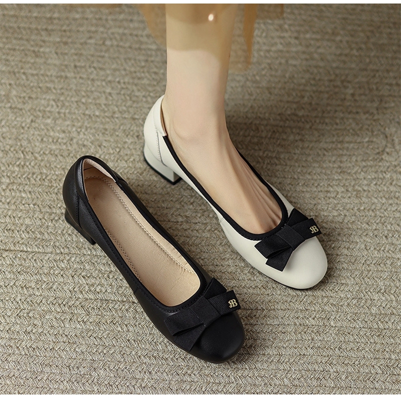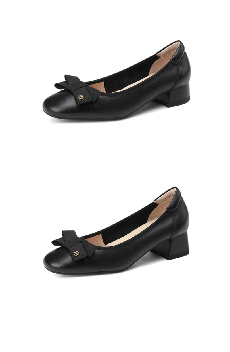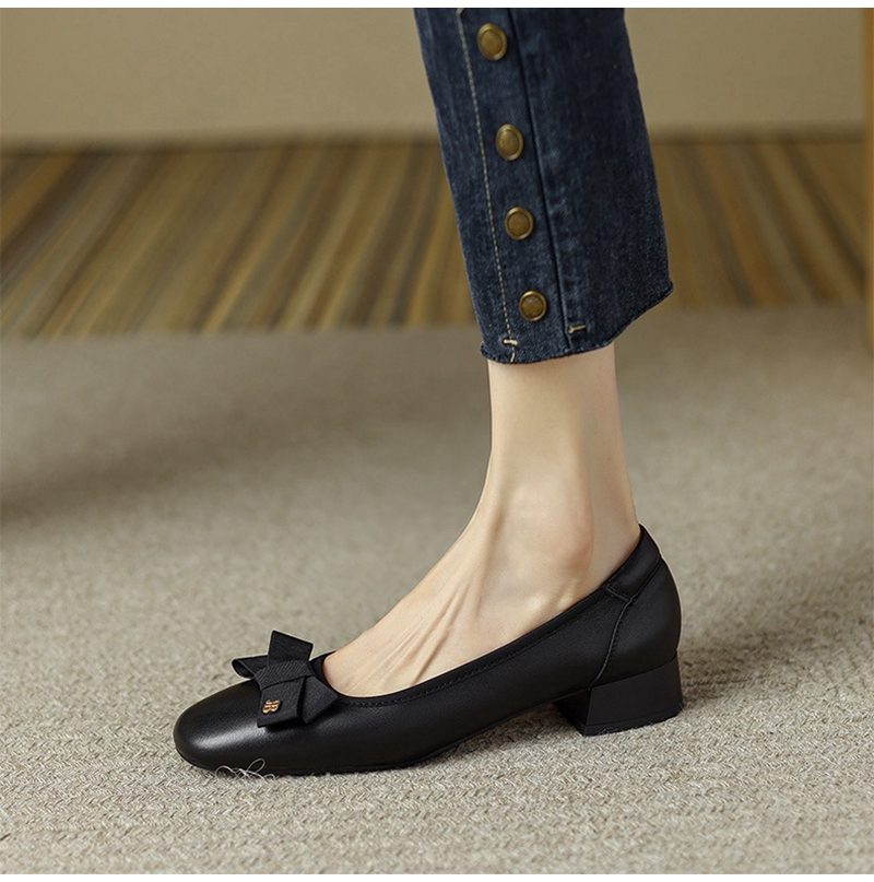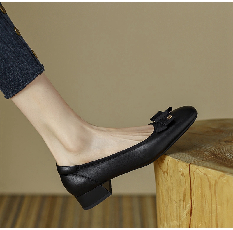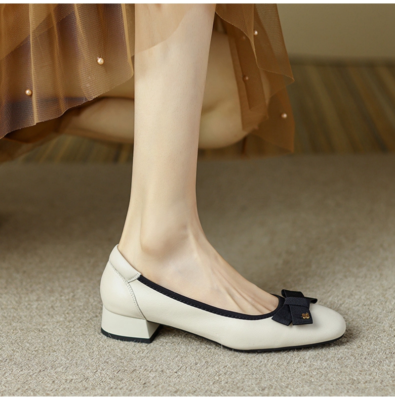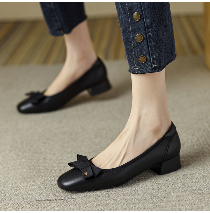 初秋新品头层牛皮方头低帮蝴蝶结浅口粗跟中跟皮鞋