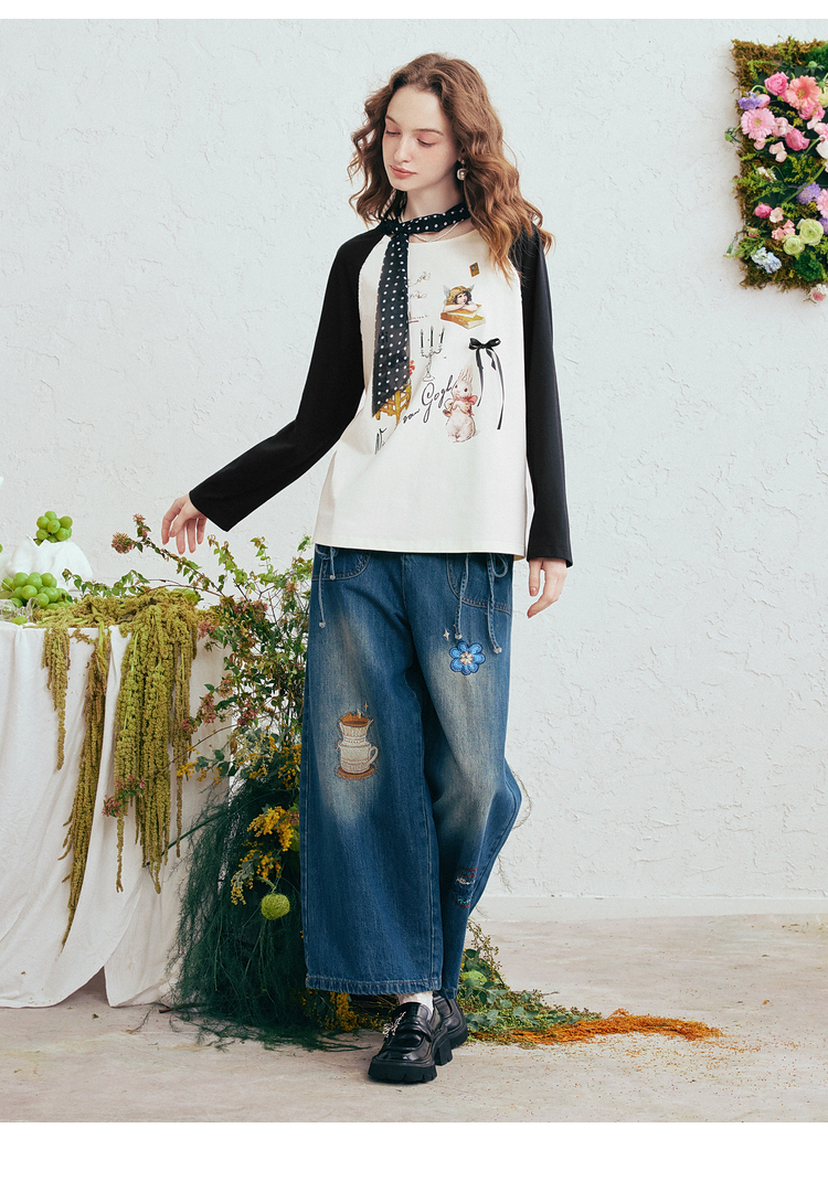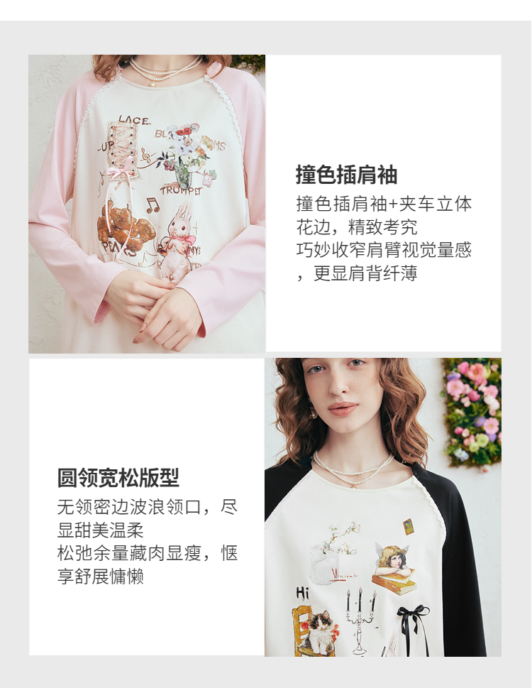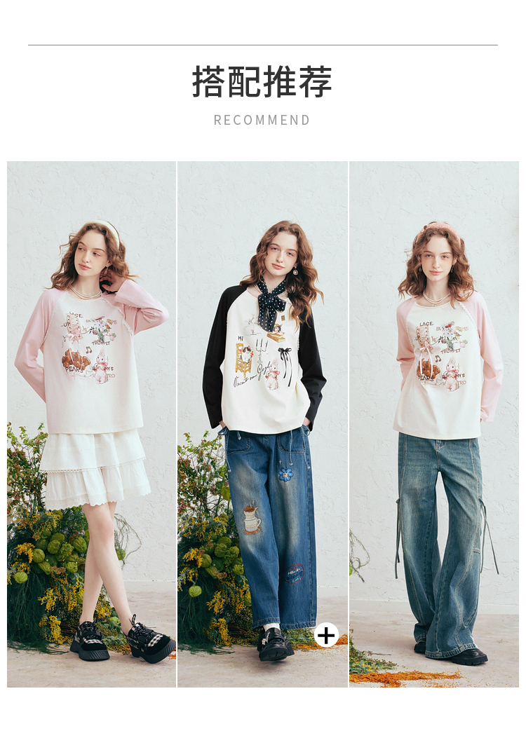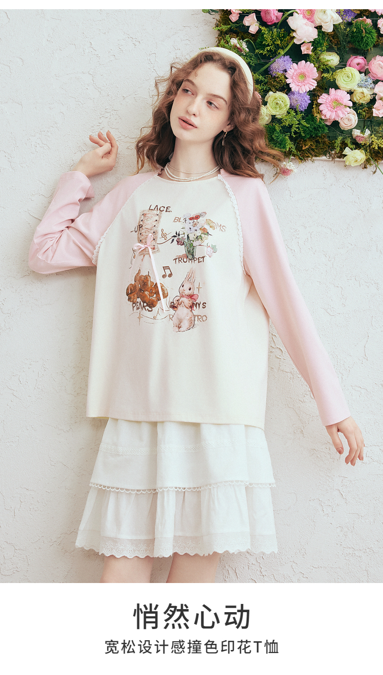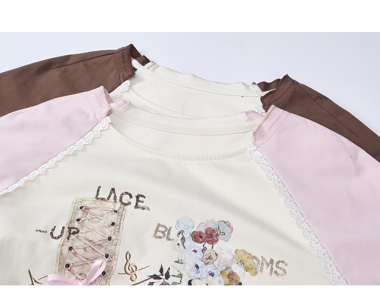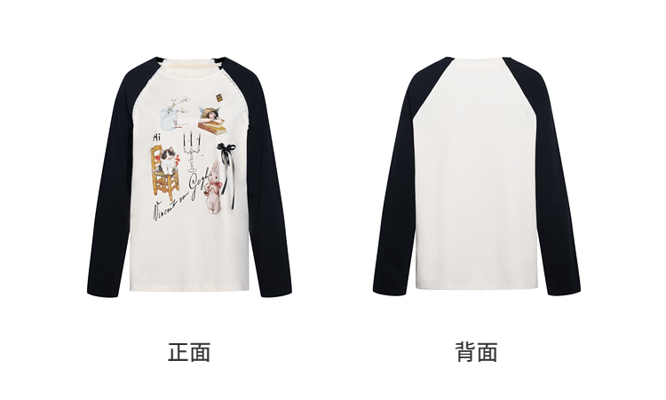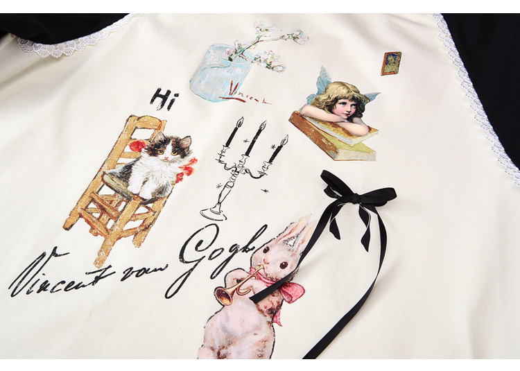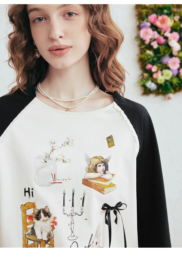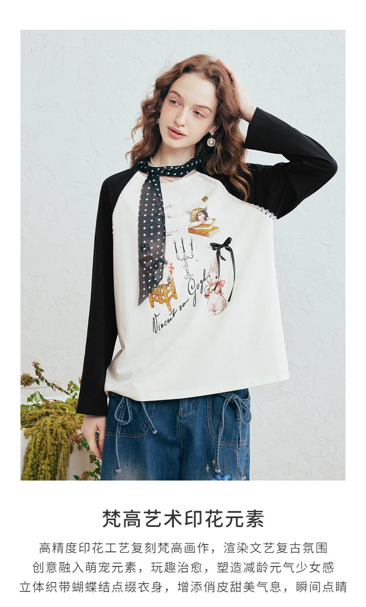 两三事梵高文艺悄然心动2026春季新款拼色插肩袖蝴蝶结印花t恤女
