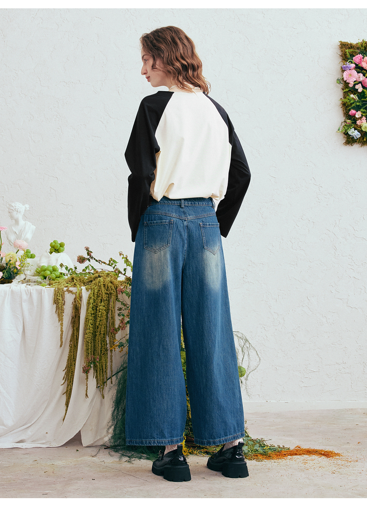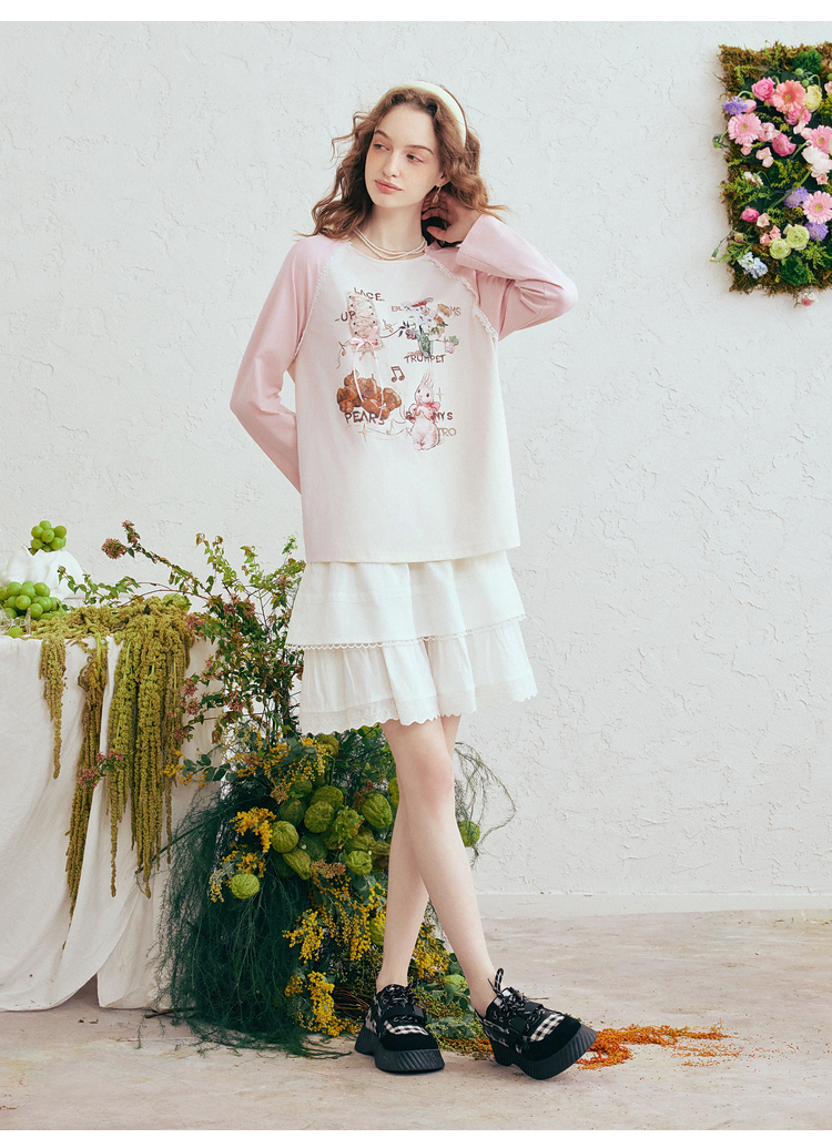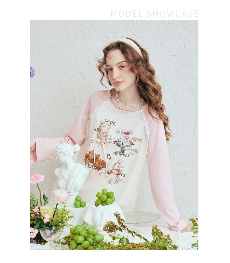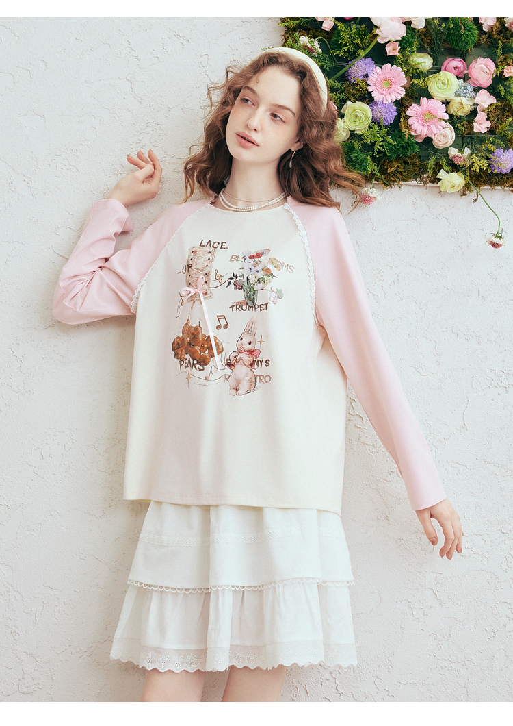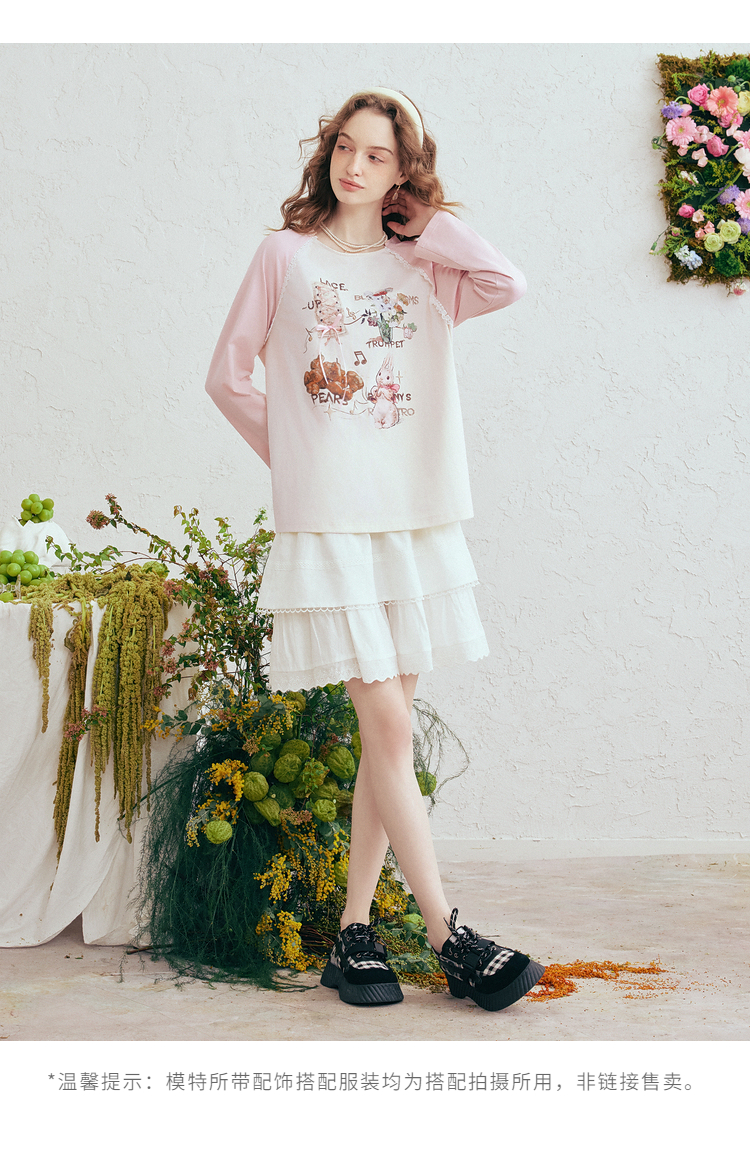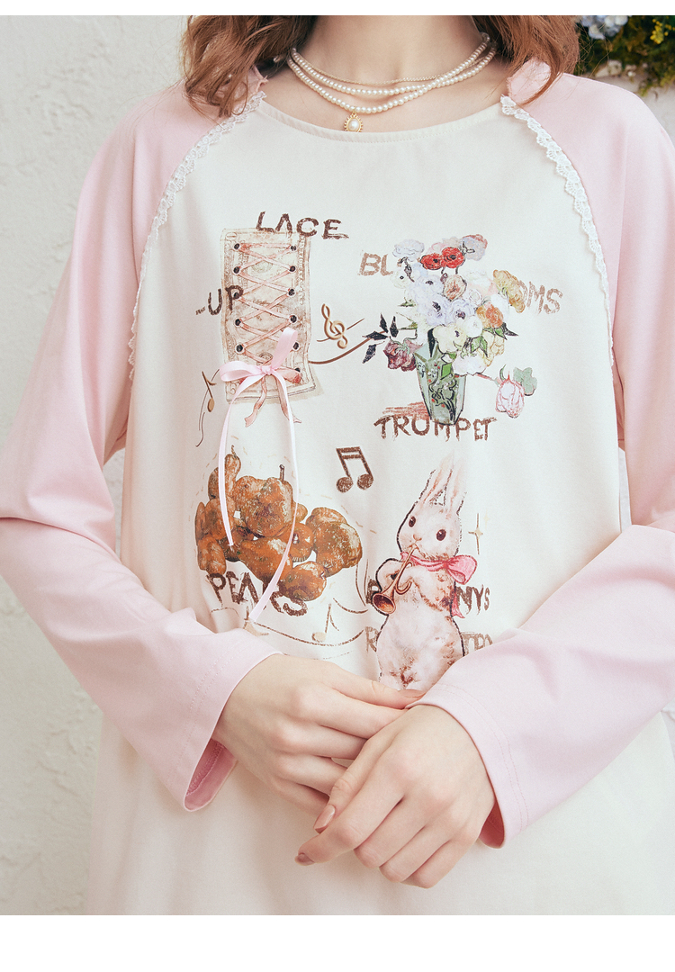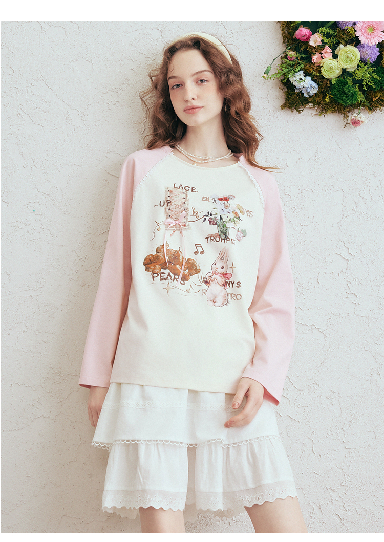 两三事梵高文艺悄然心动2026春季新款拼色插肩袖蝴蝶结印花t恤女