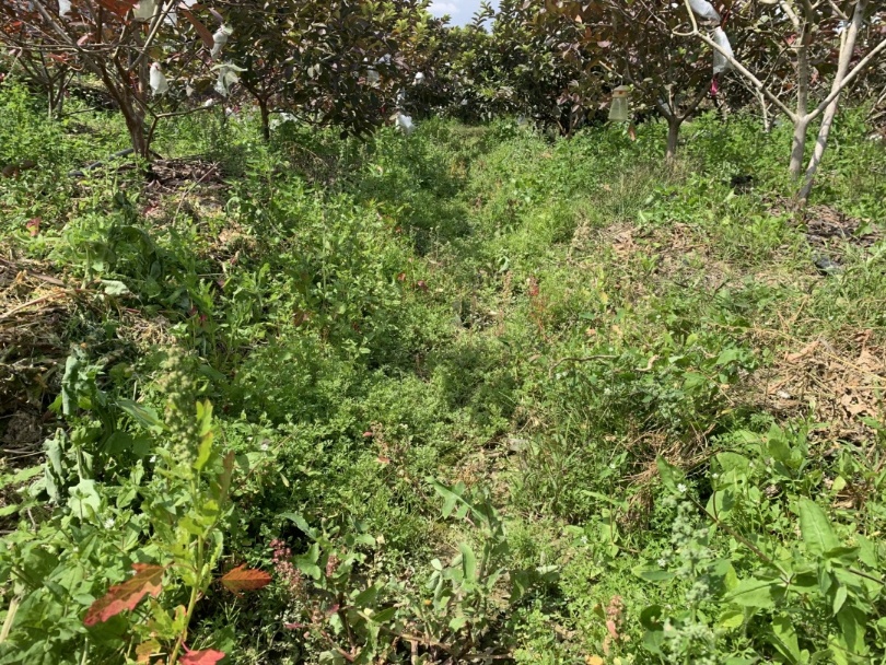 答:这是我们的生机果园,里面的野草都不使用任何农药,和芭乐和谐共生,实在过长的时候,我们会使用割草机或锄头,人工割草。