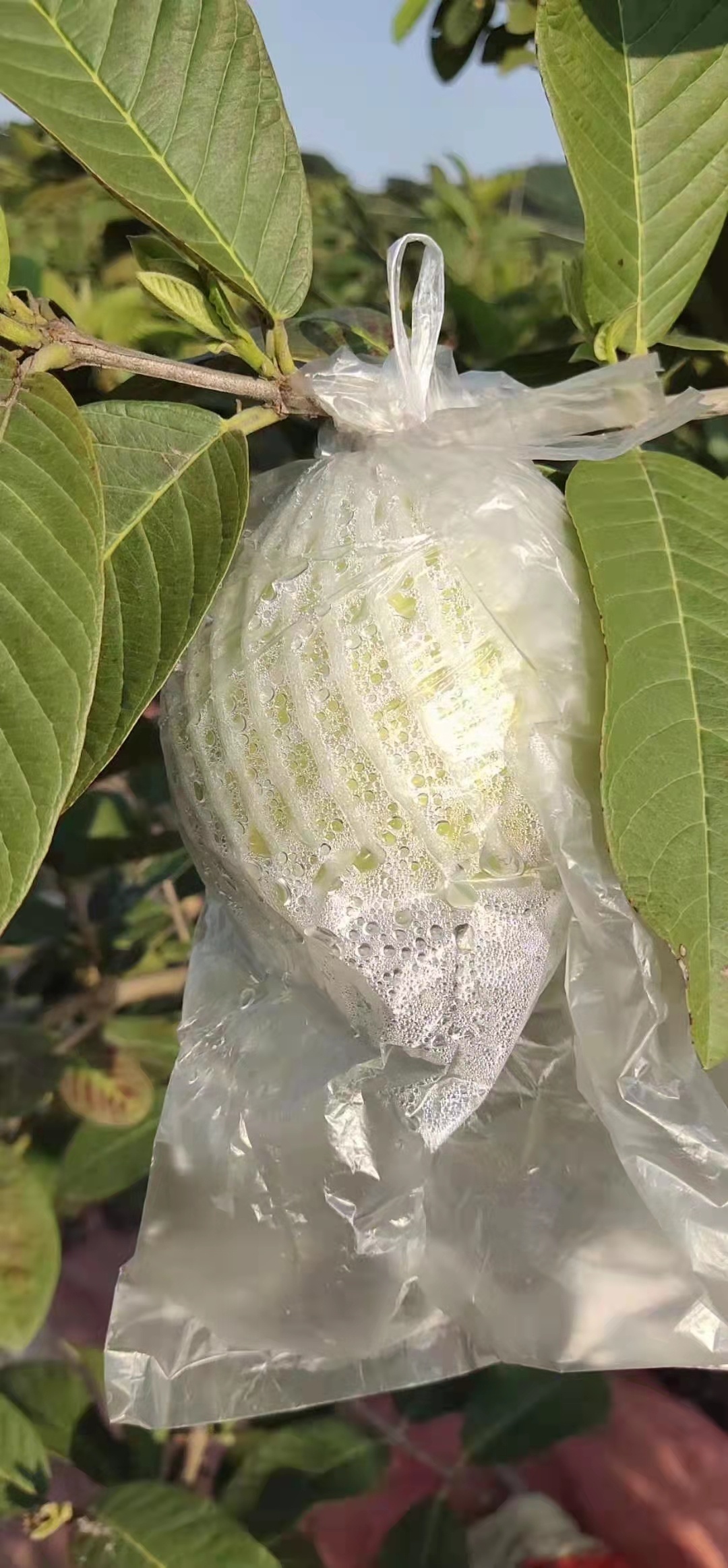 6、从芭乐开小白花到变身青涩小果子,便要一个个找到套上双层保护(白色网格+透明塑料袋),杜绝它遭受小鸟、蜂蝇侵扰,防止暴雨狂风的侵袭,牢牢保护好每一个小芭乐。
