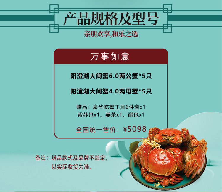【礼券】阳澄湖万事如意10只装 鲜活大闸蟹(6.0两公*5+4.0两母*5)