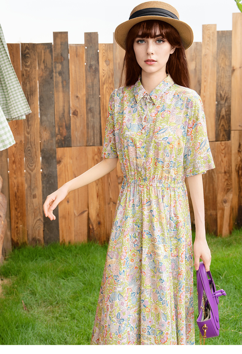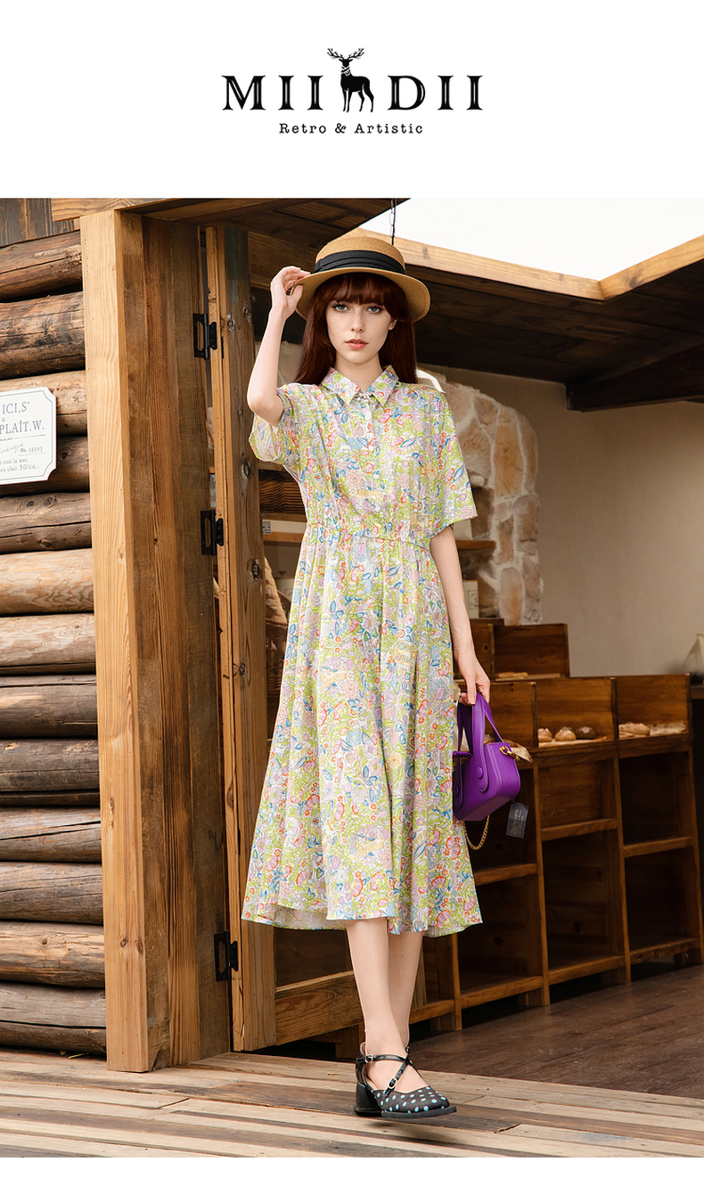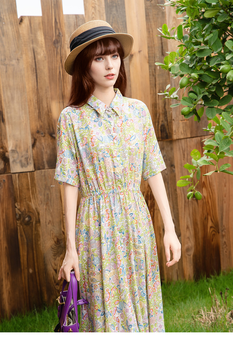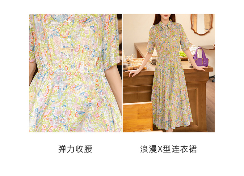 谜底碎花连衣裙短袖2025夏季新款度假风衬衫式收腰长裙257ML7832