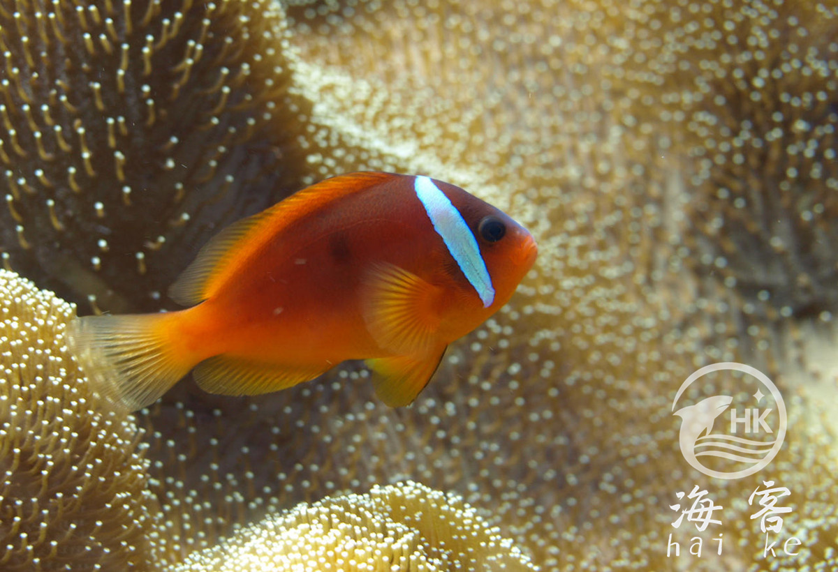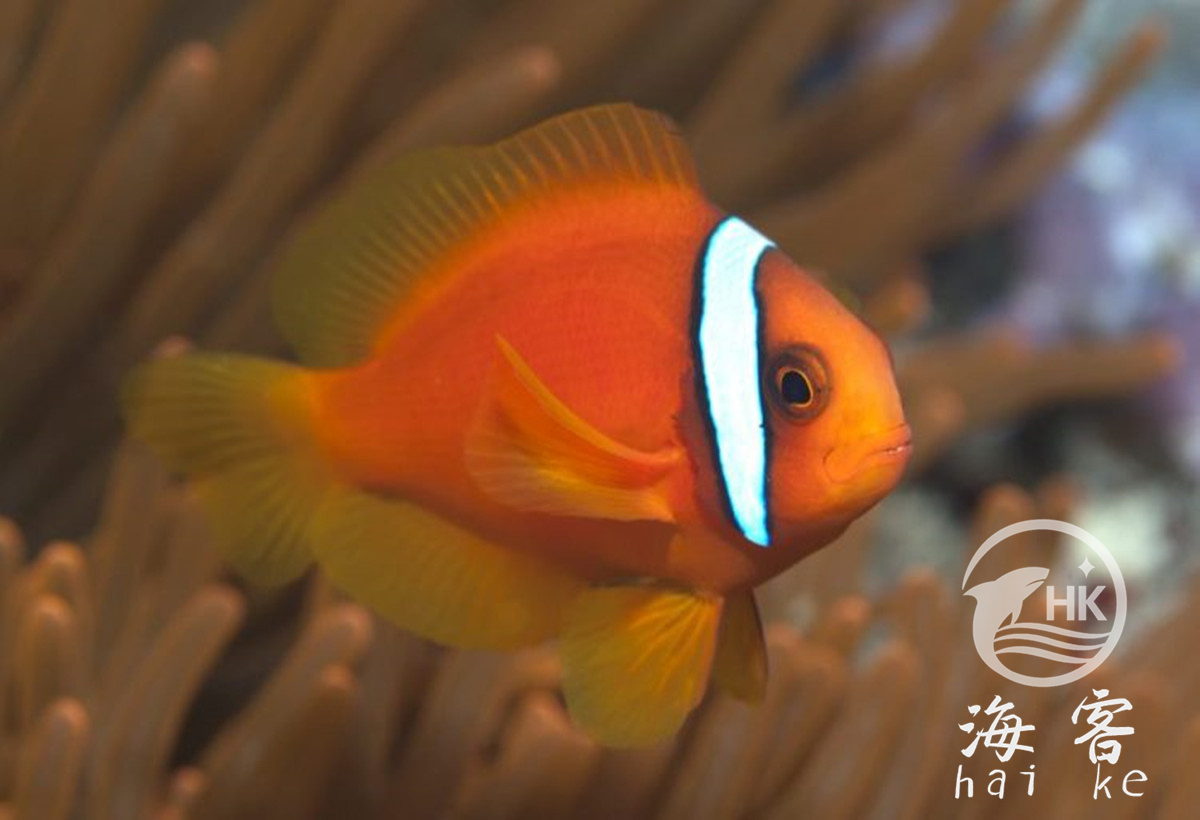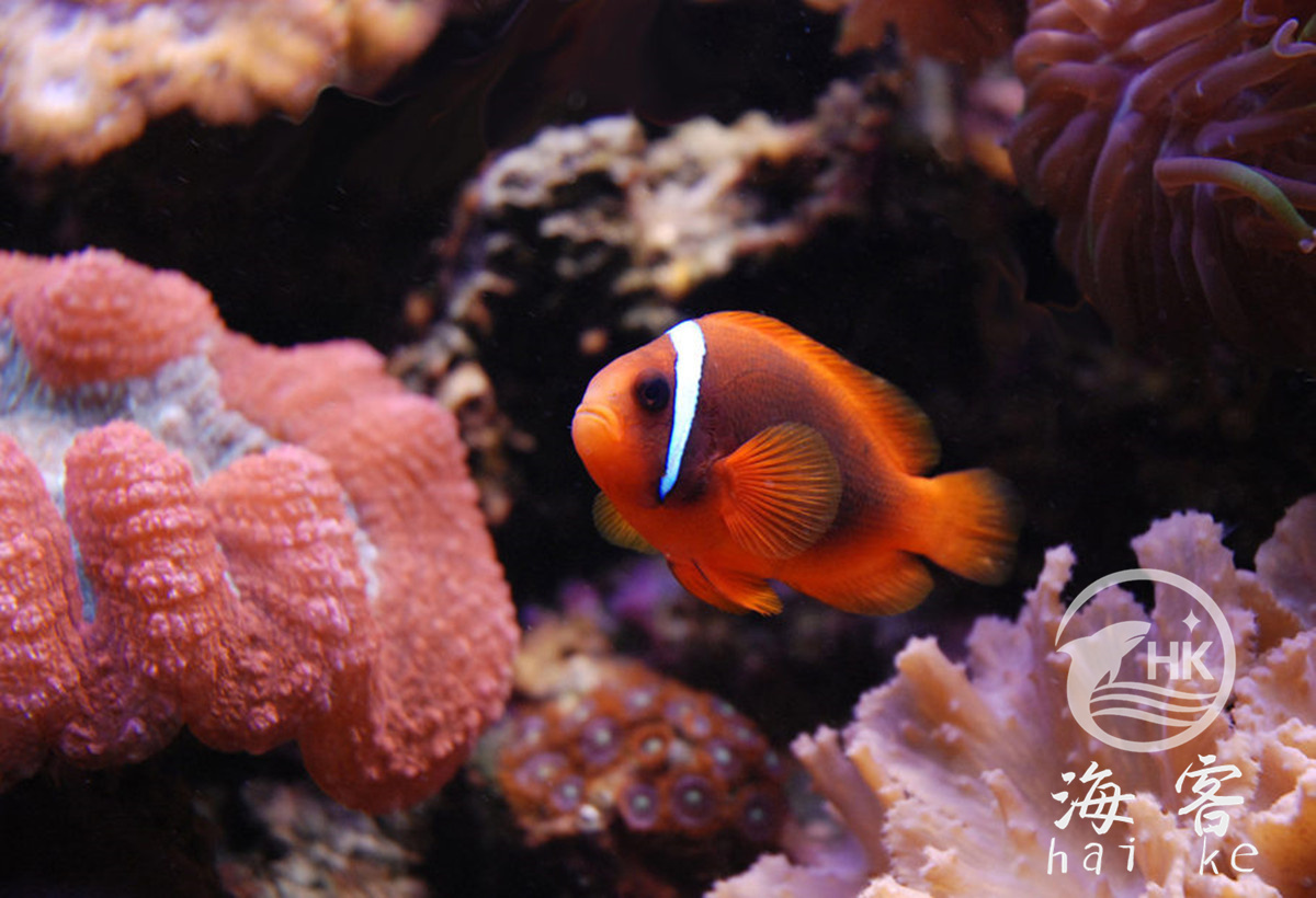 番茄小丑有一个亮桔红色身体,一条白条纹呈现在眼睛后面。在野生环境能达到12.5cm,但在水族箱中最大能长到9cm.