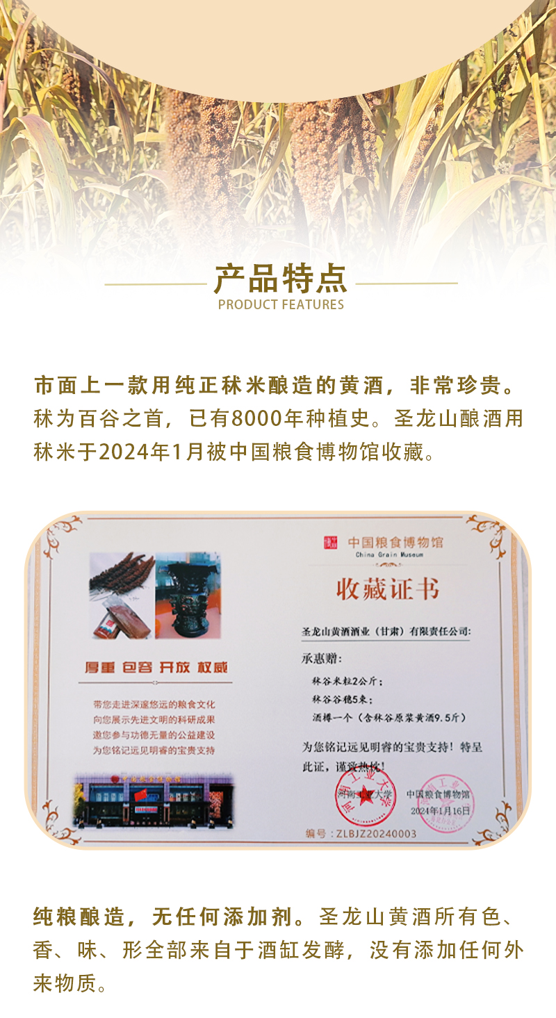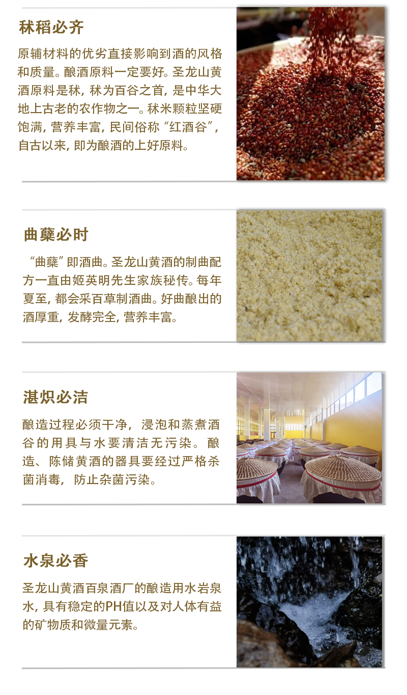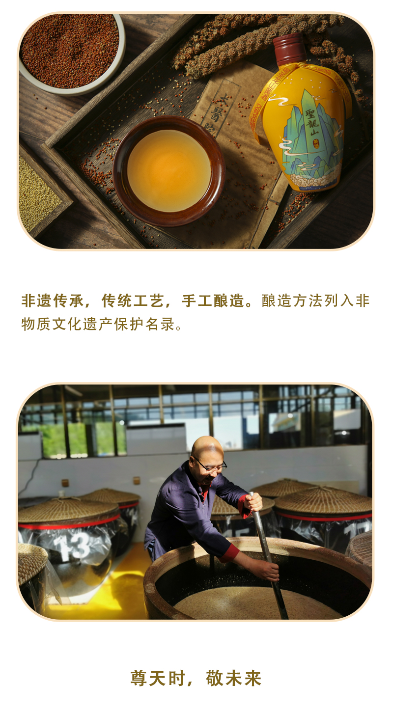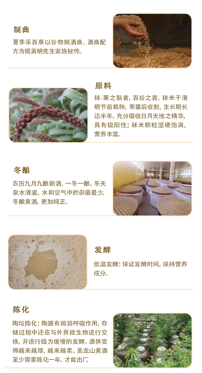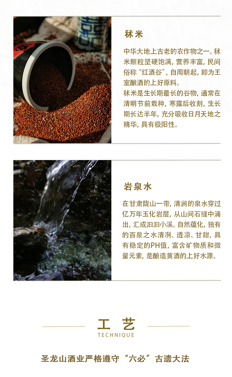 圣龙山品牌起源 用实业把濒临灭绝的华族五谷之首秫(酒谷),拯救回来! 用祖传秘制黄酒工艺,带动陇山里的农民共同富裕! 用古老的黄酒仪礼文化,把敬天法祖信仰普及开来 让华族发祥聖地,重新散发他应有的智慧