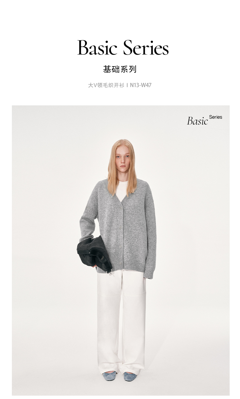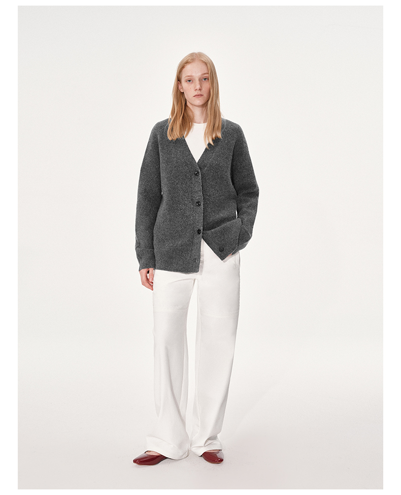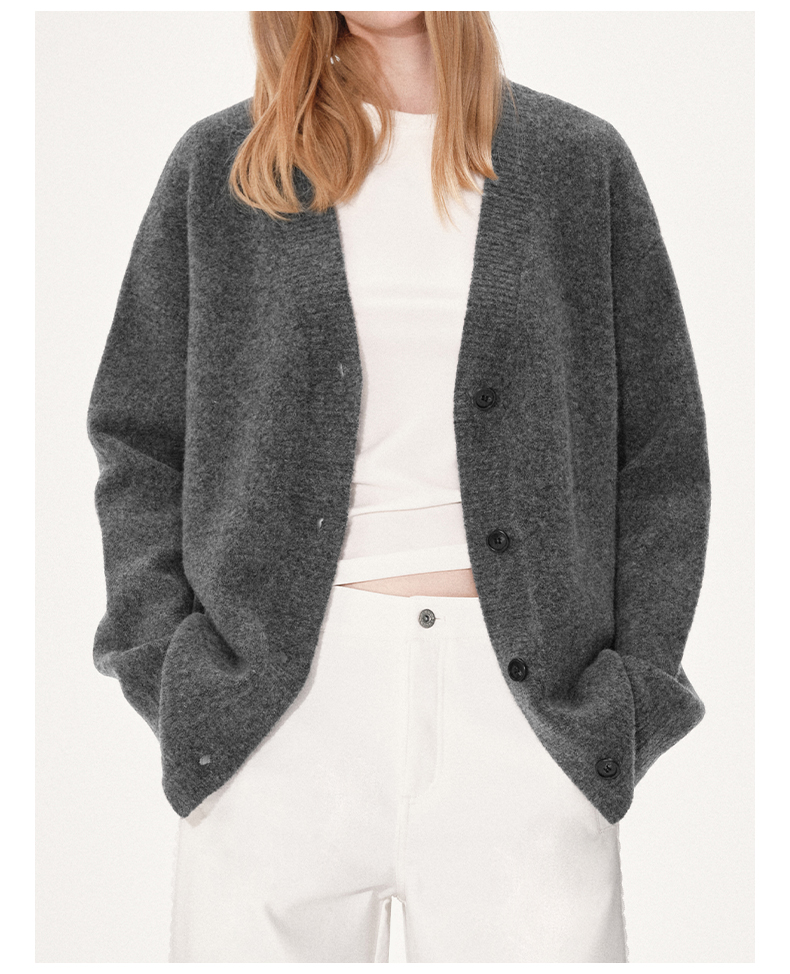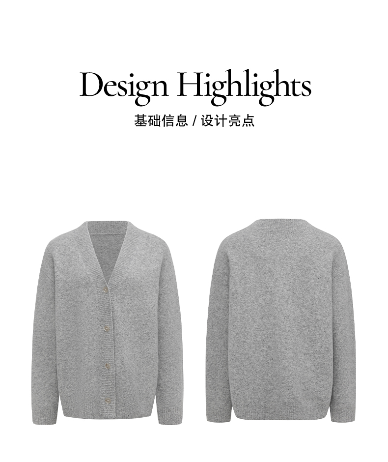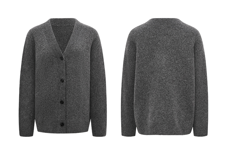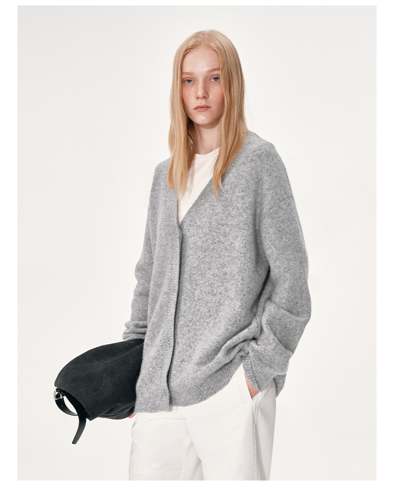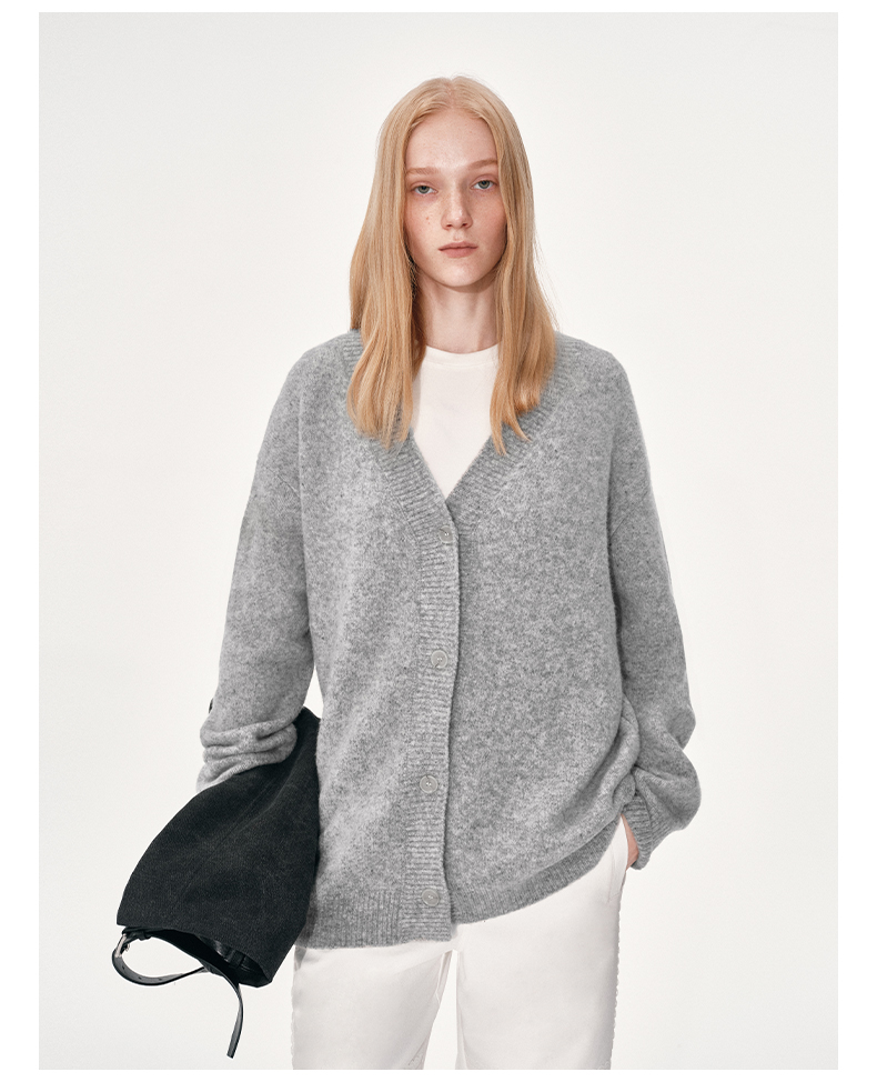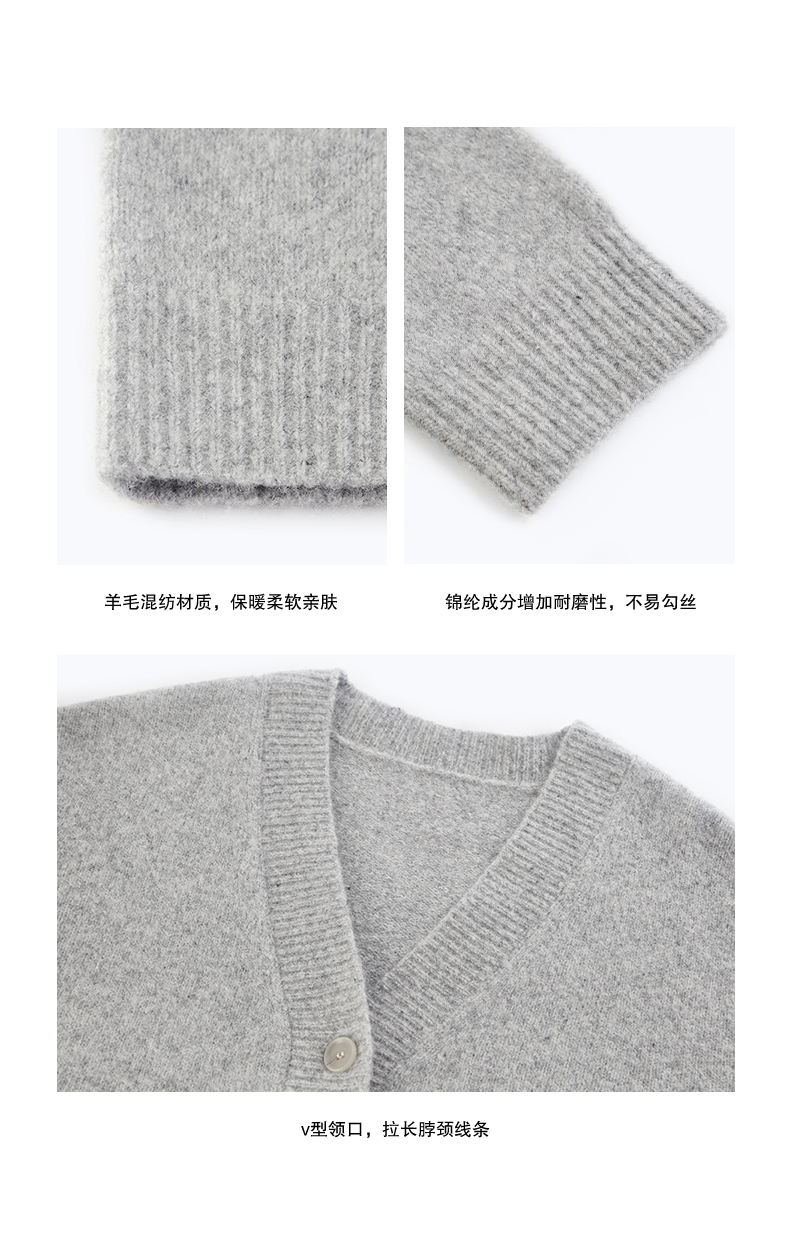 NUTH 羊毛混纺V领宽松保暖中长款毛衣针织开衫女 浅灰色/深灰色