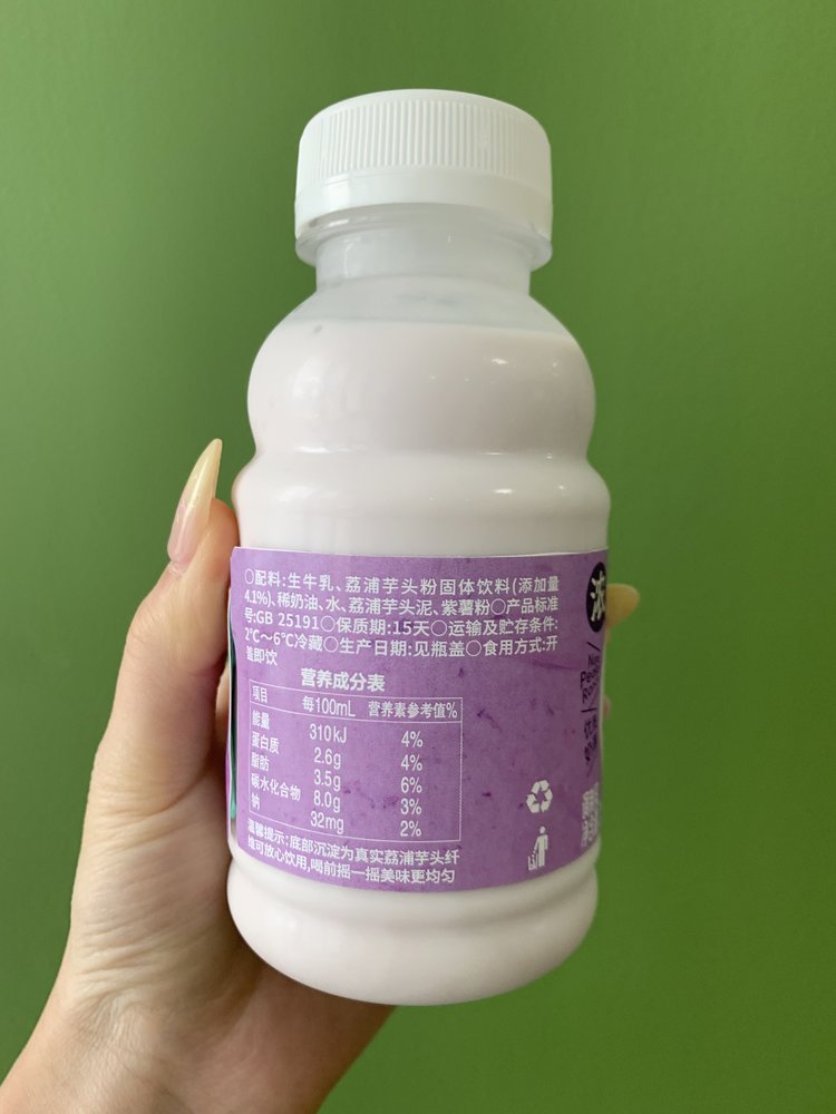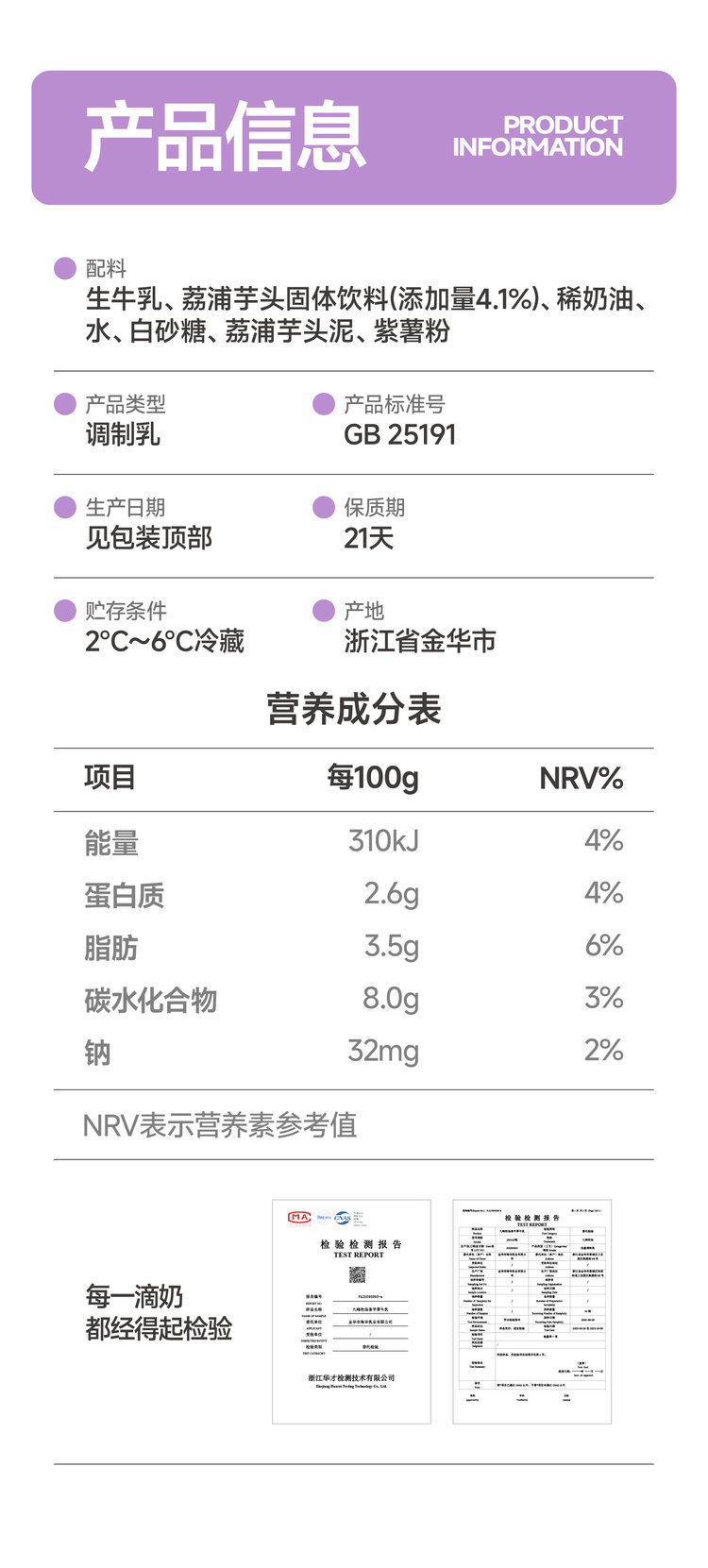 香芋厚牛乳:生牛乳、荔浦芋头粉固体饮料(添加量4.1%)、稀奶油、水、荔浦芋头泥、紫薯粉;