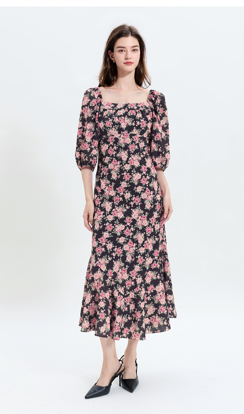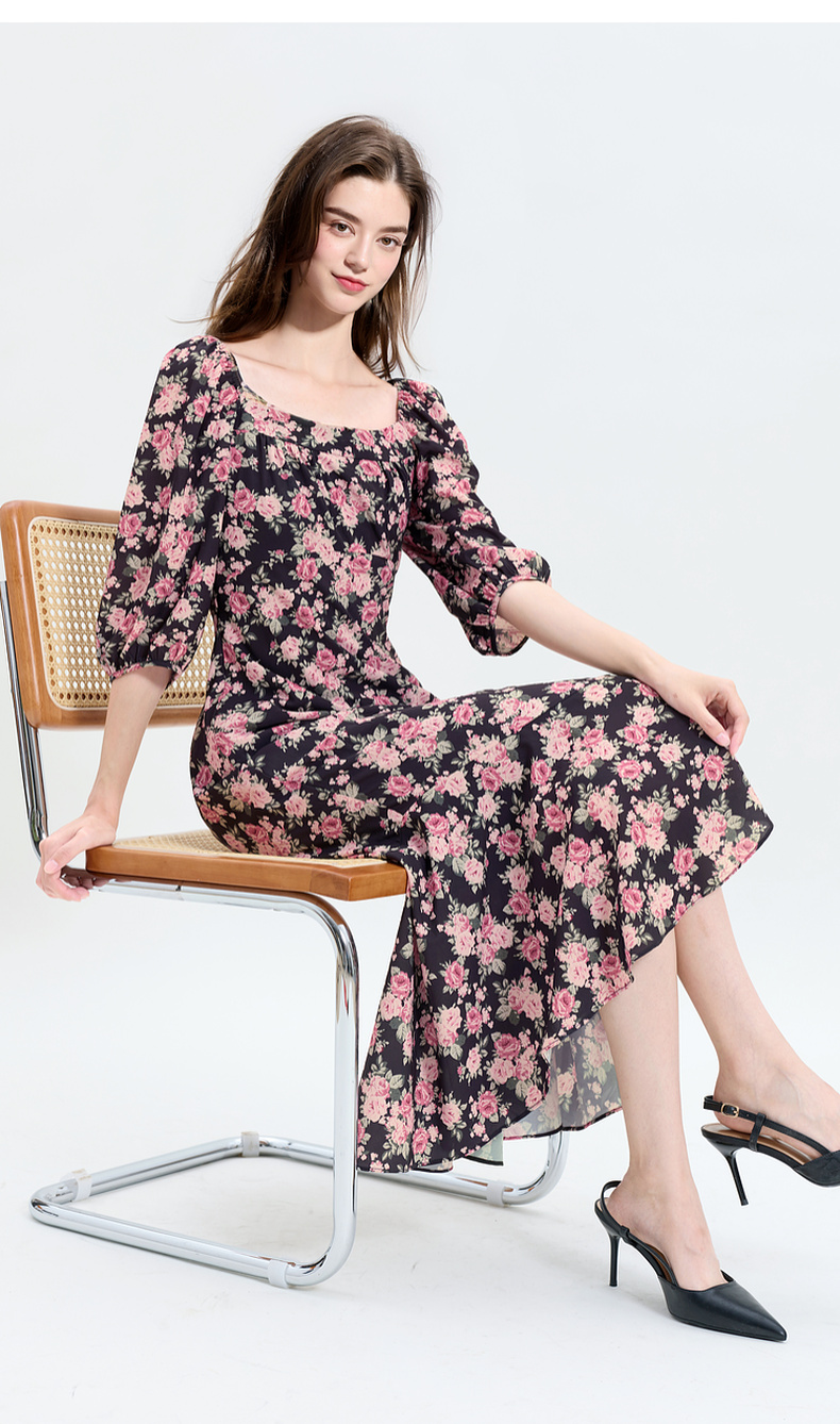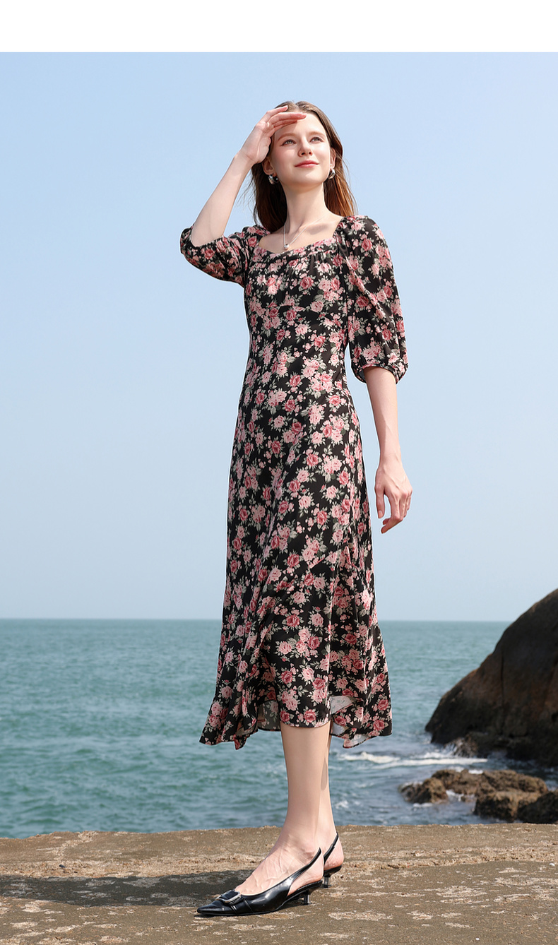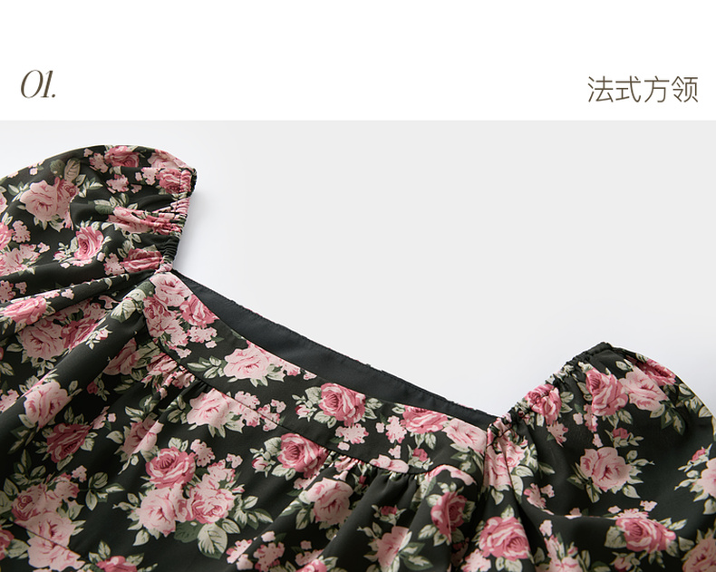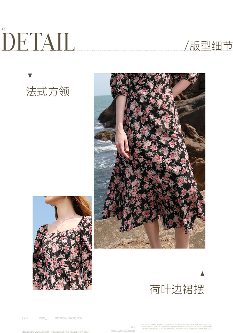 三彩2025秋季新款法式方领连衣裙碎花雪纺裙荷叶边A字长裙M