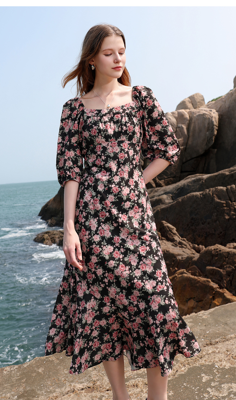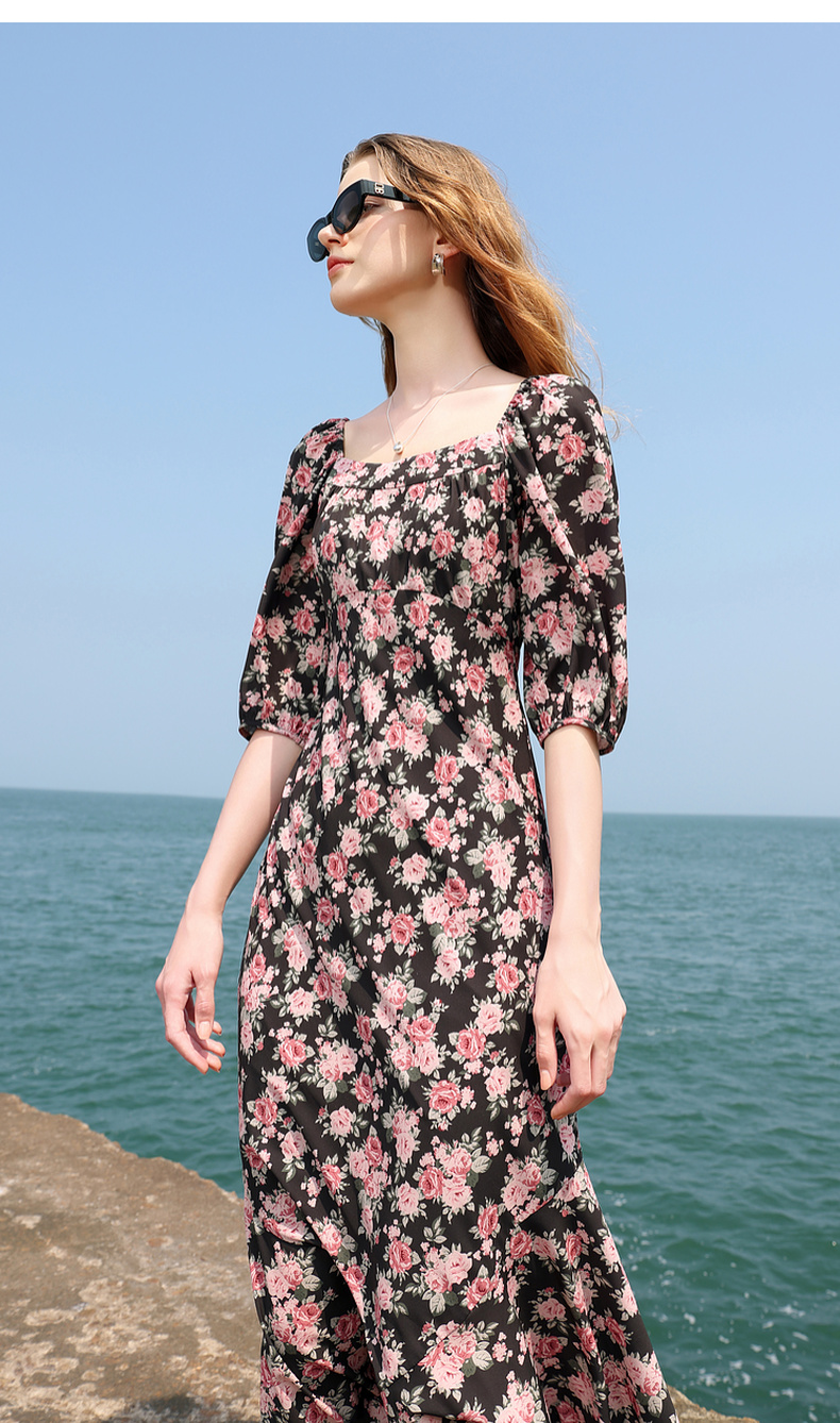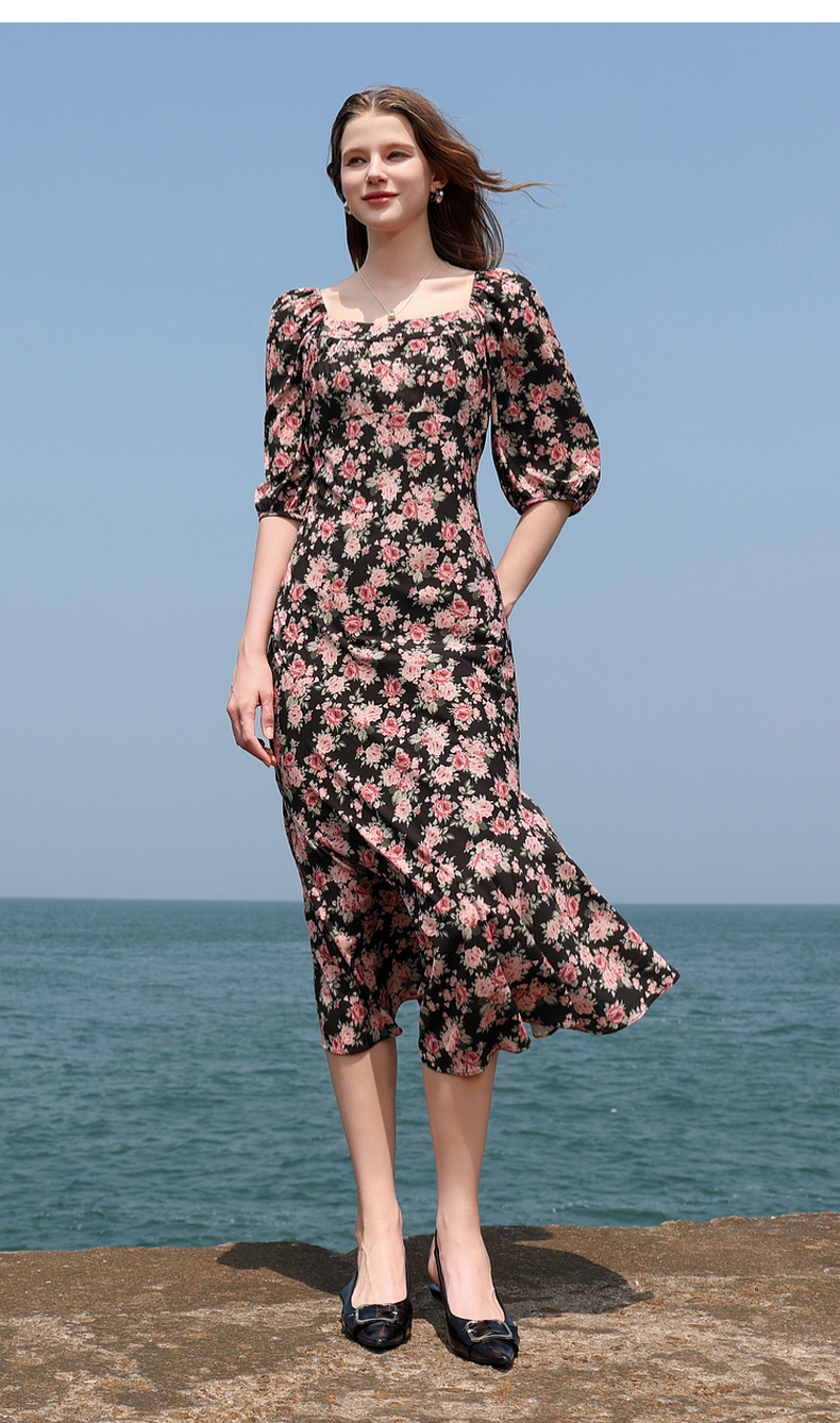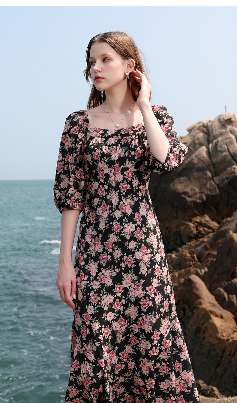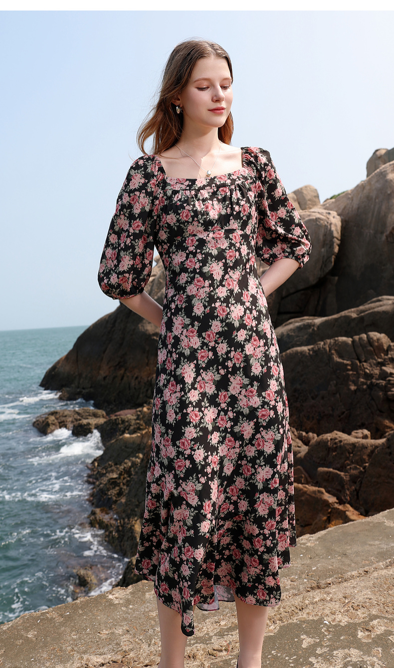 三彩2025秋季新款法式方领连衣裙碎花雪纺裙荷叶边A字长裙M