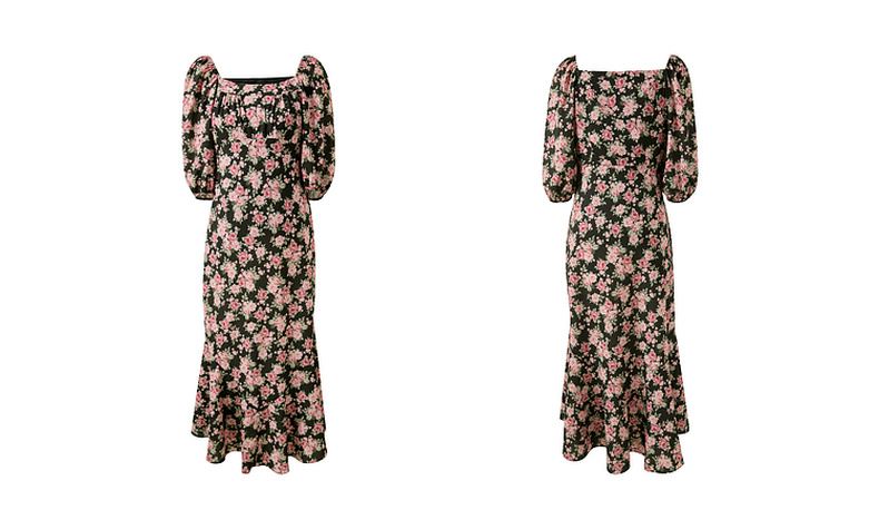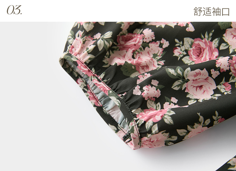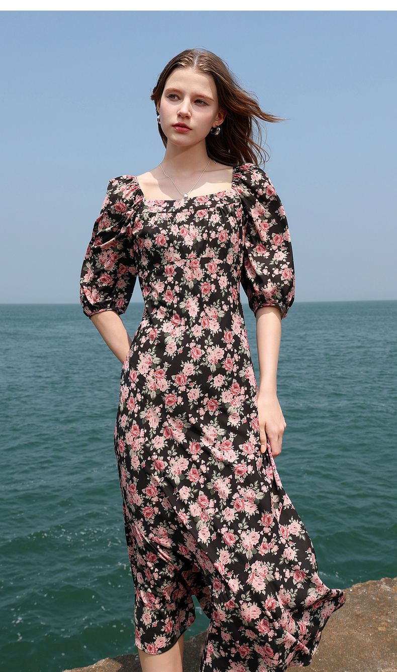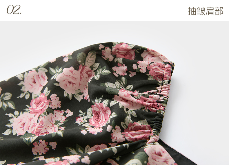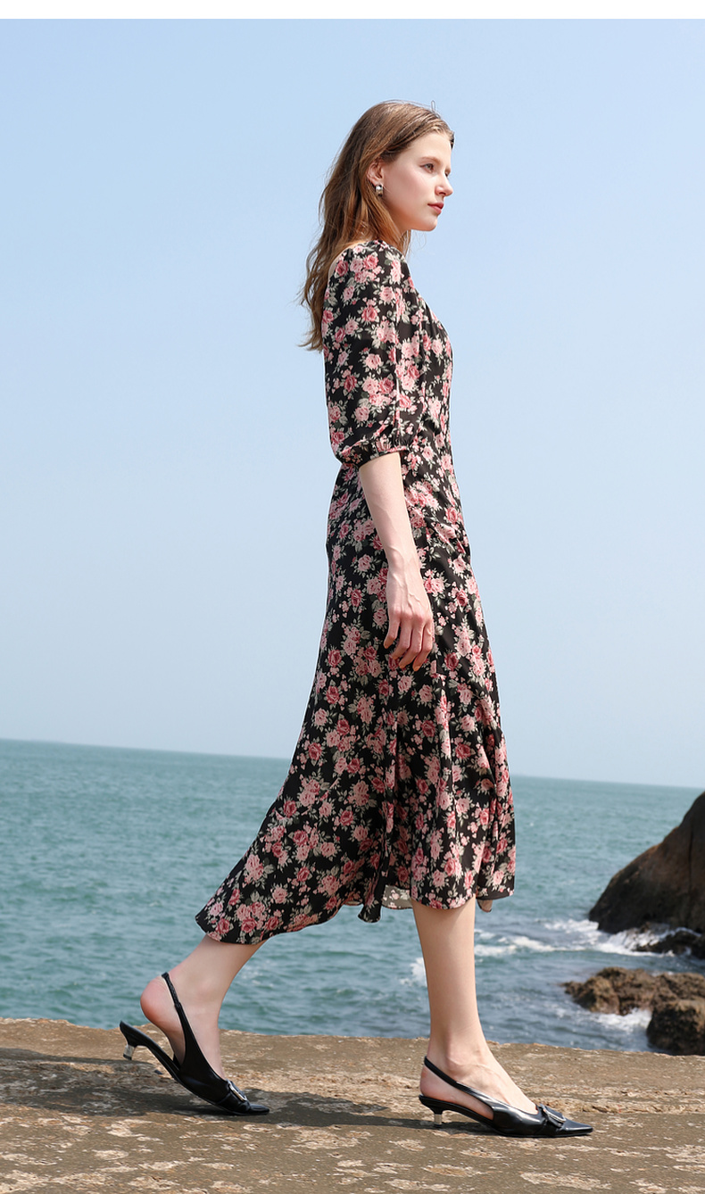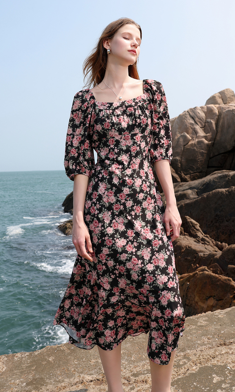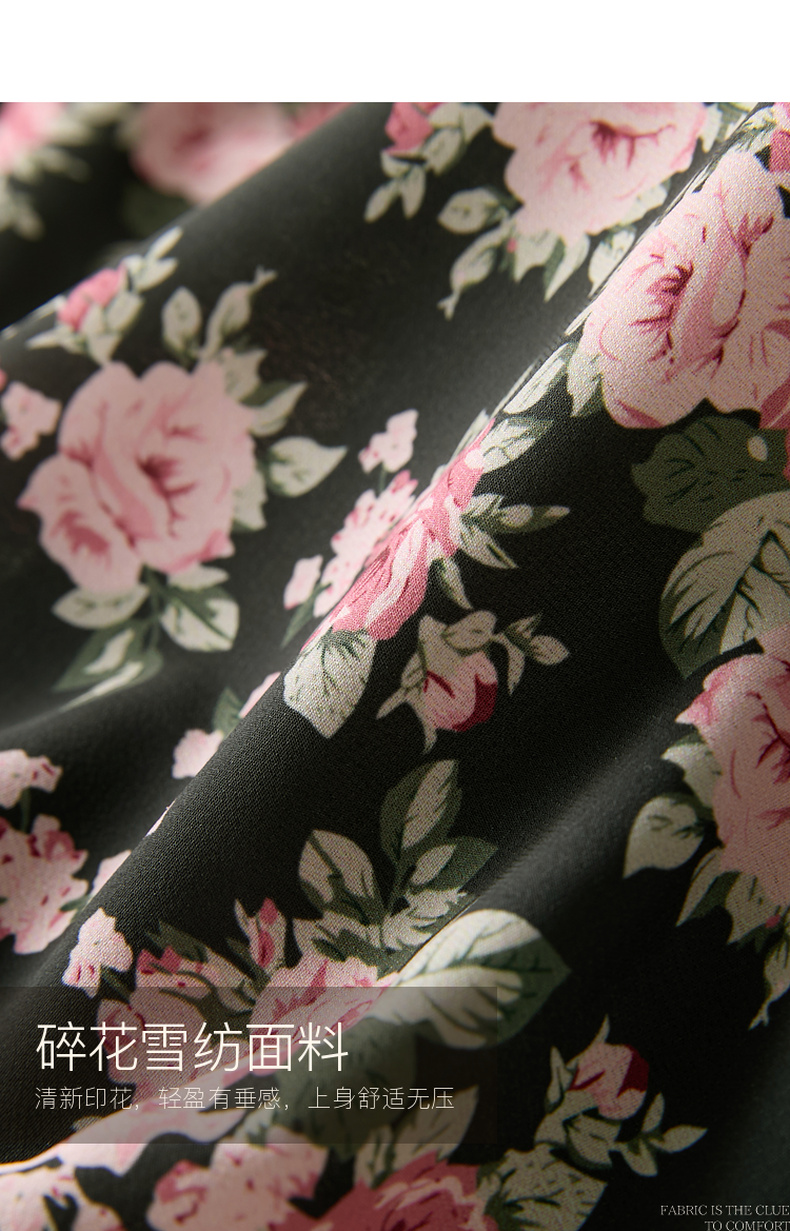 三彩2025秋季新款法式方领连衣裙碎花雪纺裙荷叶边A字长裙M